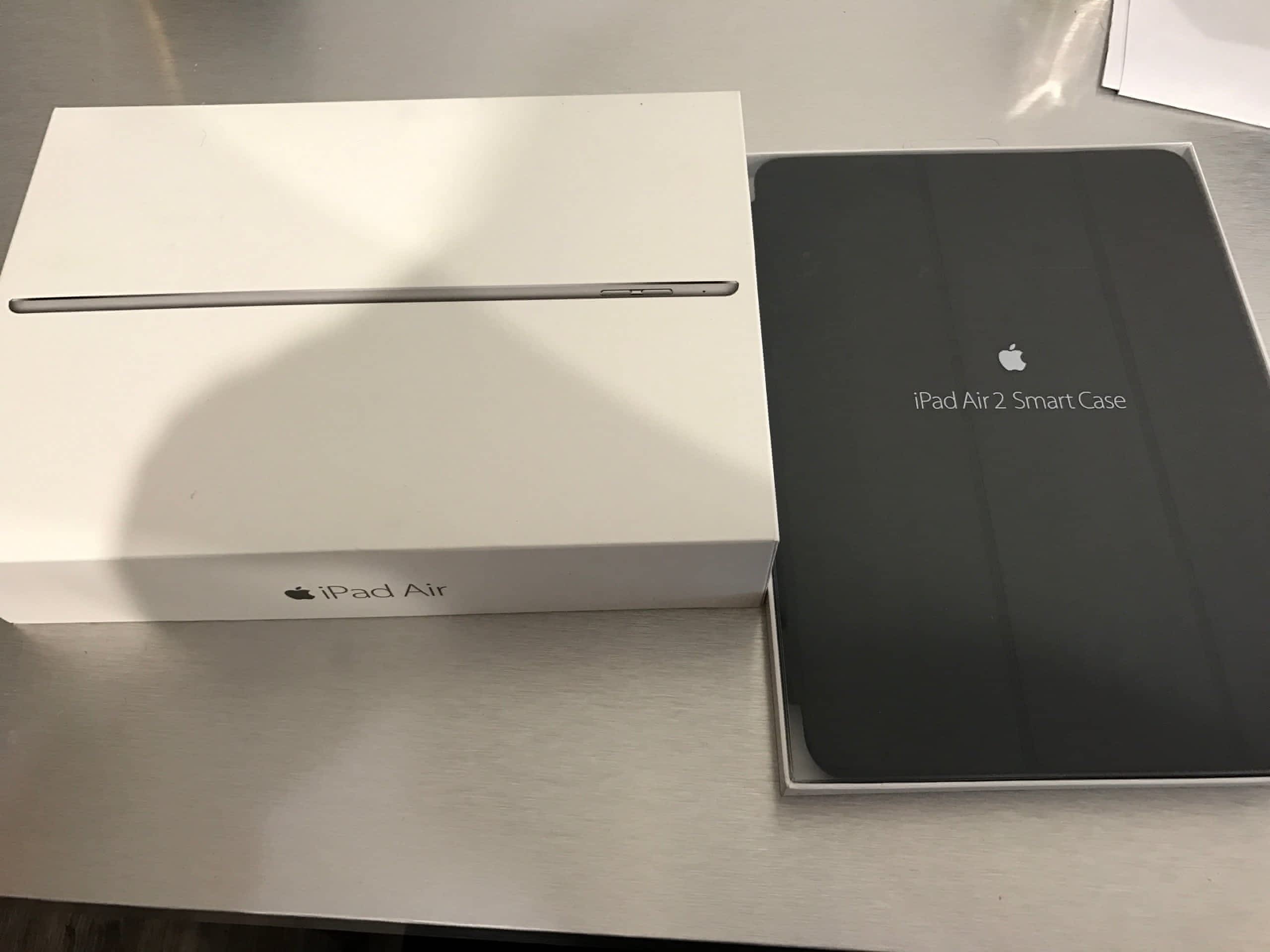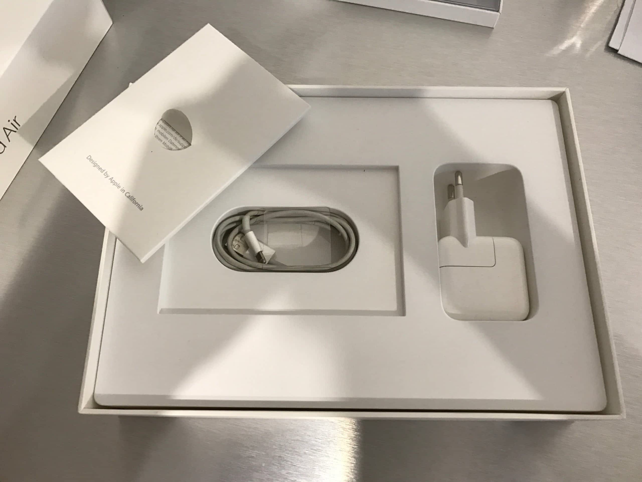 Součástí balení je tablet, nabíječka, kabel, krabice, záruční list a kožený obal Apple.