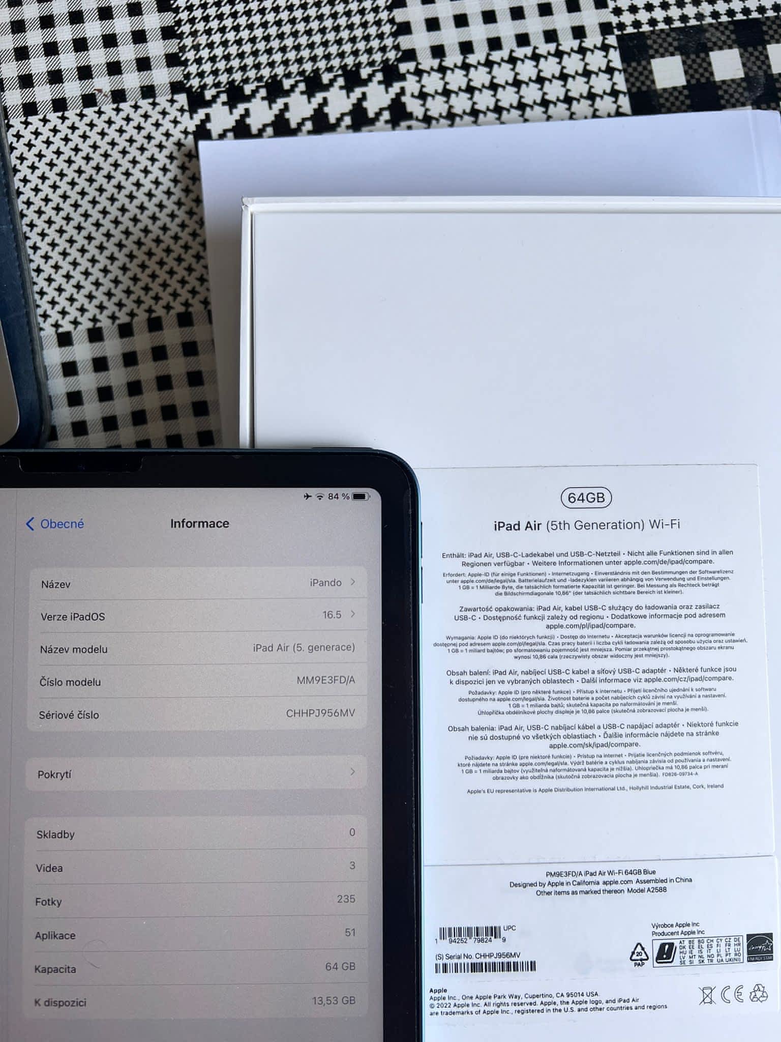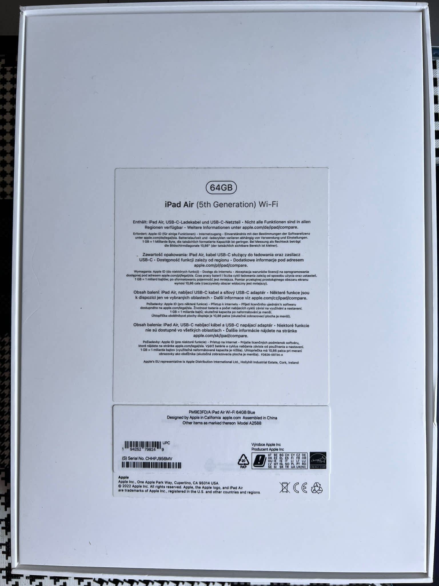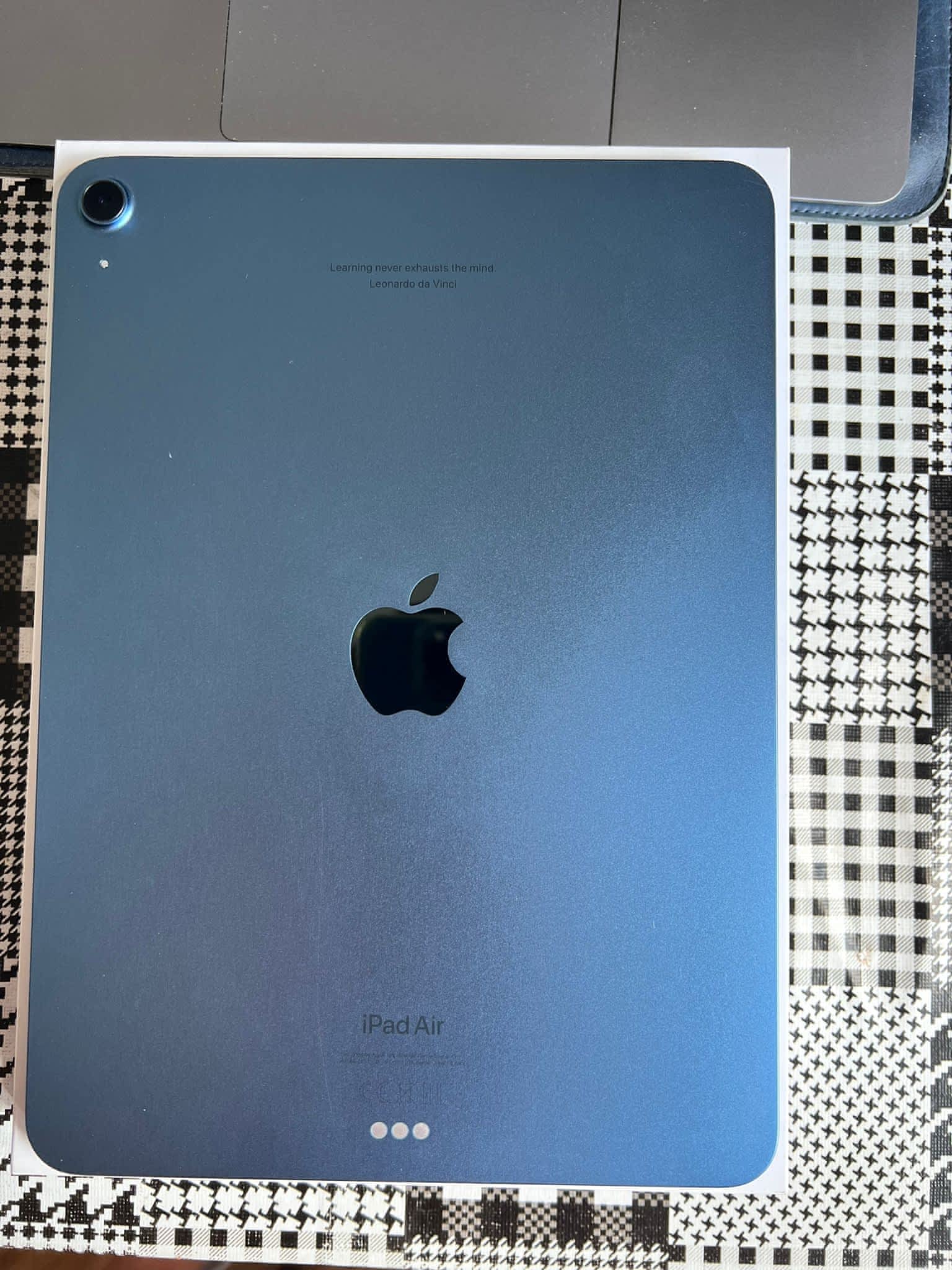 Prodám iPad Air (5th gen) z roku 2022 v modré barvě ve verzi Wi-Fi se 64 GB úložiště. iPad obsahuje gravírování na zadní straně (viz foto). Tablet byl zakoupen v říjnu 2022 (záruka) z oficiálních stránek apple a primárně byl používán ke studiu na vysoké škole. Na displeji je paperlike folie aplikovaná po rozbalení.