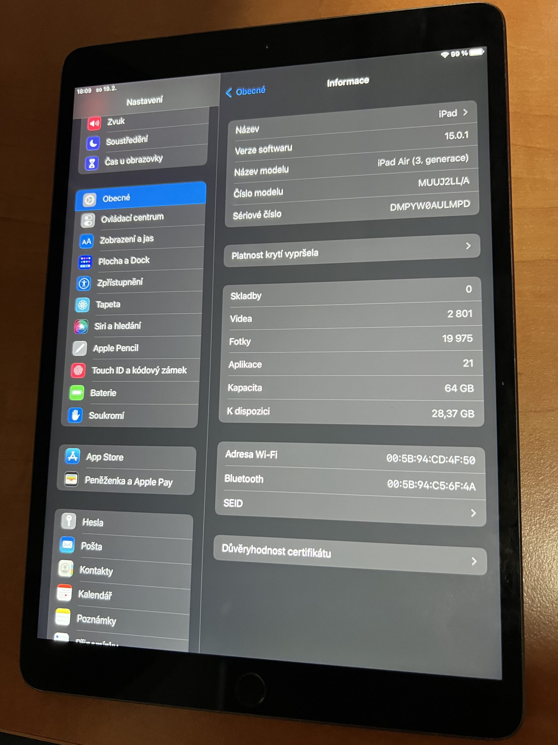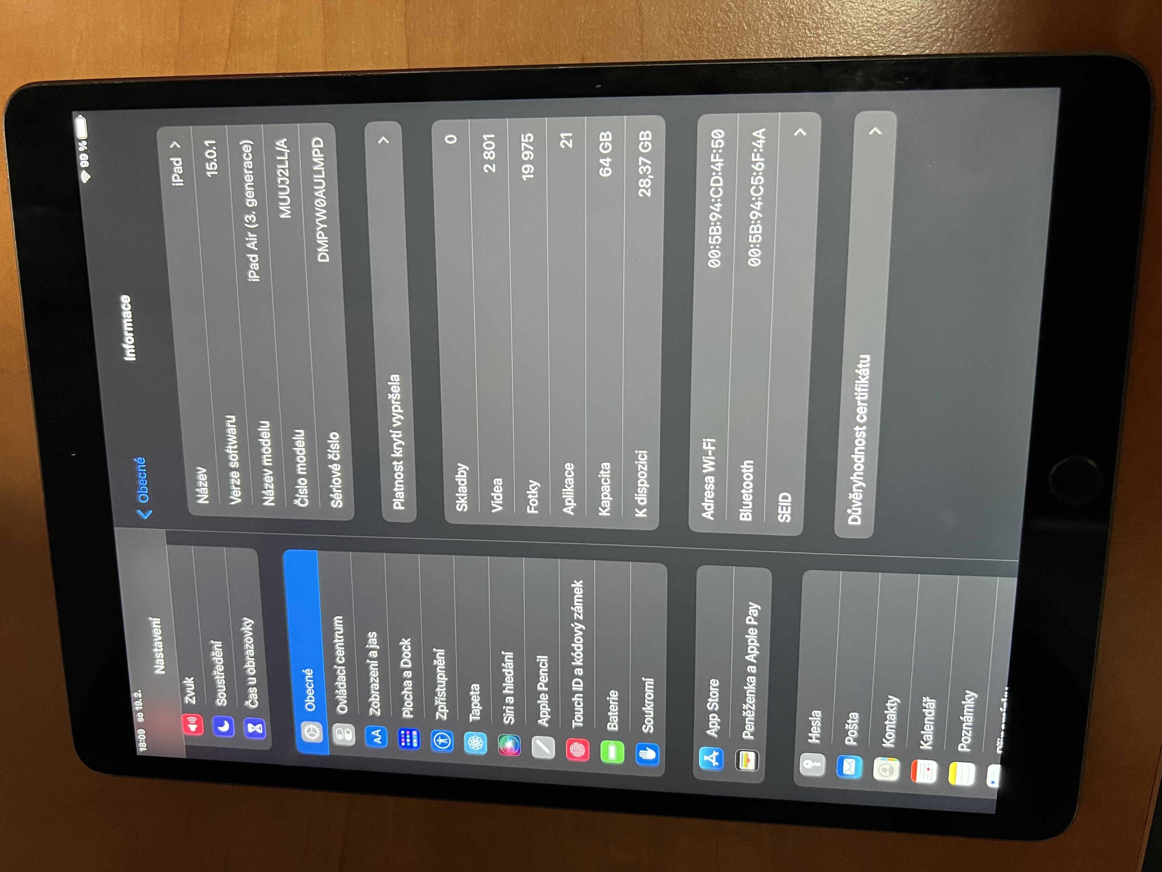 Prodám iPad Air třetí generace z konce roku 2019. Jeví drobné známky používání úměrné stáří. Je v dobrém stavu, baterie drží. iPad prodávám z důvodu nevyužití. Beru ho do ruky jednou za dva týdny na Netflix a tudíž pro mě ztrácí smysl. Nainstalovaný nový iPadOS 15