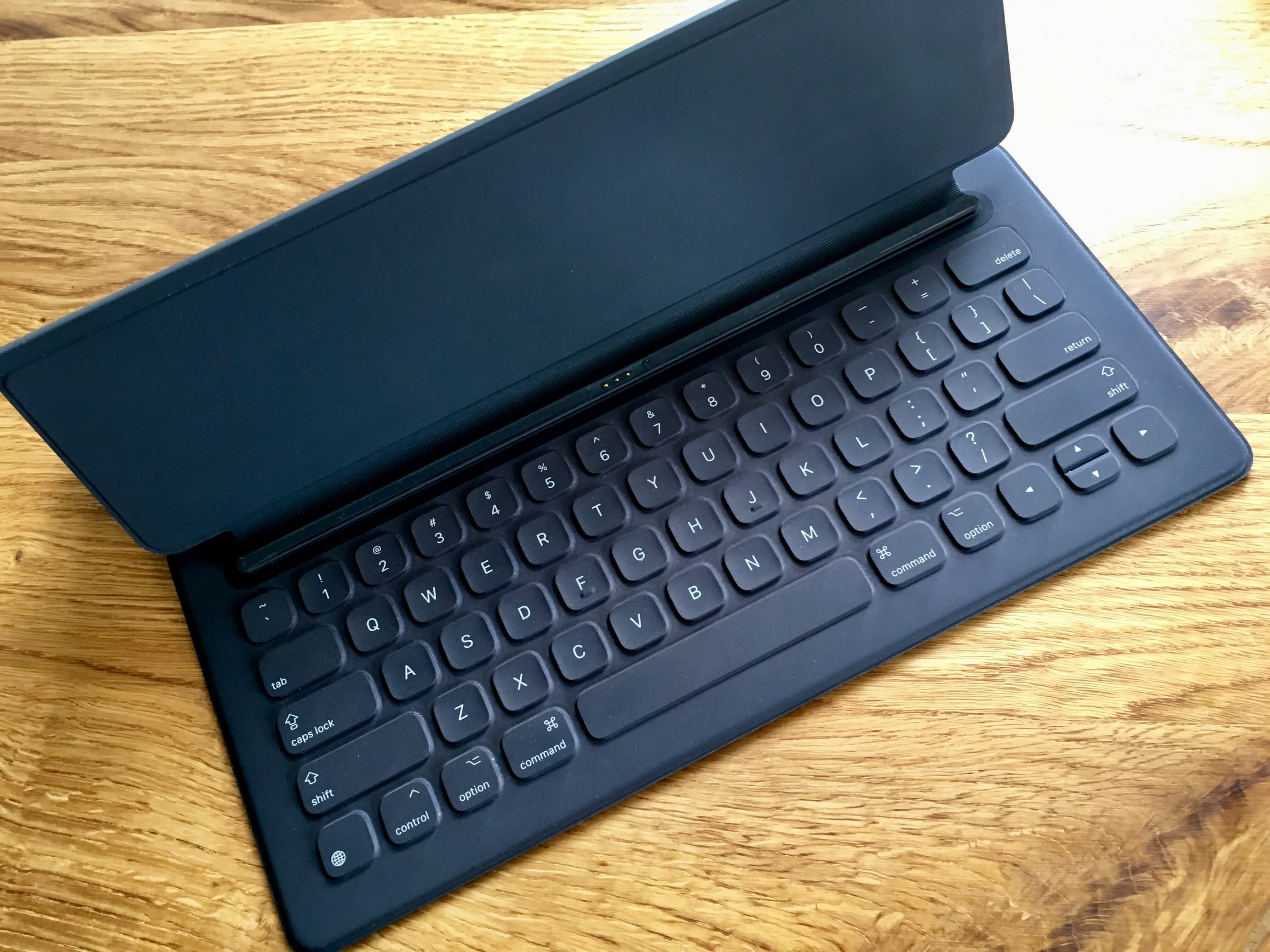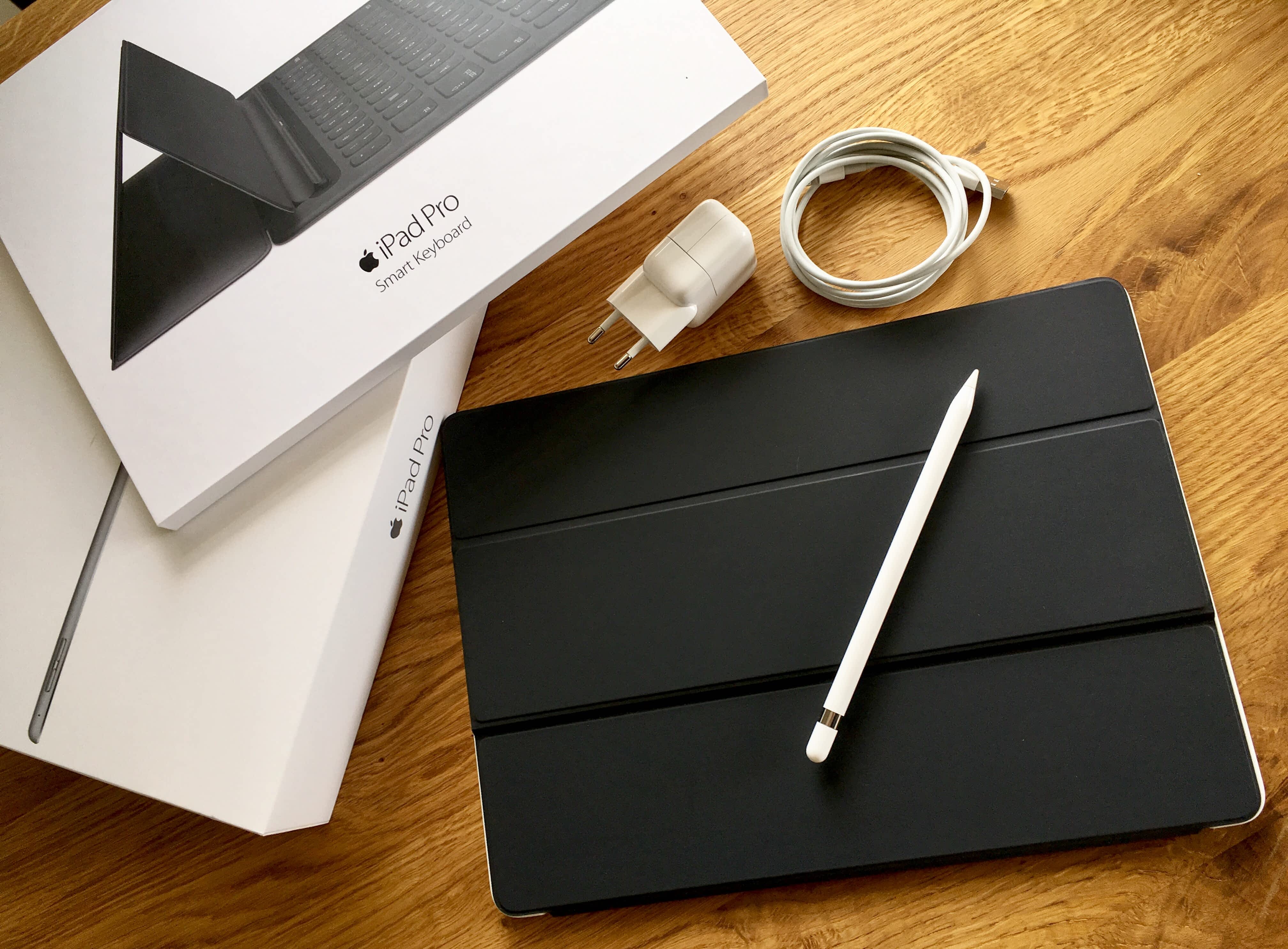 Součástí balení je anglická Apple Smart Keyboard a Apple Pencil a zadní Apple Silicon Case White.