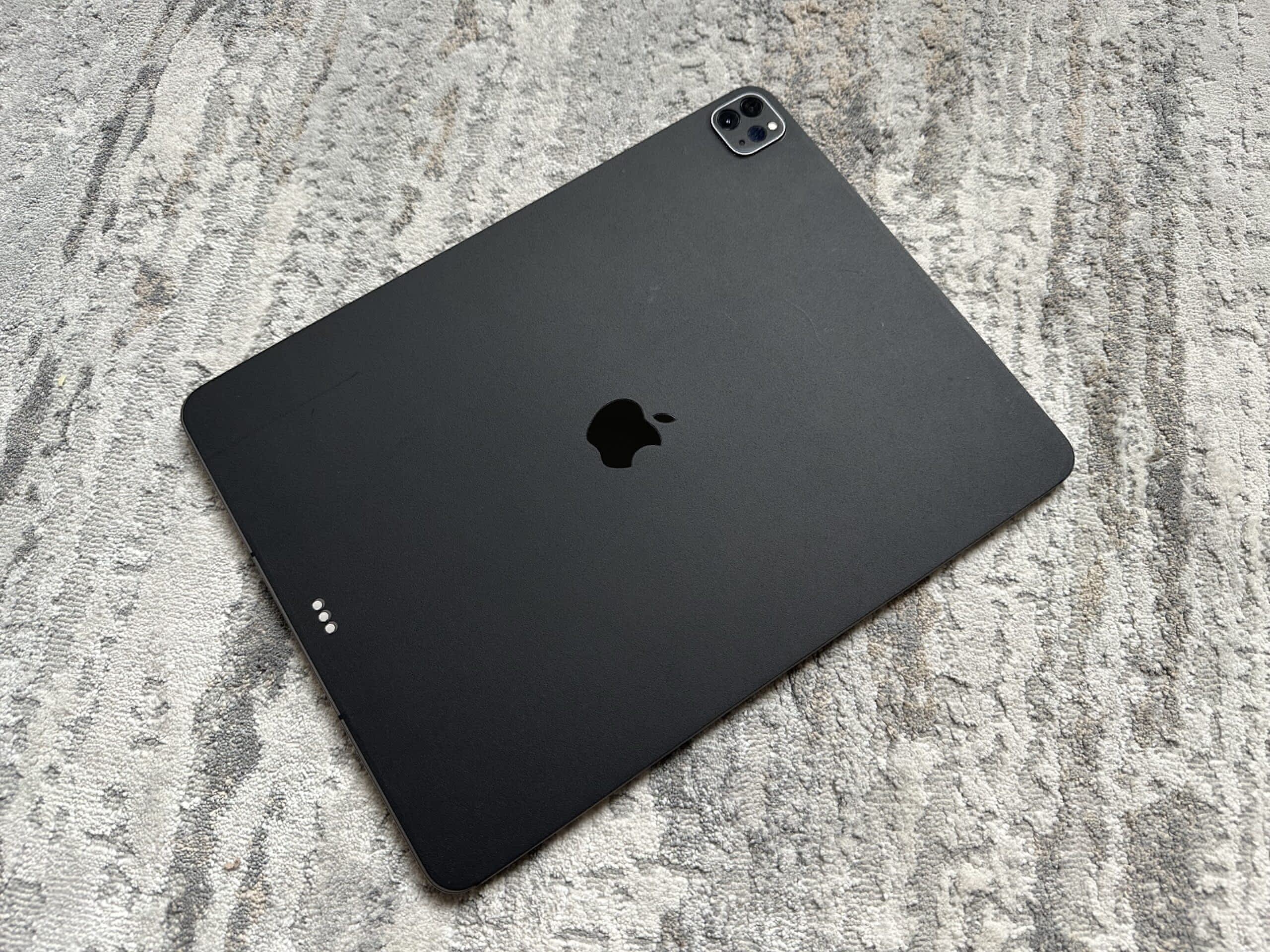 Na zadní straně iPadu a kolem kamer je od prvního dne nalepený černý matný skin od dBrand. iPad je v 99% stavu – několik jemných, krátkých vlásečnic na displeji.