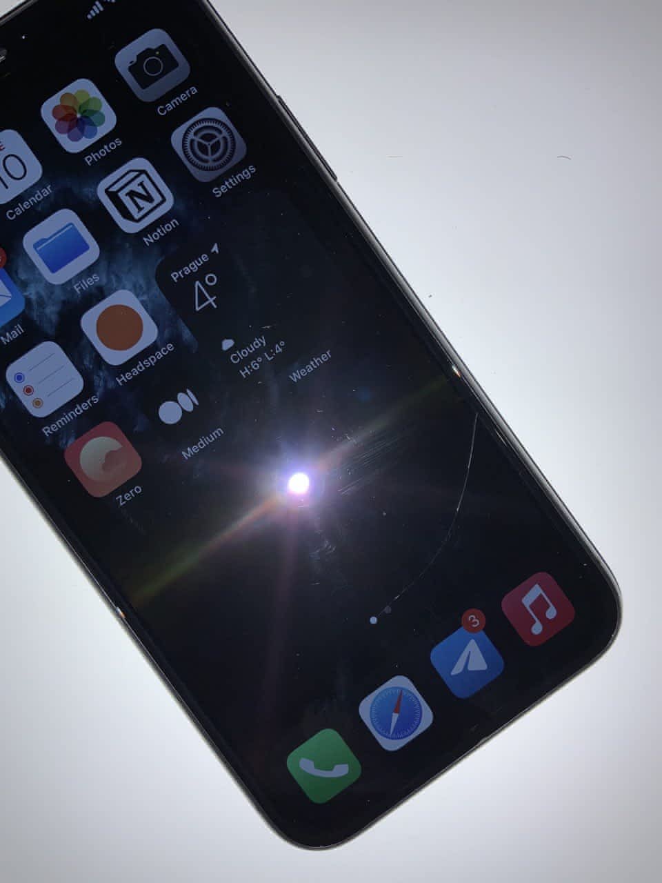 iPhone je komplet s příslušenstvím. Má však jednu nemilou estetickou vadu, jak je na fotkách vidět, je na displeji viditelný škrábanec, způsobeným položením telefonu na stůl na kterém byl kousek písku. Nepůsobí žádné problémy při používání, také to rozhodně není prasklina, jen hlubší škrábanec – doporučuji osobní převzetí (praha). Dávám kvůli tomu na telefon slevu oproti standardním nabídkám. Jinak je telefon ve velmi dobrém stavu.