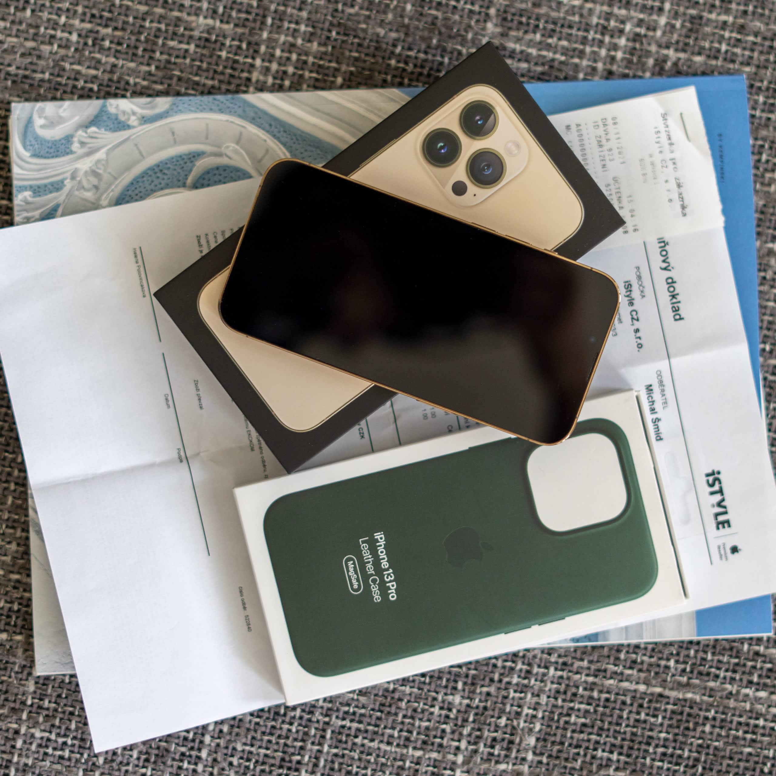 Prodám iPhone 13 Pro 256 GB GOLD. Originál krabice, zelený kožený obal. Žádné škrábance.