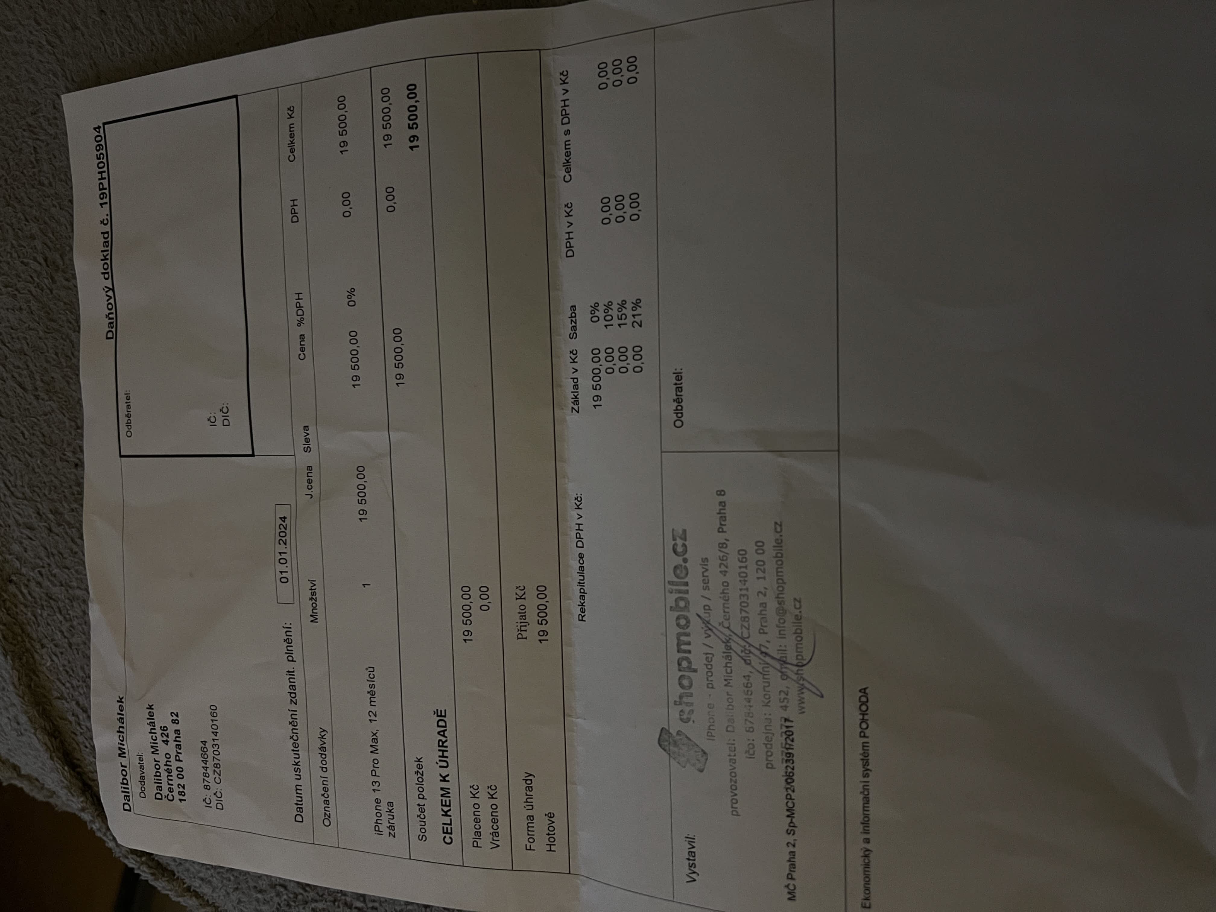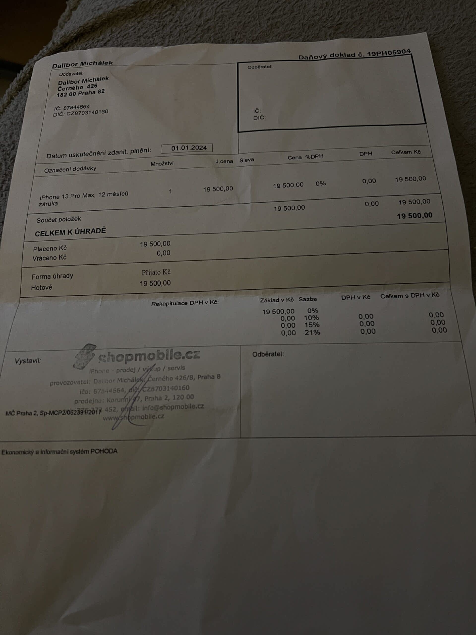 Dobrý den. Ráda bych poslala dál iphone 13 pro max v šedé barvě. Zakoupen 1.1 2024 jako použitý v kategorii A za 19.500Kč Doložím fakturu. Na telefon se stále vztahuje záruka platná do 1.1 2025. Telefon je plně funkční. Baterie 85%. Tělo telefonu bez vad, oděrek a obouchání. Displej má nalepené ochranné sklo a jeví klasické známky použití (vlásečnicové rýhy) Nic hrozného. Při rozsvíceném displeji jsou nepatrné. Čočky fotoaparátu jsou nepoškozeny. ID funkční. Telefon před prodejem samozřejmě odhlásím. Důvod prodeje je ten, že na mojí malou ruku je telefon prostě moc veliký a nezvykla jsem si. V případě zájmu, prosím pište na email a určitě preferuji osobní předání na Praze 8. Děkuji