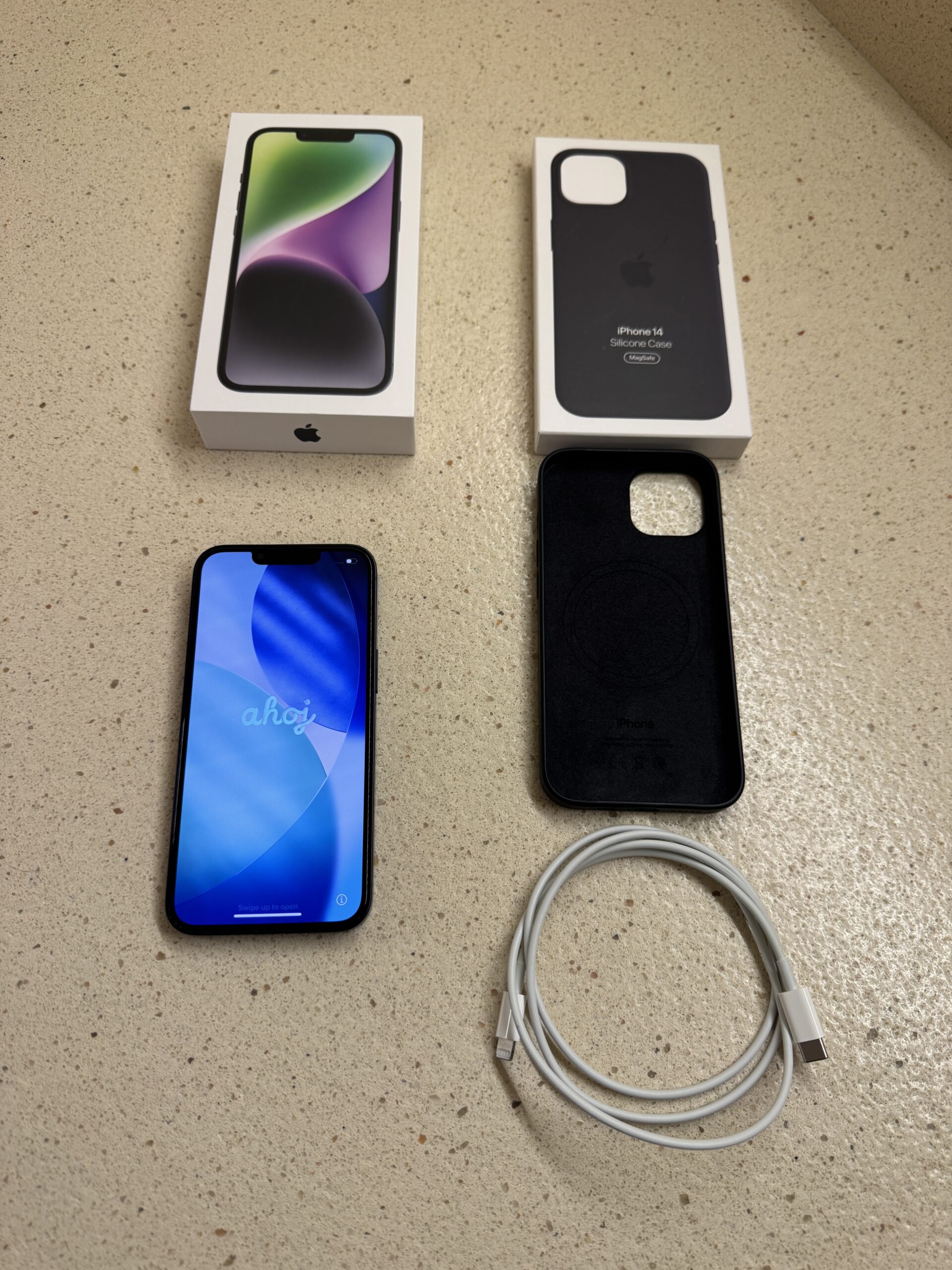 Prodám iPhone 14 128 Gb v černé barvě, zakoupen 5/2023 u autorizovaného prodejce. Stav baterie je 95% Telefon byl málo využíván a je ve výborném stavu. Nenese žádné vady, poškození a ani drobné oděrky. Telefon byl od začátku opatřen originálním silikonovým obalem od Applu, na display nalepené ochranné sklo Anti Blue light Glass. Ochranný kryt na čočky EPICO LENS. K telefonu je originální krabička a orig. nabíjecí kabel a výše uvedené ochranné prvky.