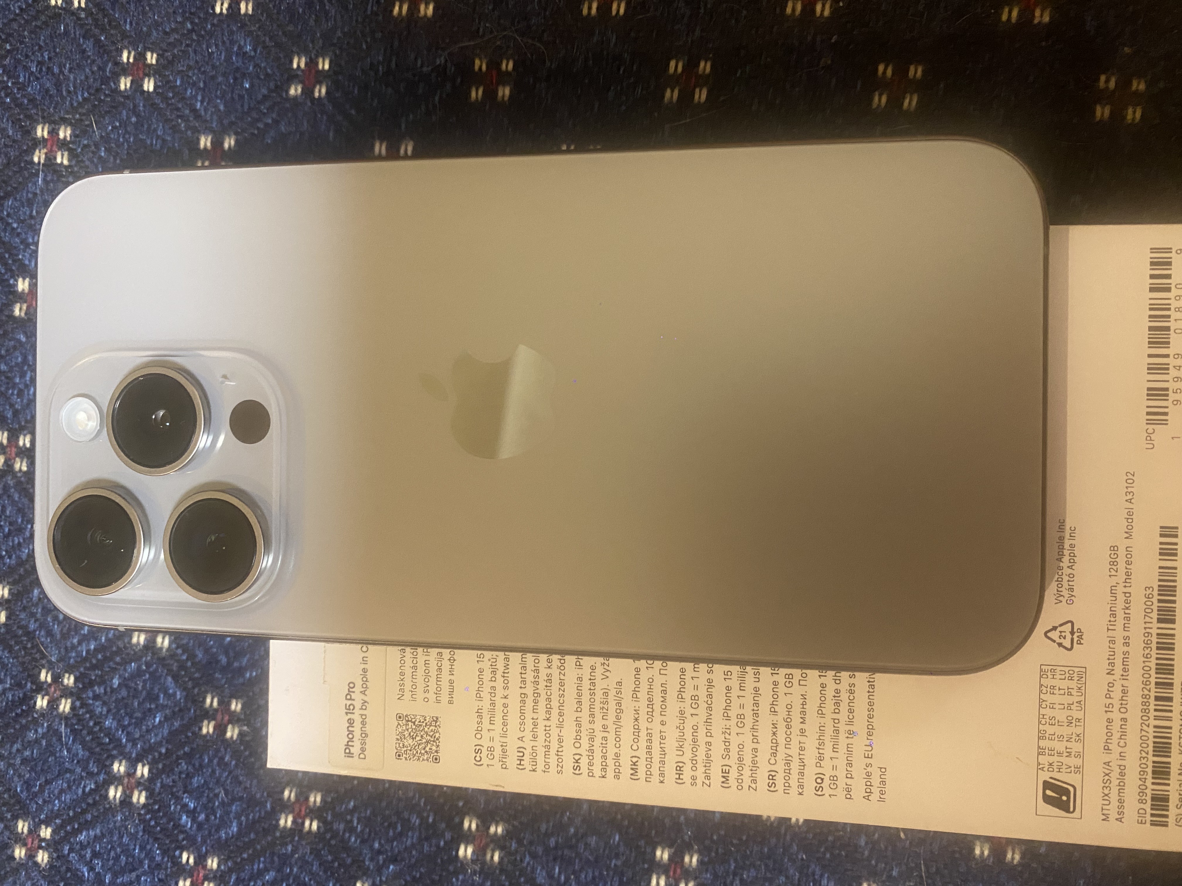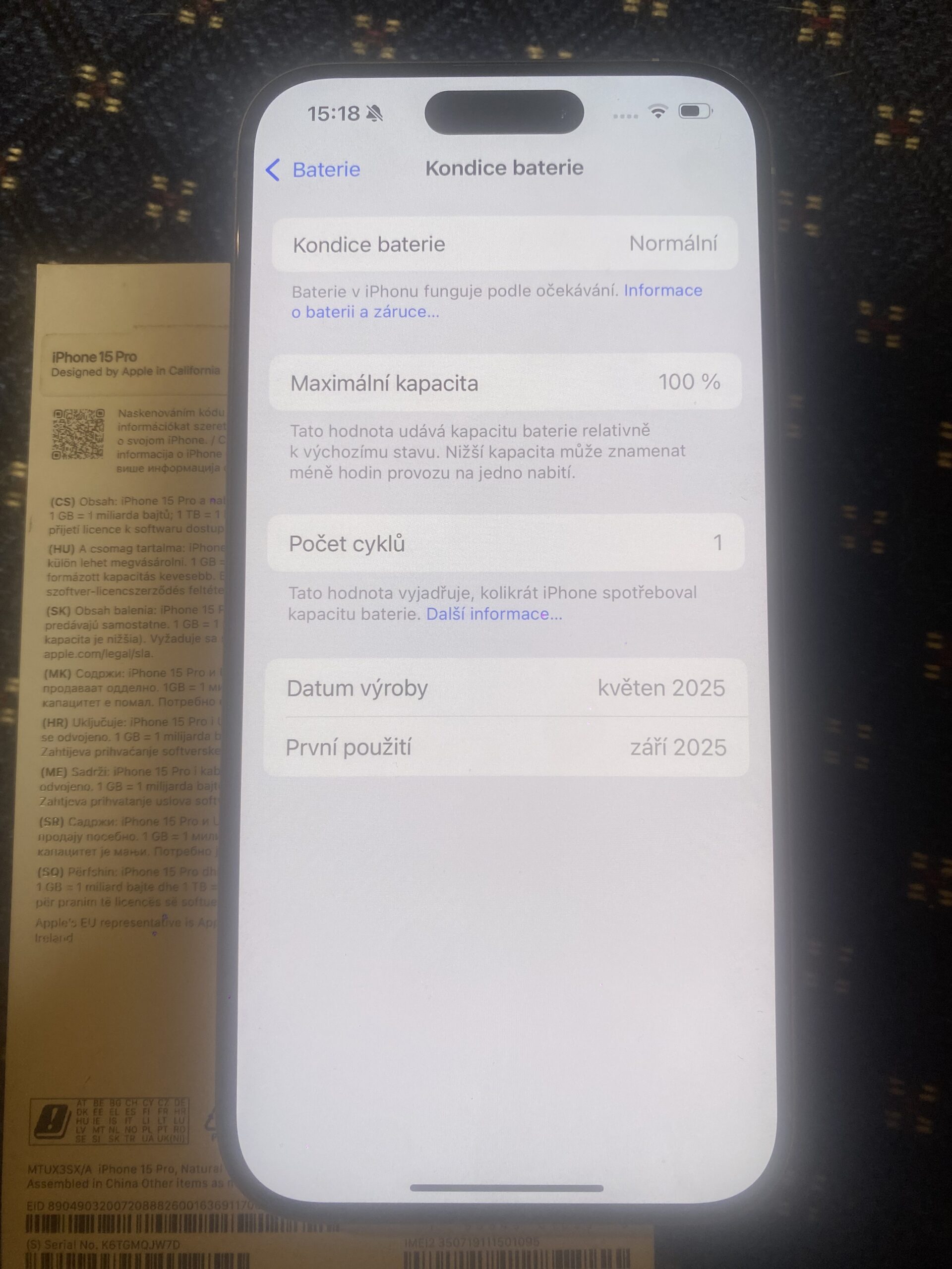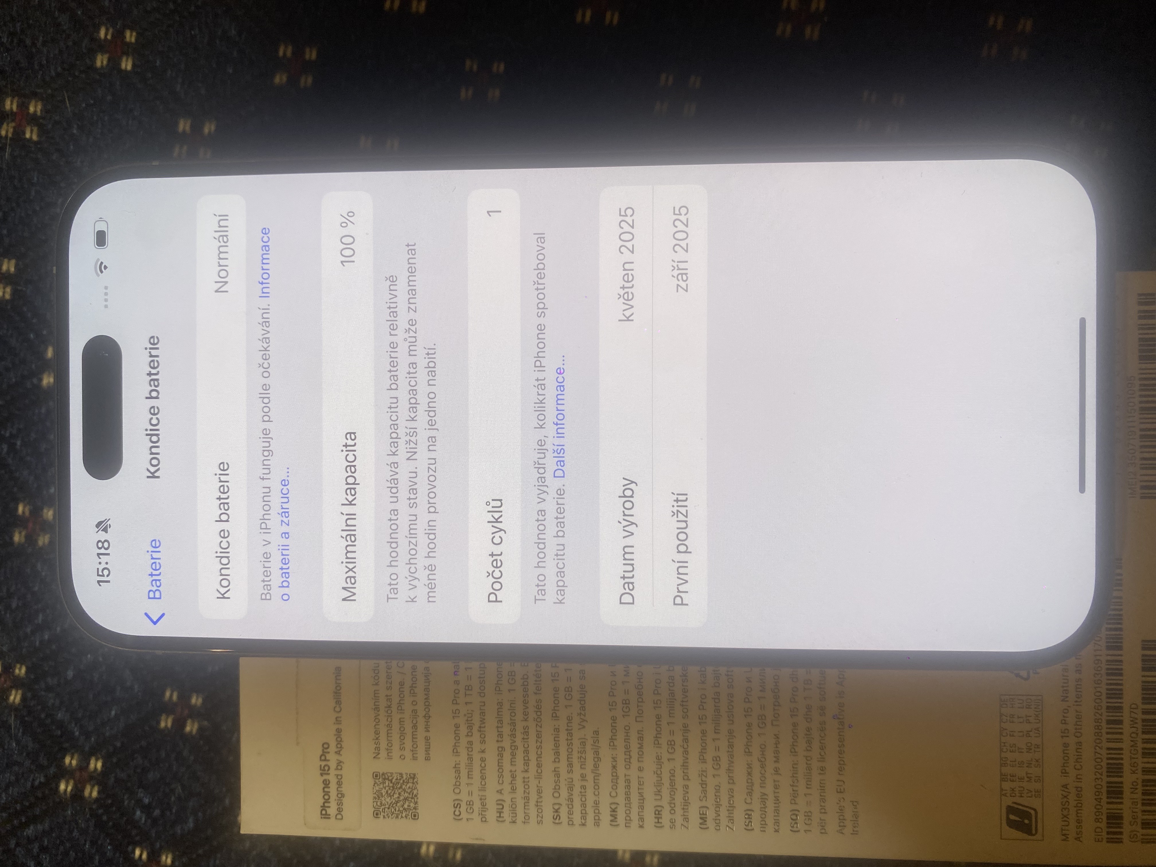 Nabízím k prodeji tento nádherný plně funkční iPhone 15 Pro kapacity úložiště 128 GB krásné přírodně titanové barevné varianty. iPhone byl dodán z reklamace – takže nový, s KONDICÍ BATERIE 100% – jen zapnut a vyzkoušen – momentálně 1 cykl na baterce.