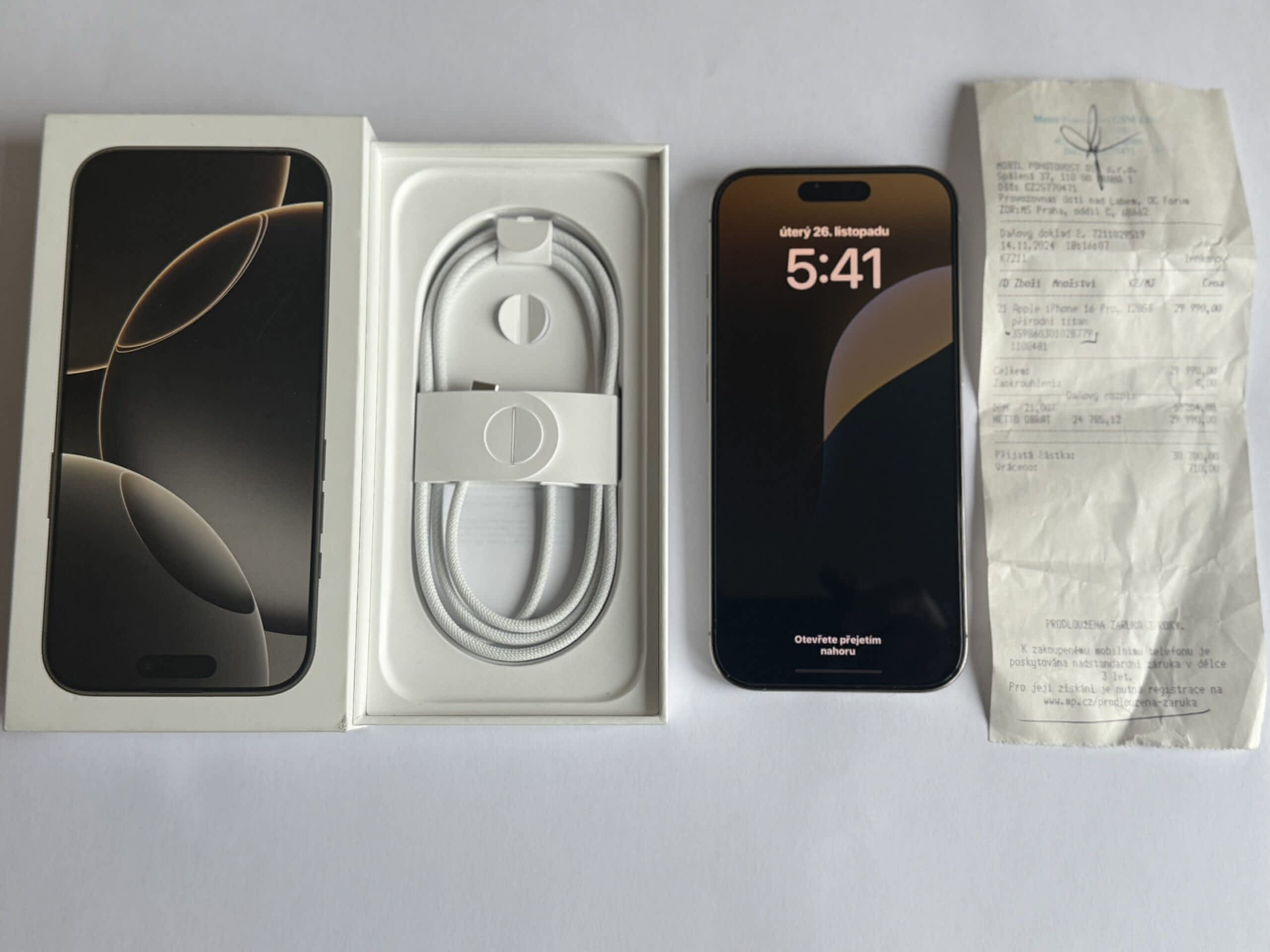 Prodam iPhone 16 pro v šedé titanové barvě s pamětí 128gb.Koupen 14.11.2024 za 29990,- v mp.cz (cz distribuce) se zárukou na 3 roky.Od počátku s ochranným sklem na displeji a čočkách fotoaparátu a nošen v krytu.Top stav jako nový bez viditelných znamek používání,kompletní original baleni s dokladem o koupi s platbou v HOTOVOSTI.