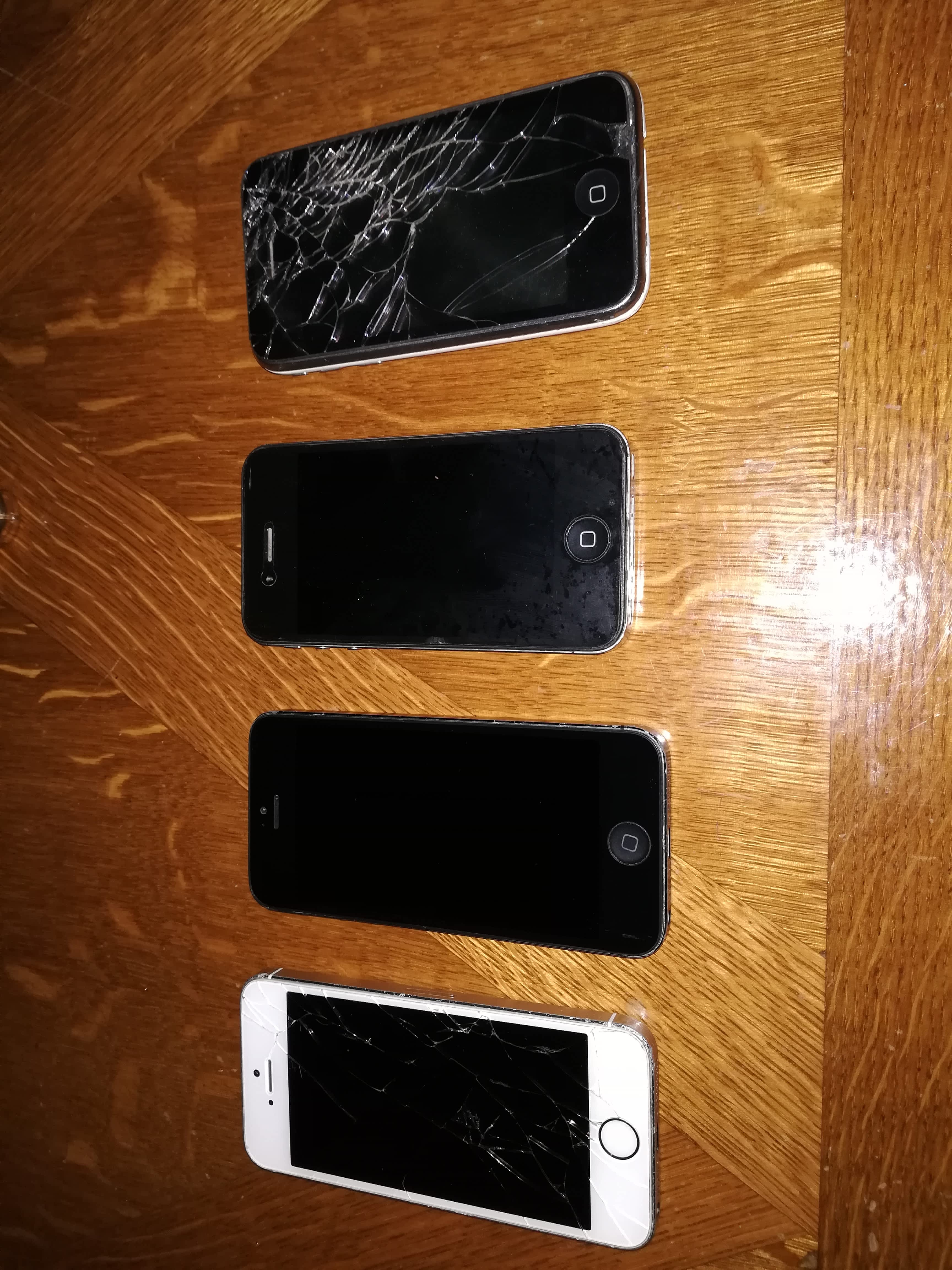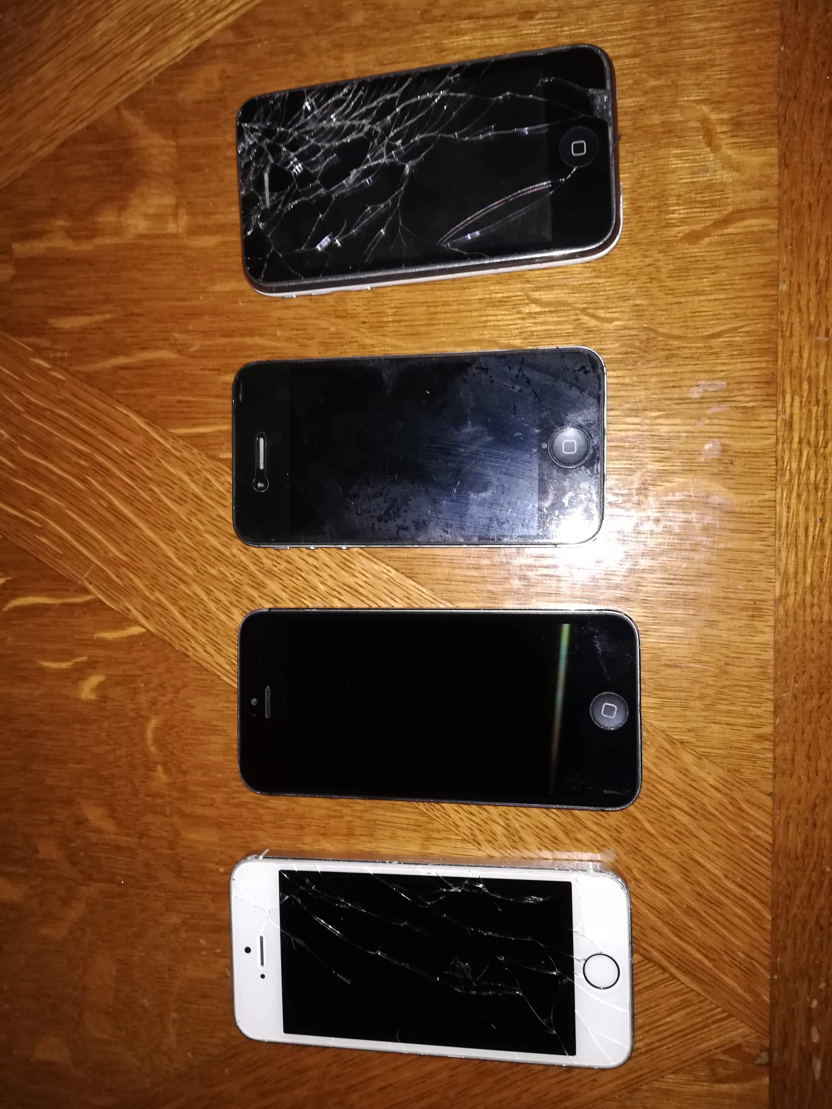 Prodám výše vyjmenované iPhony. Stav dle foto. 3GS by mělo fungovat, ale je špatná baterka a stav nic moc, na 4S nefunguje wifi,jinak funguje, baterka bude taky asi špatná. 5ka je funkční, je na ní nový lcd ale nějak zlobil, jinak plně funkční. Na 5S je rozbitý lcd a home button nefunguje, jinak vše OK. Prodávám pouze všechny najednou. Nemám už pro ně využití a nechci je opravovat. Nabídněte.