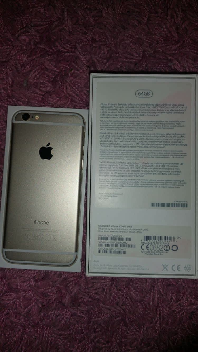Prodám Apple iPhone 6 64GB Gold, originální nabíječka, na displeji tvrzené sklo, rok starý, záruka do 27.11. 2017, po celou dobu nošen s krytem, menší oděrka (viz foto), jinak žádné škrábance, velmi dobrý stav.