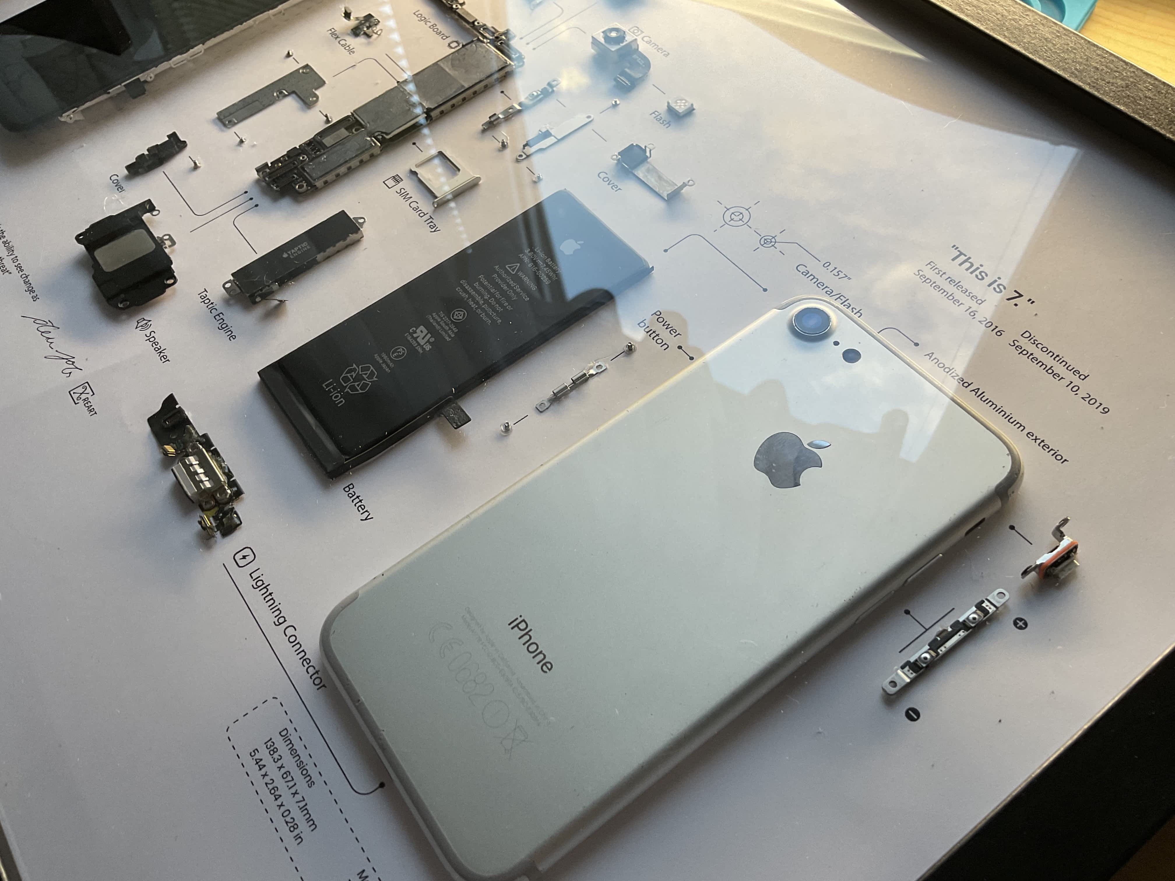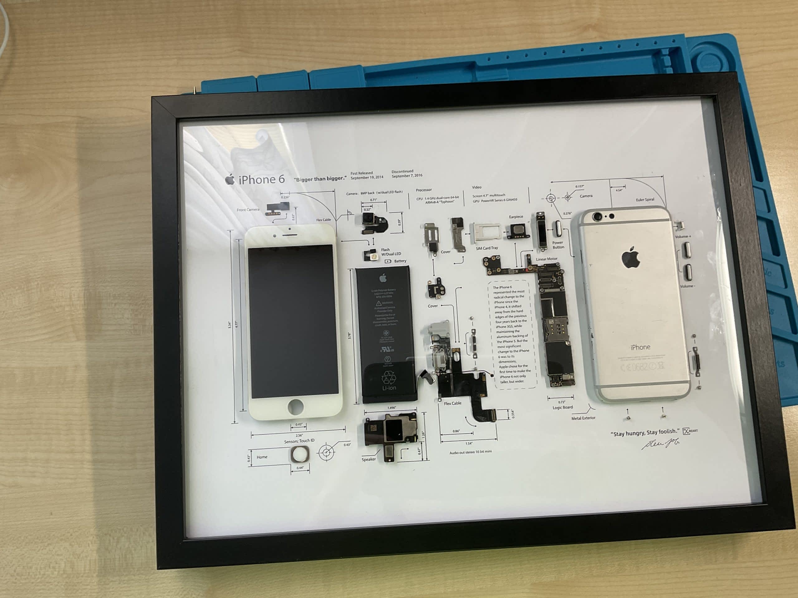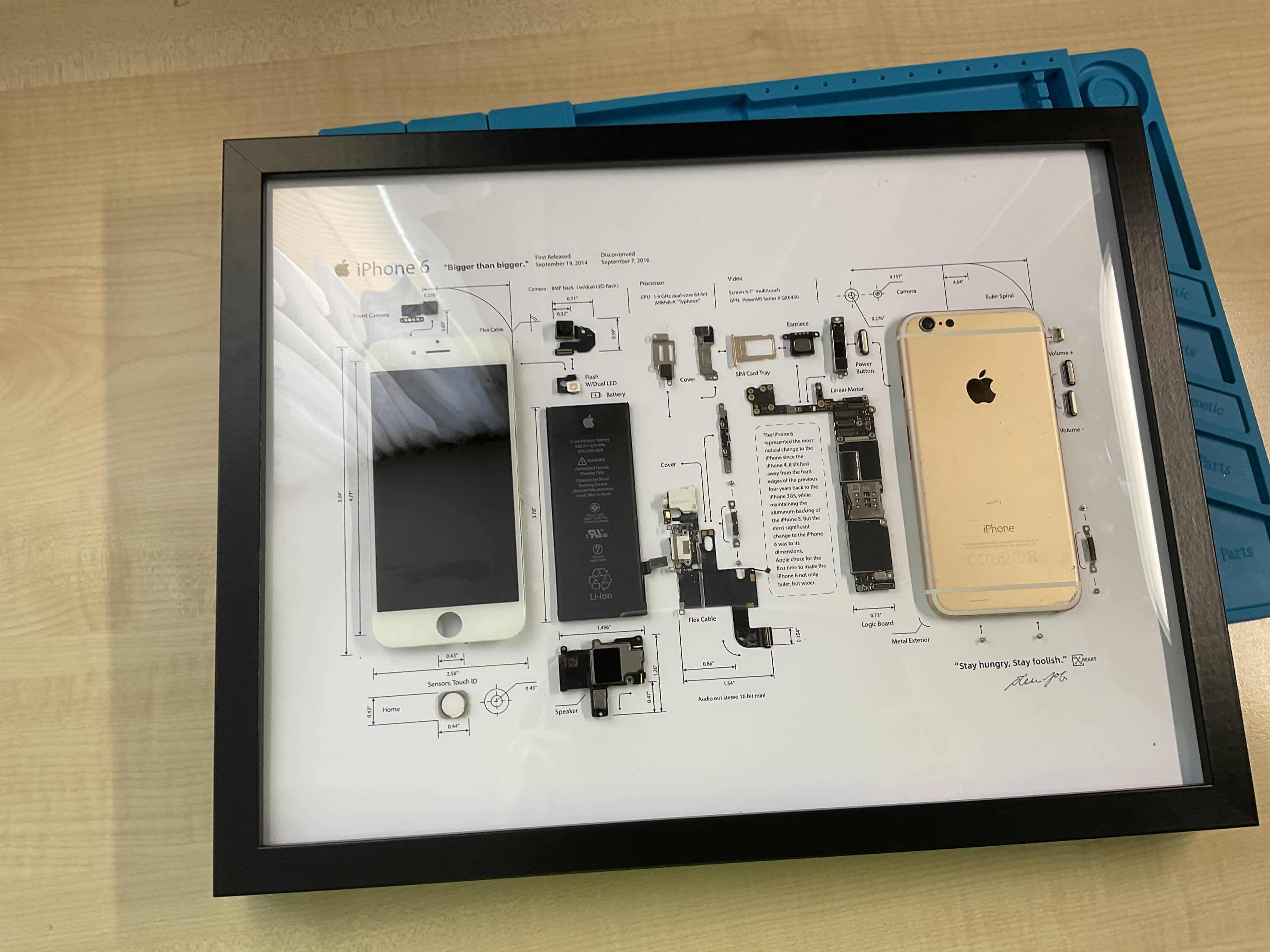 Který může být skvělý dárek pro lidi, kteří se zajímají v technice. Jedná se o vlastní výrobu z nefunkčního telefonu. Všechny základní díly v rámečku jsou popsané a většina dílu je připevněna tavnou pistolí. Rozměry rámečku jsou 42x31x3,5cm. Momentálně nabízím iPhony 6 v růžové a šedé s bílím displejem. Jeden obraz stojí 2299,- Ostatní fotky jsou od jiných iPhonů (prodané).
