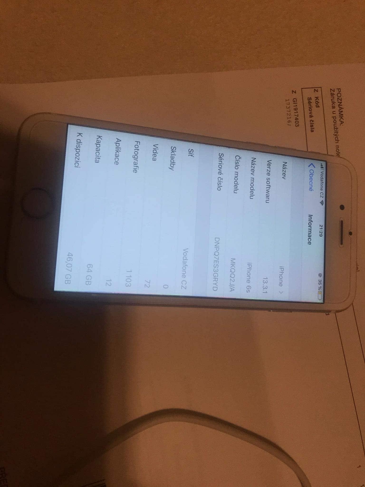 Nabízím k prodeji iPhone 6s 64 gb . Telefon byl běžně používání . Je v top stavu. Je bez škrábanců. Telefon je ještě v záruce. Kondice baterie je 100% nedávno vyměněna. K telefonu přidám fakturu , nabiječku , obal a nové tvrzené sklo . Možnost zaslání poštou
