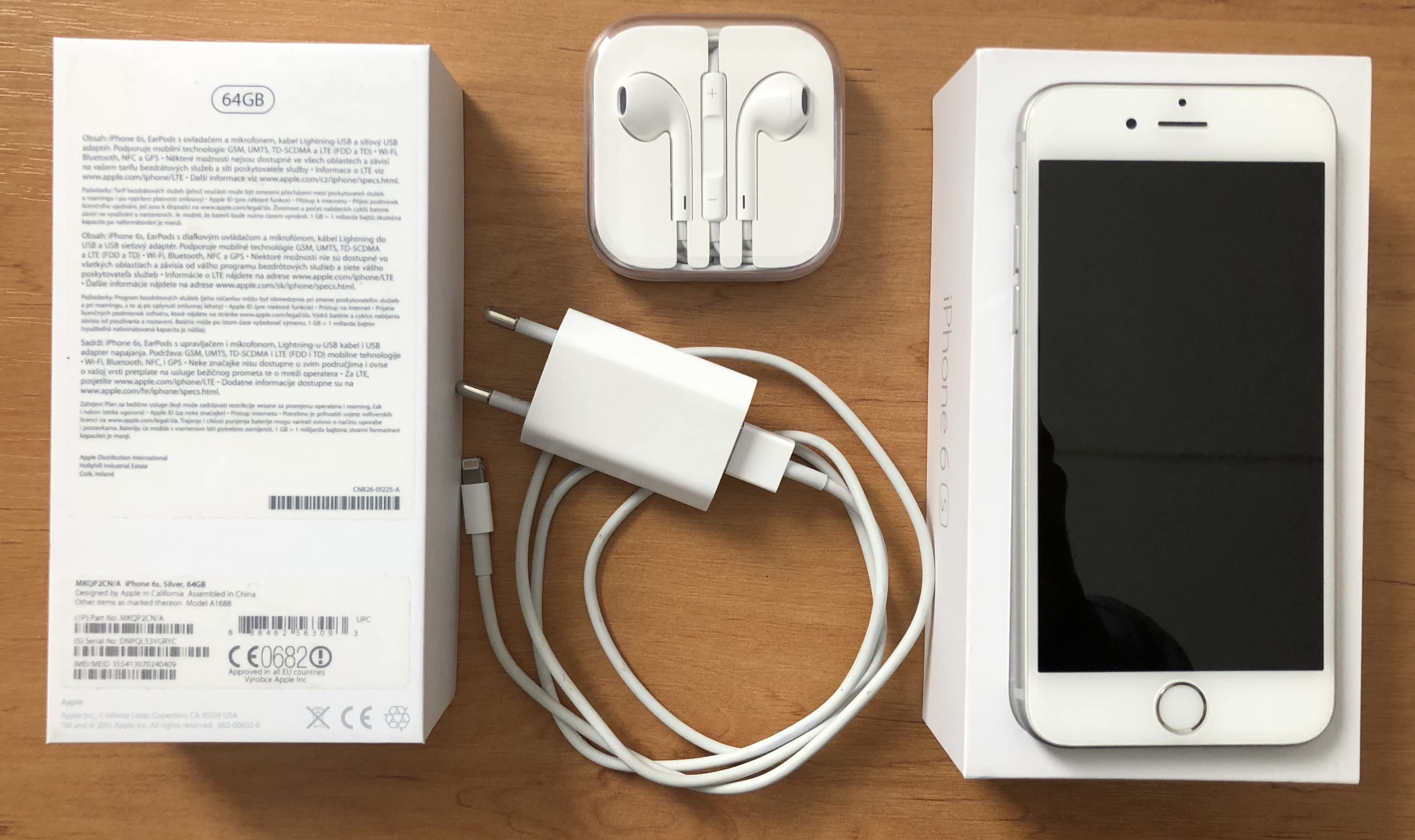 Prodám iPhone 6S 64GB Silver, 2 měsíce po záruce. Vždy nošen v pouzdře a s ochranným tvrzeným sklem. Top stav bez škrábanců. Tvrzené sklo bylo sundáno pro focení. Prodávám s krabičkou, včetně nabíječky s kabelem a novými nepoužitými sluchátky. Důvodem prodeje je přechod na iPhone 8. Další info nebo fotografie rád sdělím na emailu nebo po telefonu.