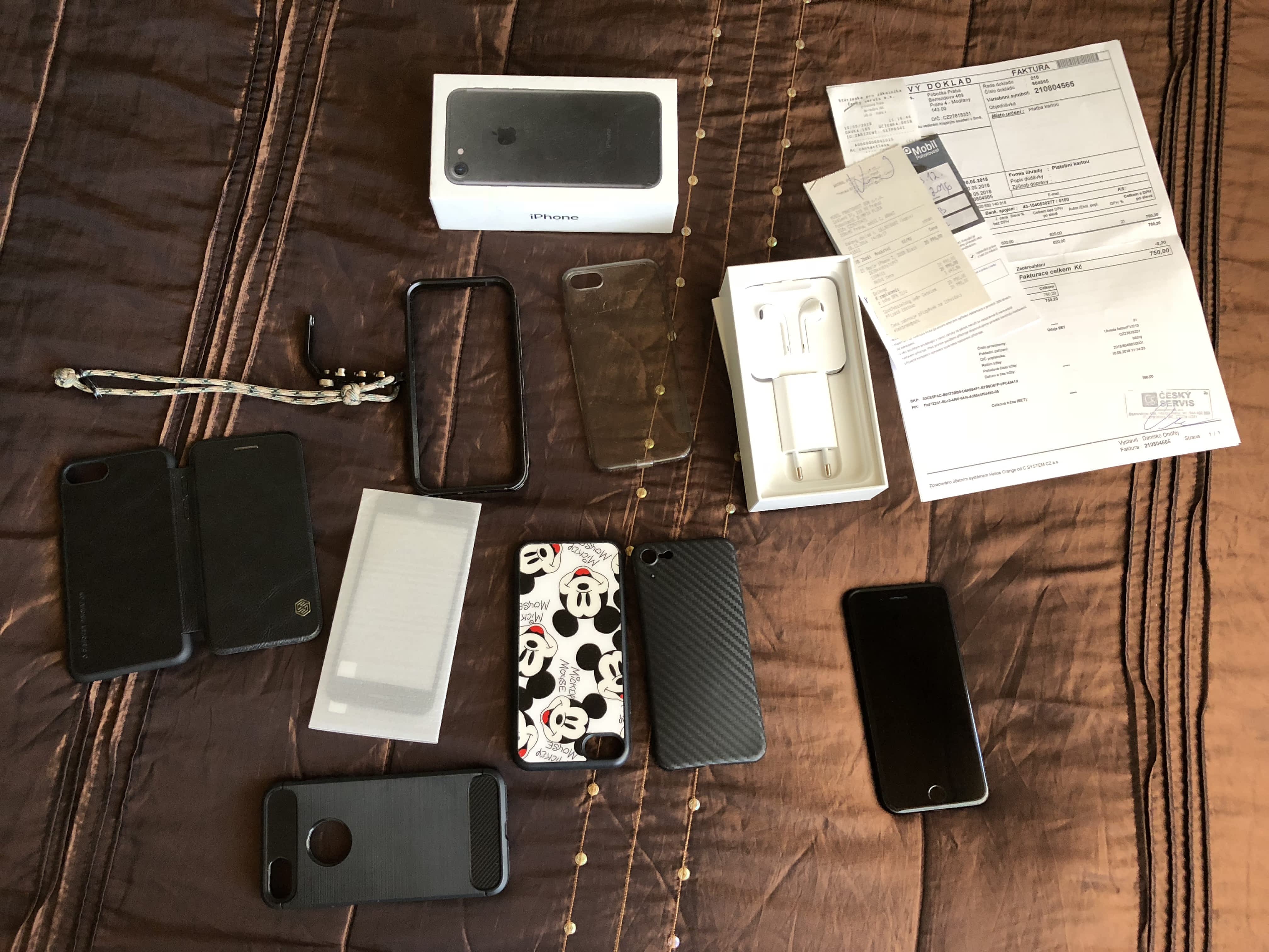 Prodám iPhone 7 černý. Nová baterie – vyměněno 10.5.2017 v autorizovaném servise Český servis (doklad samozřejmě). Komplet balení včetně nerozbalených sluchátek. V záruce do 18.12.208. K telefonu 5x kryt – čirý gelový, černý masivní, kožený flip Nilkin, černý Mickey mouse, ultra tenký vzhled karbon. Nové ochranné 3D sklo – nutno nalepit. Stav telefonu perfektní. Po celou dobu nošen v pouzdrech s nalepeným sklem. Nyní kvůli focení je bez ochranného skla.