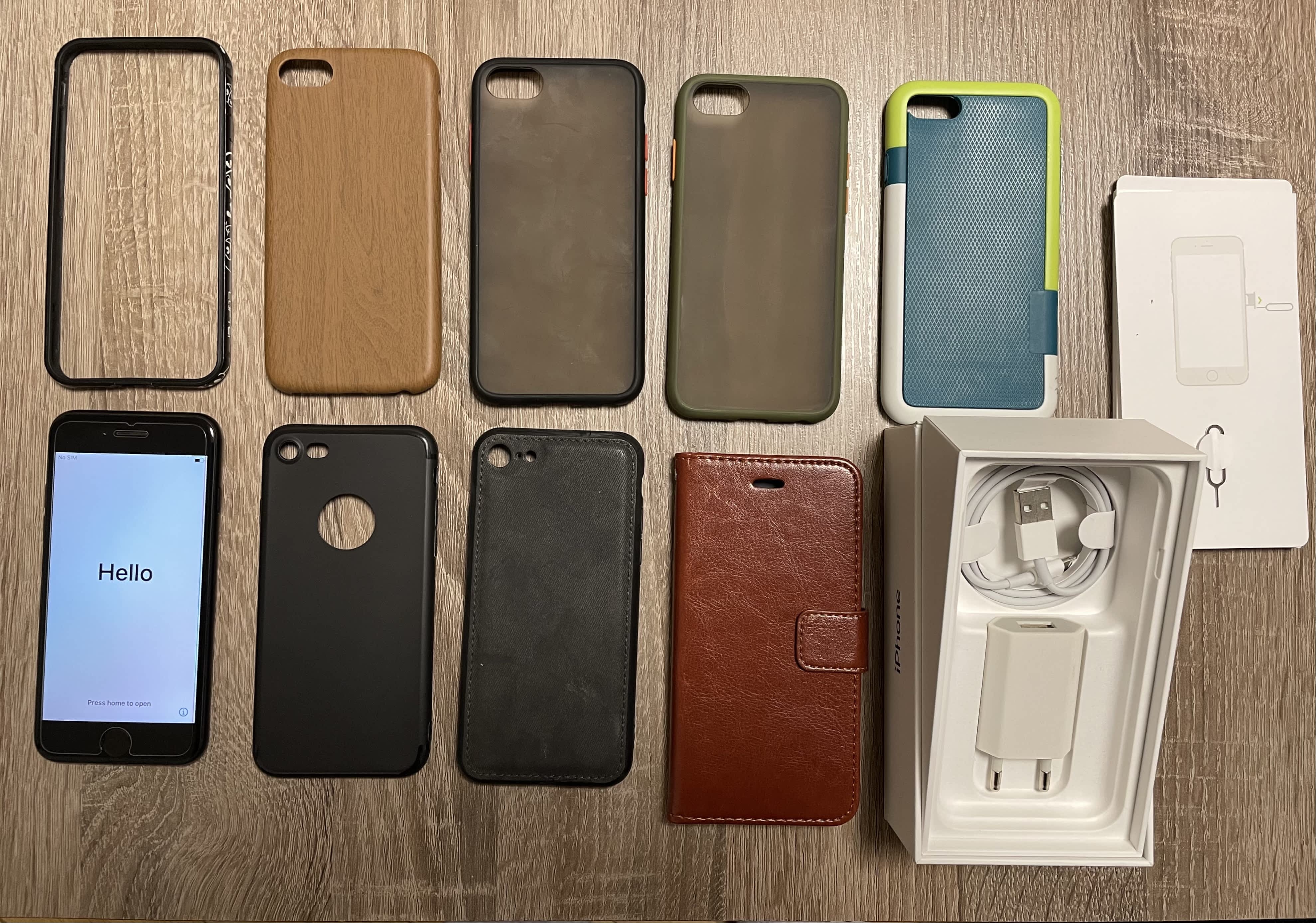 Prodám iPhone 7 32GB black, lehké známky používání. Drobný cca 0,5 cm dlouhý vryp na předním skle mimo displej viz foto. Nasazeno ochranné sklo. V balení AC, kabel, bez sluchátek. Součástí 8 obalu viz foto.