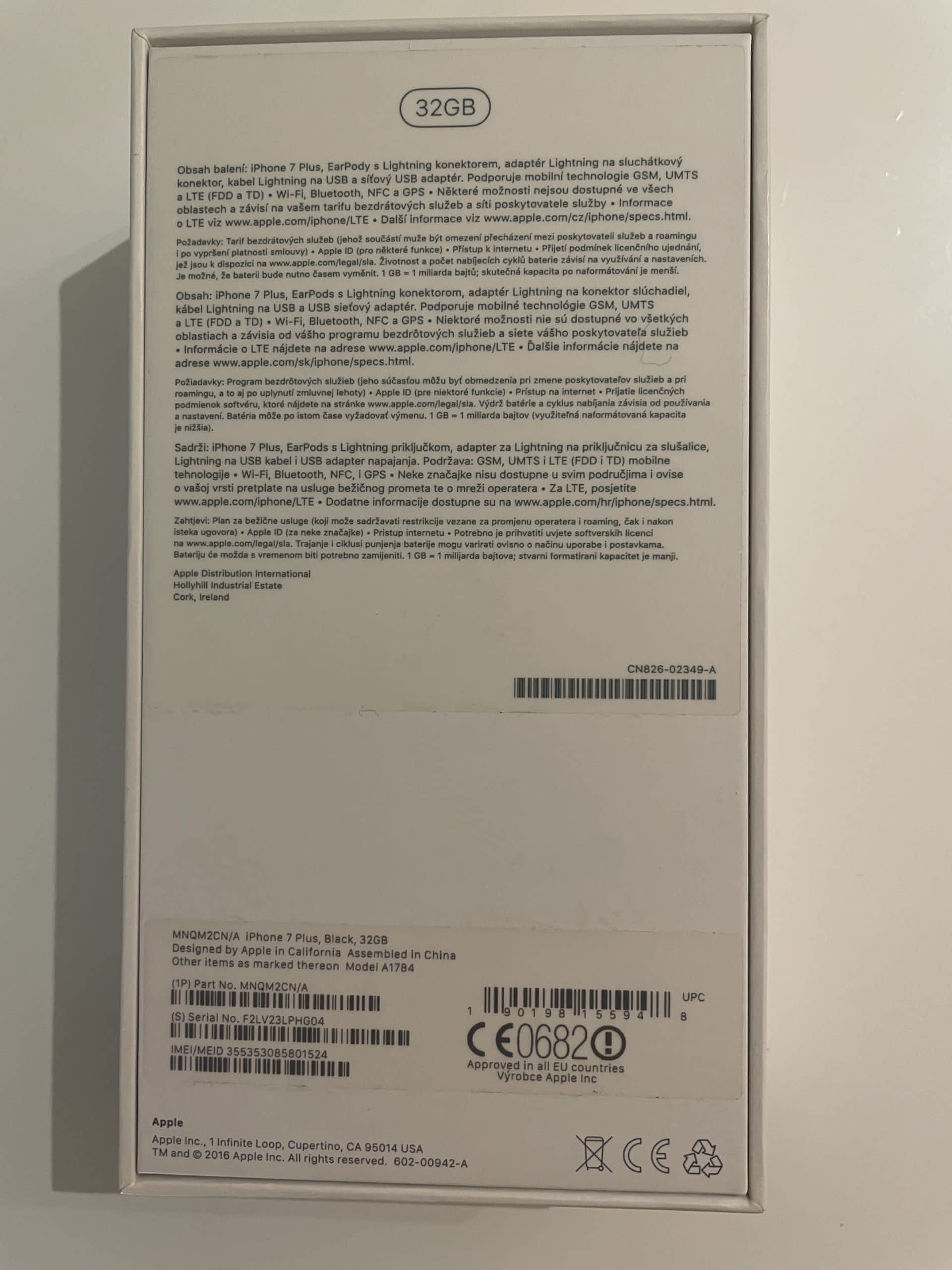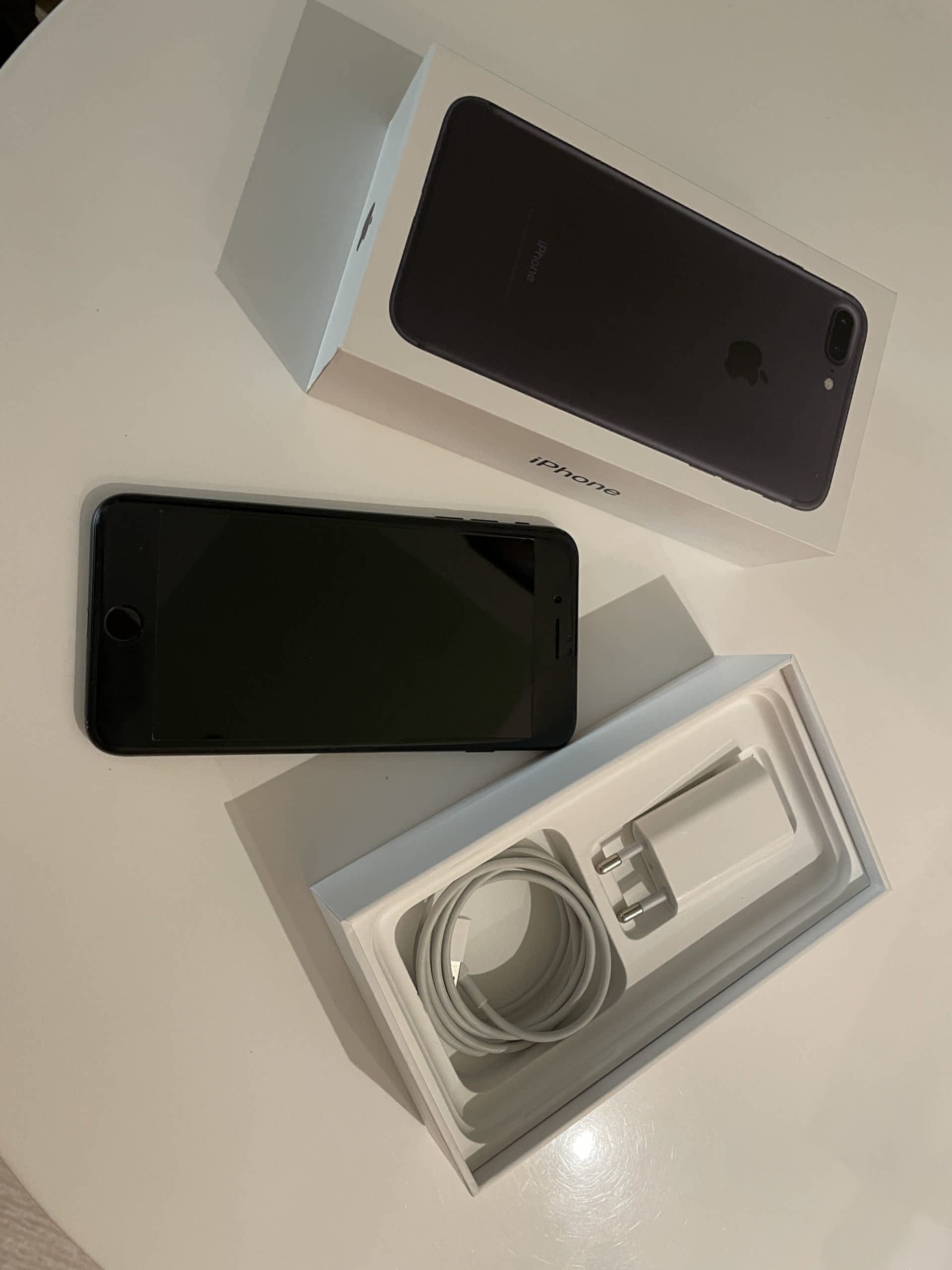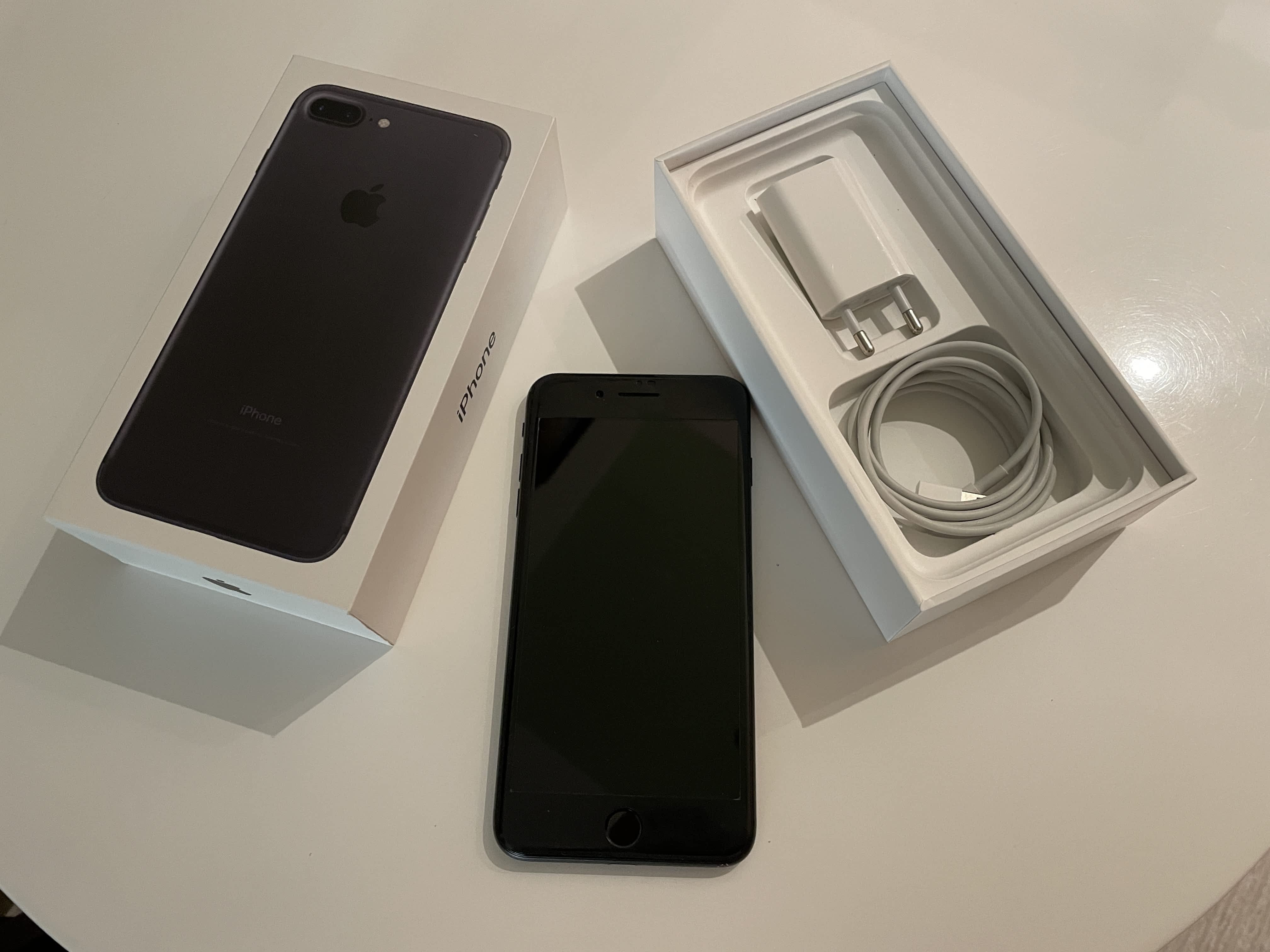 Prodám iPhone 7 plus 32 GB černý, zakoupen 11/2017, používán v knižním obalu, ochranné sklo nalepeno při koupi, originál krabička, adaptér, kabel, top stav.