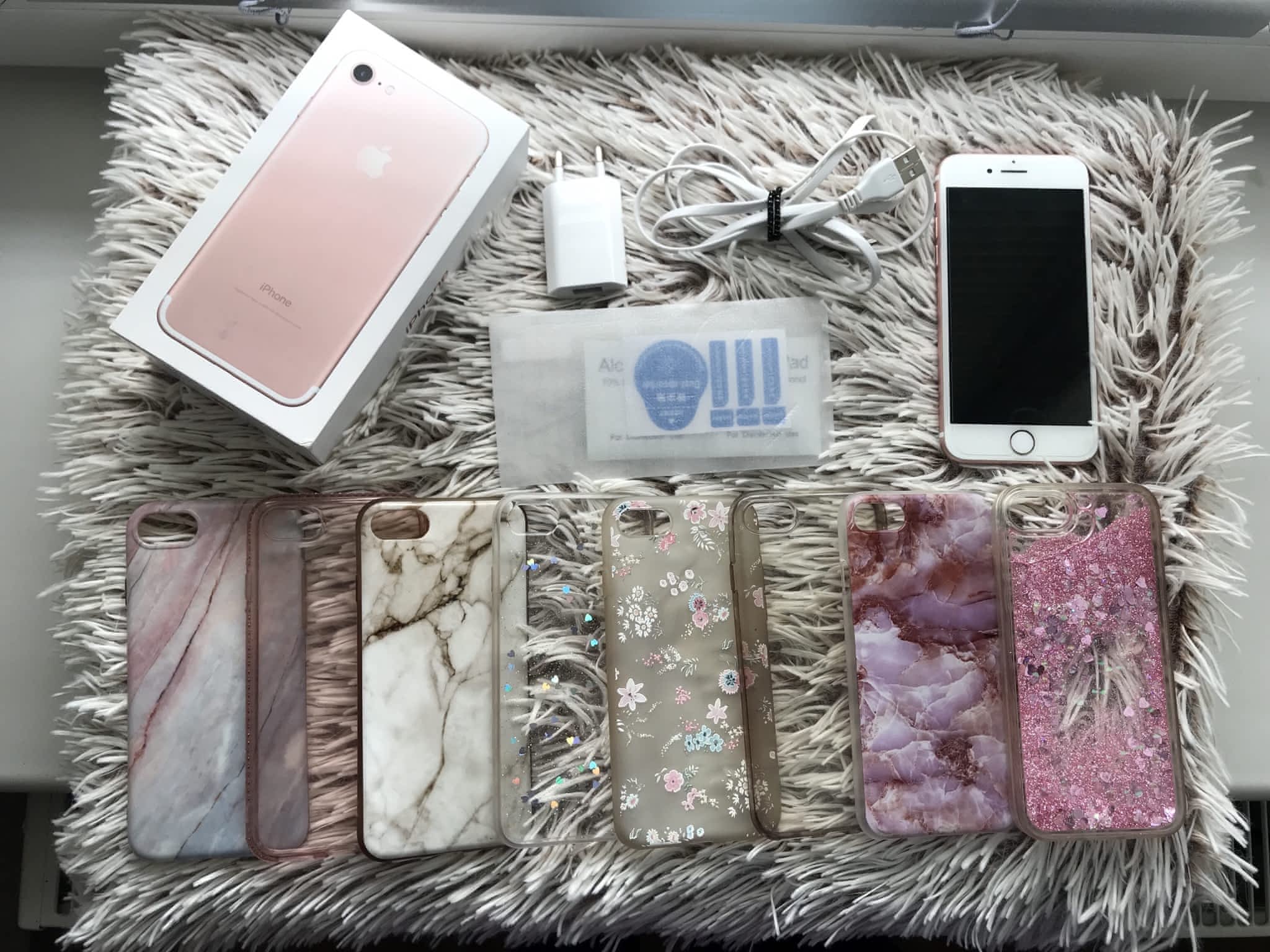 V ceně zahrnuto 8 krytů, ochranné sklo na mobilu + jedno náhradní, nabíječka, redukce a jehla na vyjmutí SIM karty.