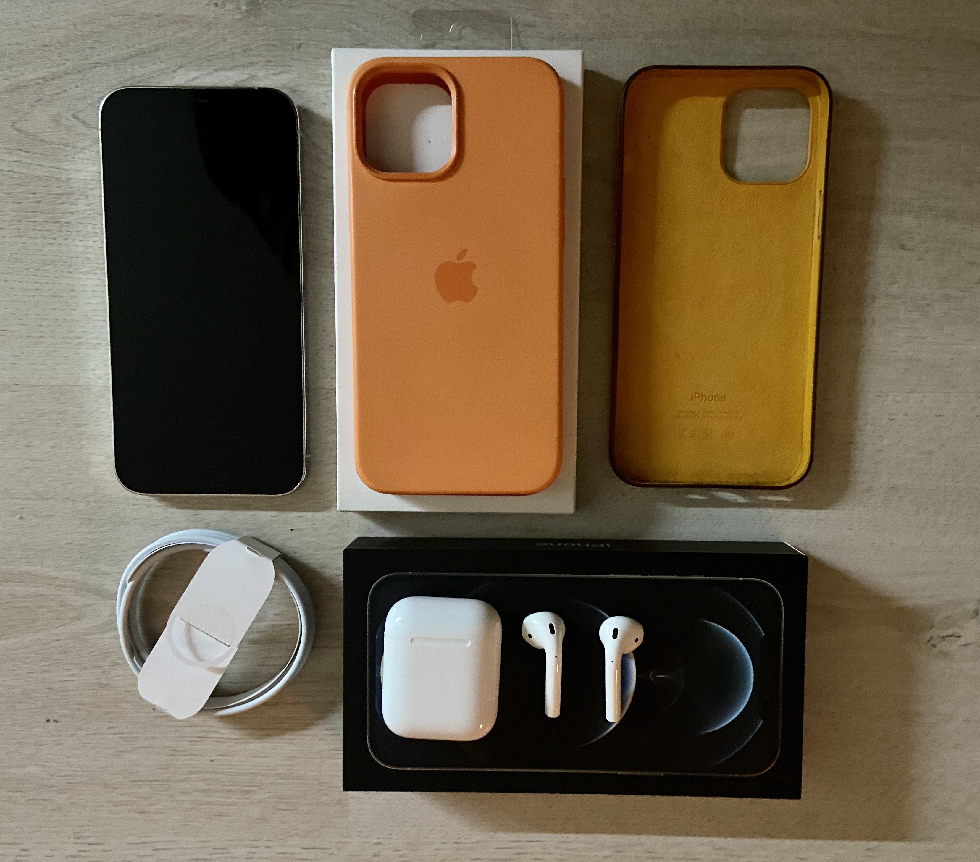 Prodám iPhone 12 Pro Max 128GB, bílý +AirPods 1. generace. Záruka 10 měsíců (zakoupen 12/2020). Telefon je v TOP stavu bez známek používání – po celou dobu nošen v pouzdře a s ochranou fólií na displeji. Telefon prodávám v originálním balení= krabička, telefon, kabel +příslušenství 2x originál Apple pouzdro (kožený magsafe měsíčkově žlutý, silikonový magsafe oranžový), AirPods první generace (používané, ale vyčištěné). Preferuji osobní předání v Praze.