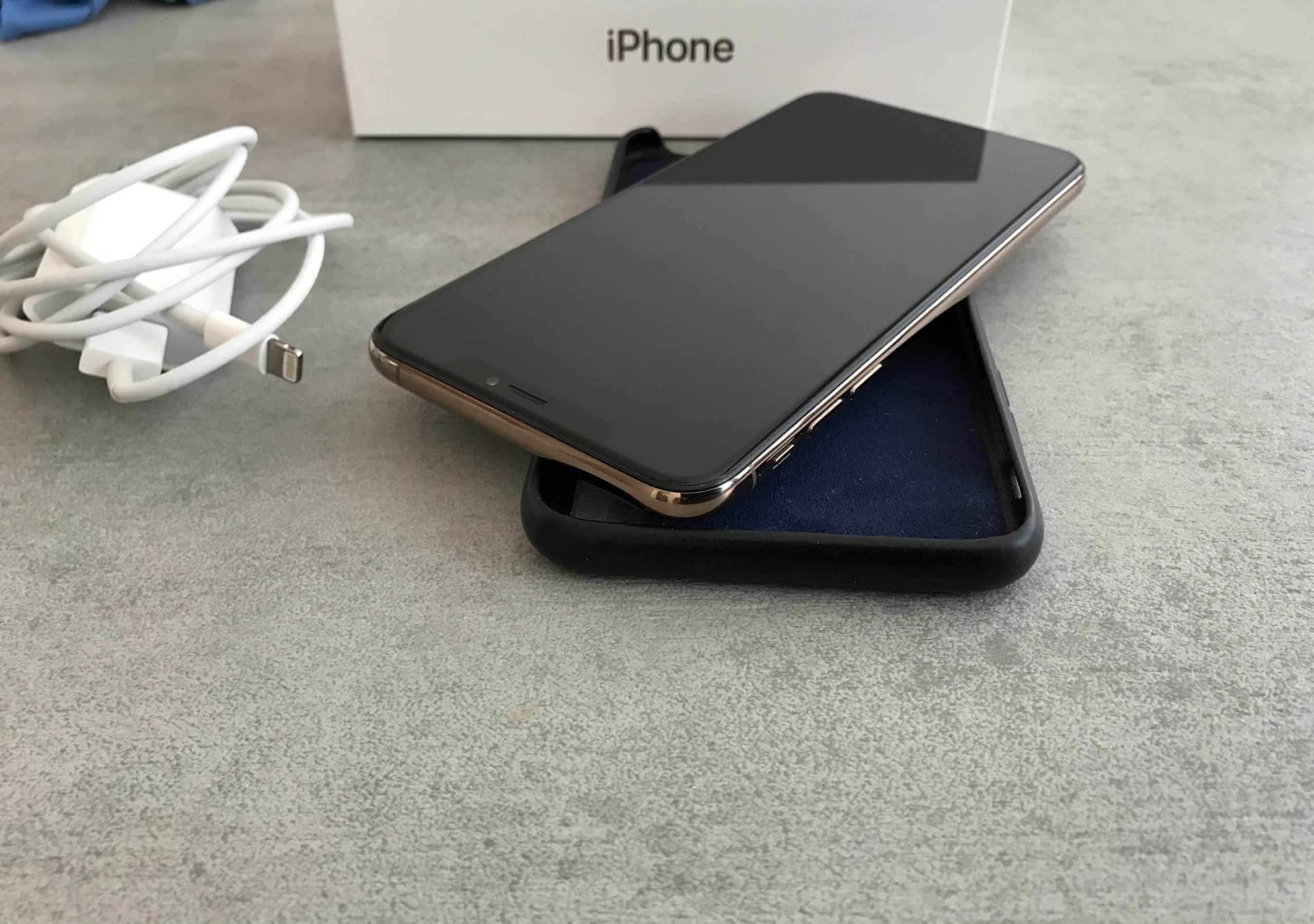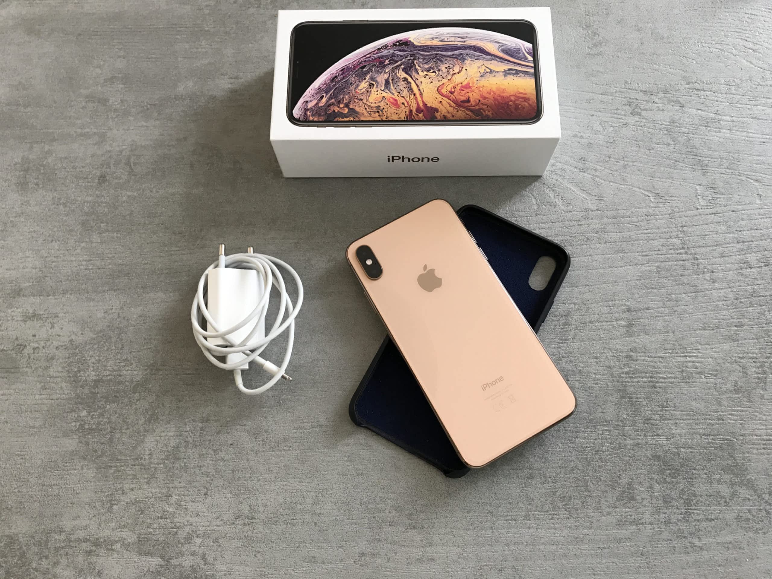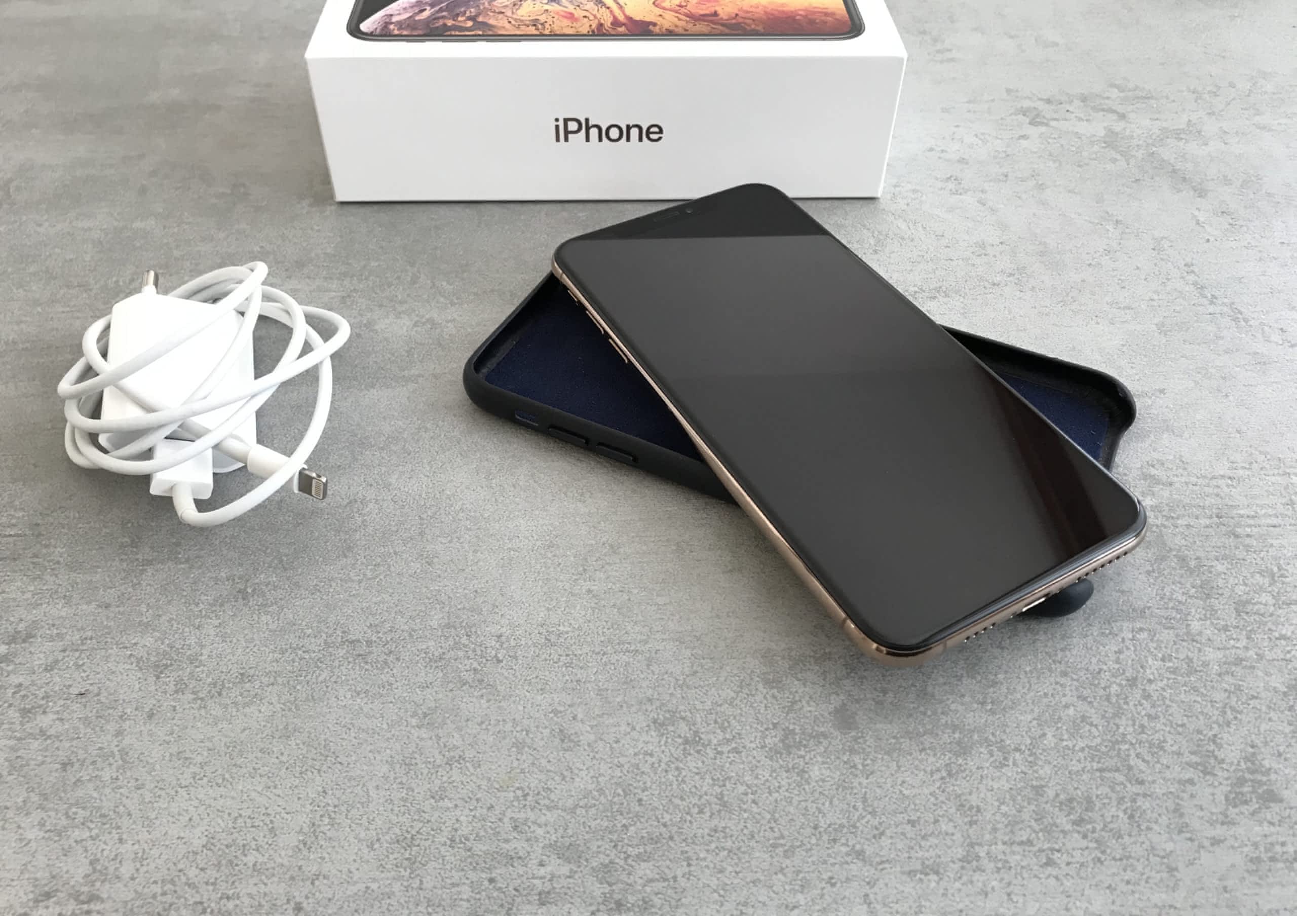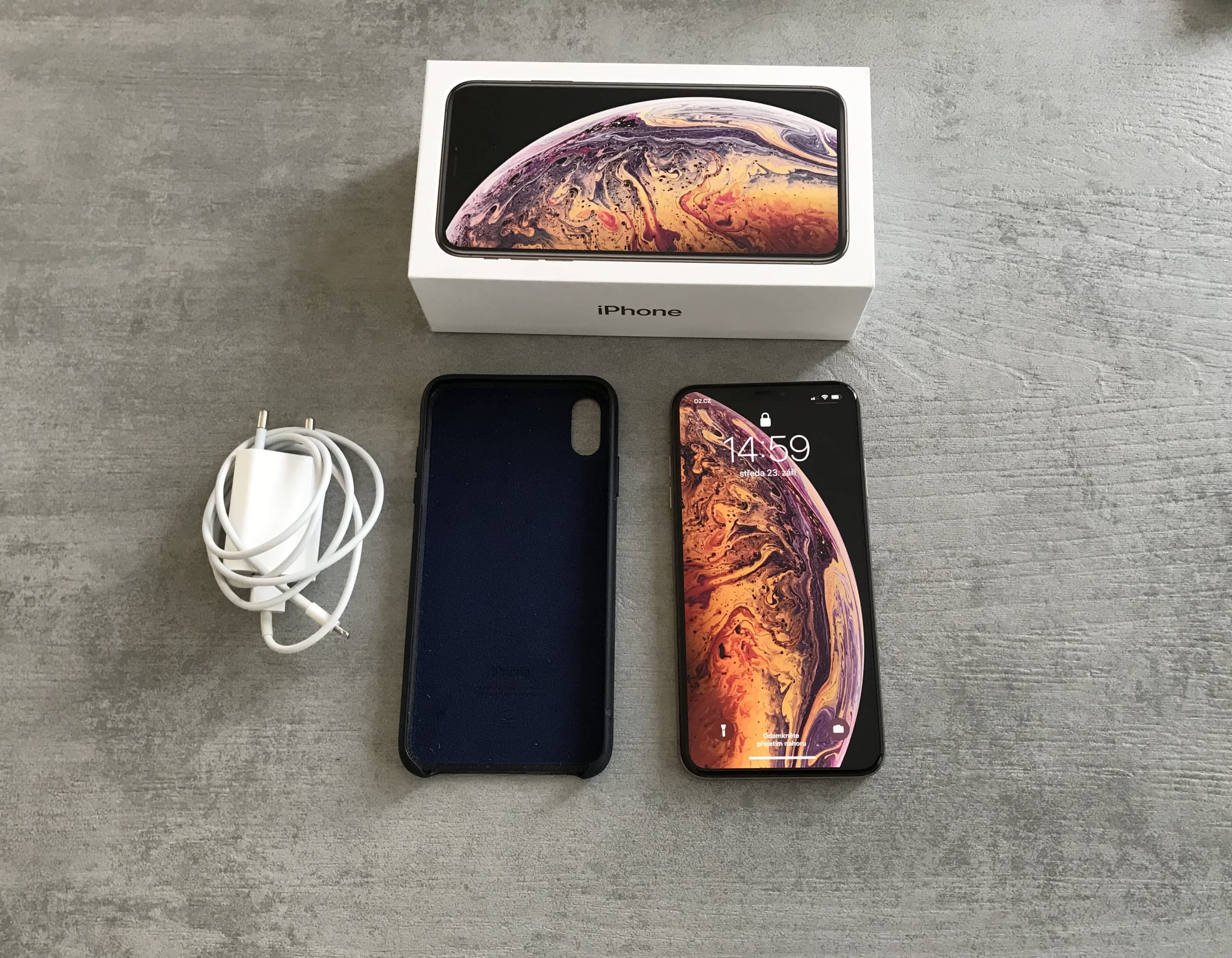 Prodám iPhone XS Max 64 GB Zlatý + originální Apple kožené pouzdro – modré + plastové průhledné pouzdro.