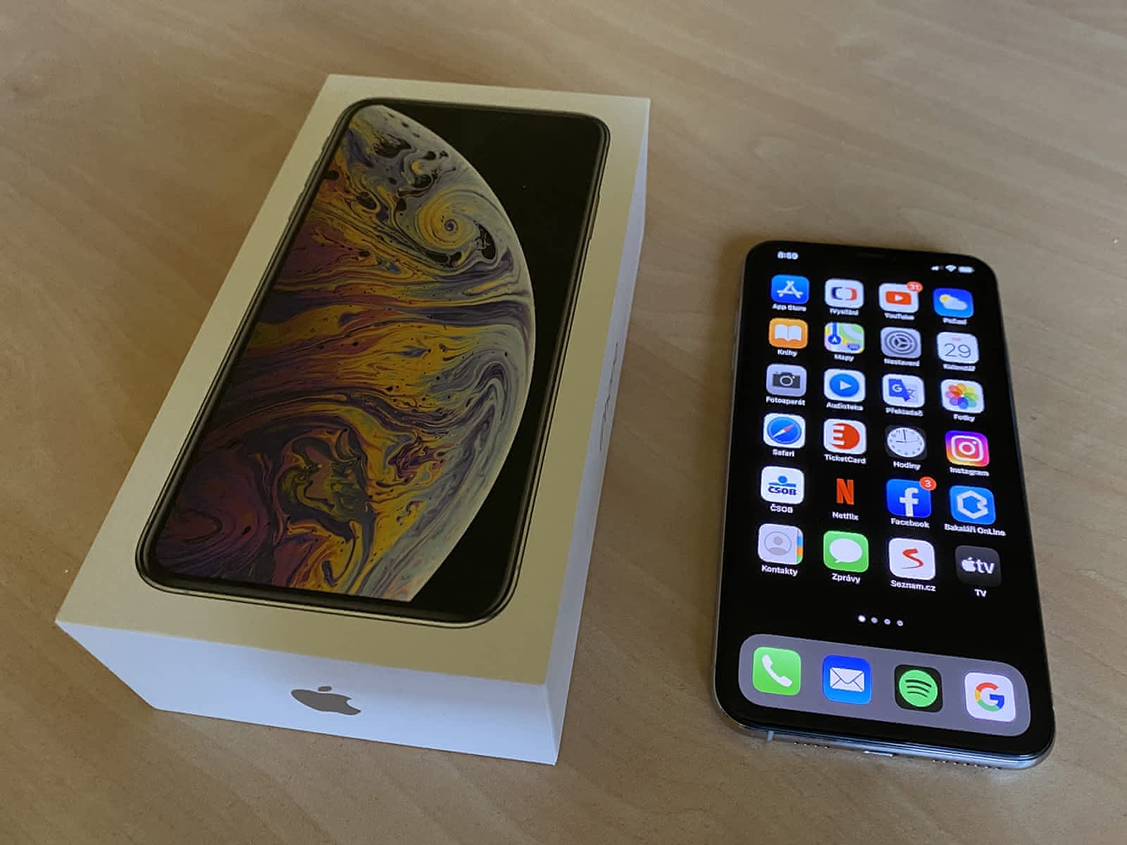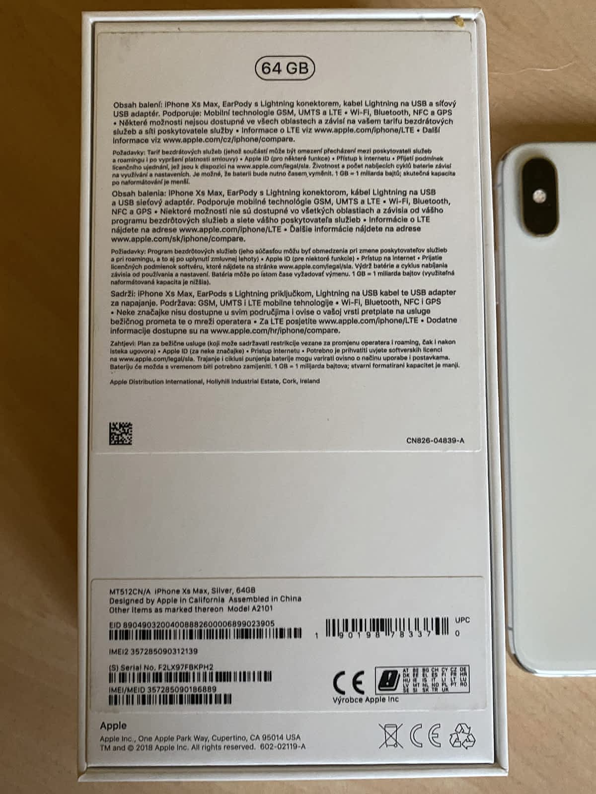 iPhone XS Max 64GB (2018) stříbrný, bílá záda. 6,5" P-OLED 2688 × 1242, procesor Apple A12 Bionic 6jádrový, RAM 4 GB, interní paměť 64 GB, zadní fotoaparát s optickým zoomem 12 Mpx (f/1,8) + 12 Mpx (f/2,4), přední fotoaparát 7 Mpx, optická stabilizace, GPS, Glonass, NFC, LTE, Lightning port, voděodolný dle IP68, single SIM + eSIM, neblokovaný, rychlé nabíjení 15W, bezdrátové nabíjení, baterie 3174 mAh, iOS 12. Kondice baterie 96%, kompletní balení, výborný stav.