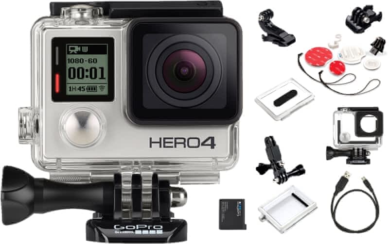 GoPro HERO 4 Silver. Jedná se o vůbec první GoPro kameru se zabudovaným displejem. To dodává větší jednoduchost při natáčení videí. Video je natáčeno v režimech 1080p60 a 720p120 a fotografie kamera pořizuje v rozlišení 12 Mpix rychlostí 30 snímků za sekundu. Původní cena za komplet 20 tisíc. Nyní 8000č.
