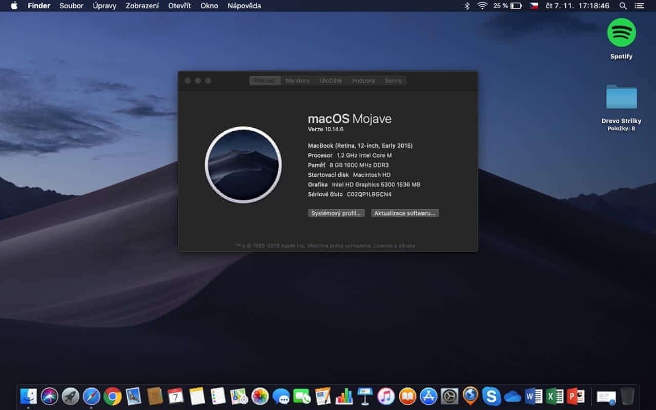 MacBook 12" Early 2015, Retina, 1.2 GHz Intel Core, 8 GB, 500 GB disk, Baterie 451 cyklů, macOS Mojave