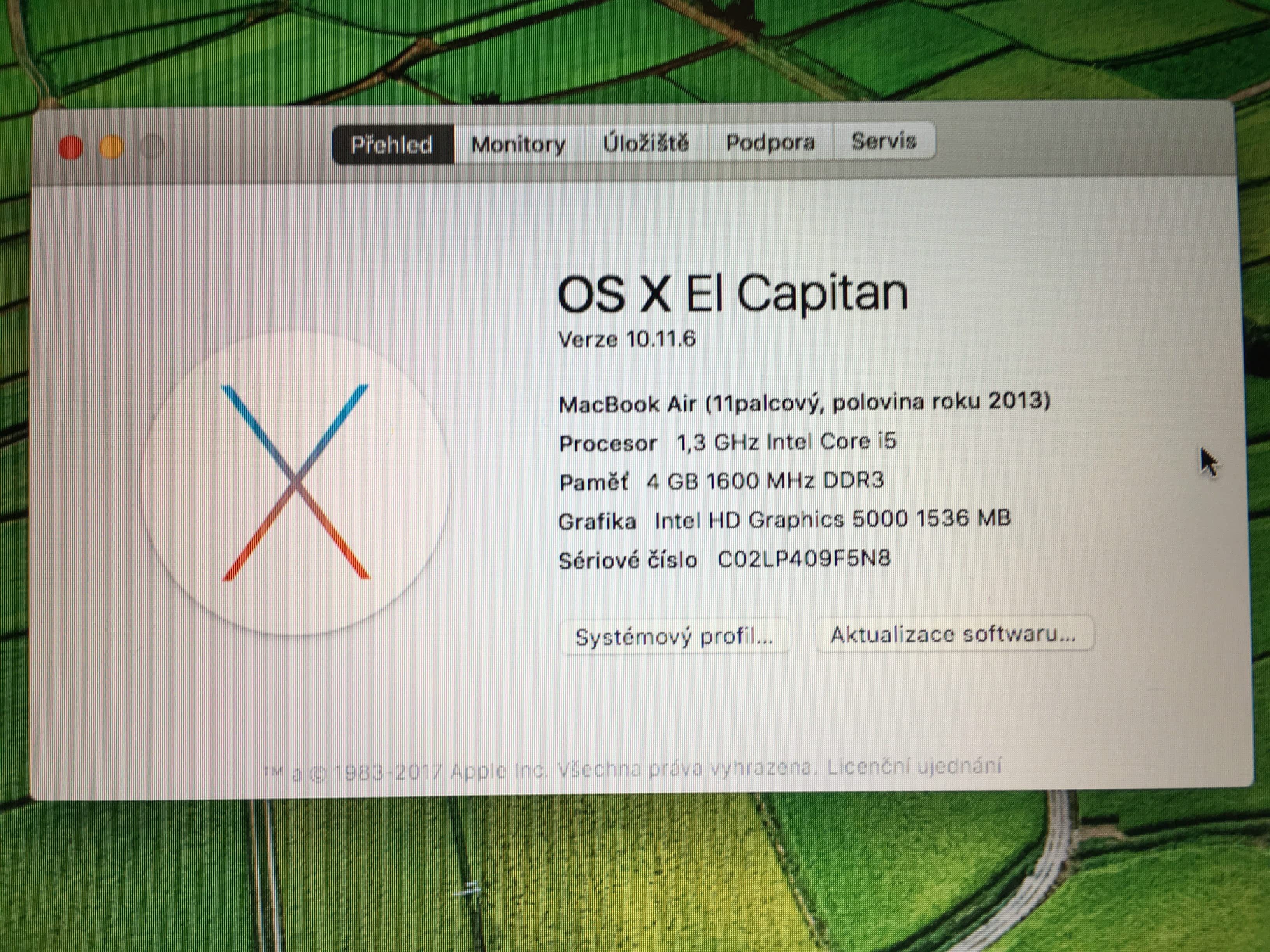 Macbook Air 11 Prodám MacBook Air 11-inch, mid 2013, procesor 1.3GHz dual-core Intel Core i5 (Turbo Boost up na 2.6GHz), 4GB 1600 Mhz DDR3, 256 GB SSD, podsvícená klávesnice, širokoúhlý displej s LED podsvícením (1366×768), 2x USB 3, podsvícená klávesnice, senzor okolního světla. Na místech bouhnutý/škrábnutý – lze vidět na fotkách. Nemá vliv na funkčnost. Plně funkční, spolehlivý notebook. Dlouhá výdrž na baterii. Originální balení. Prodávám z důvodu koupě novějšího Macbook Pro.
