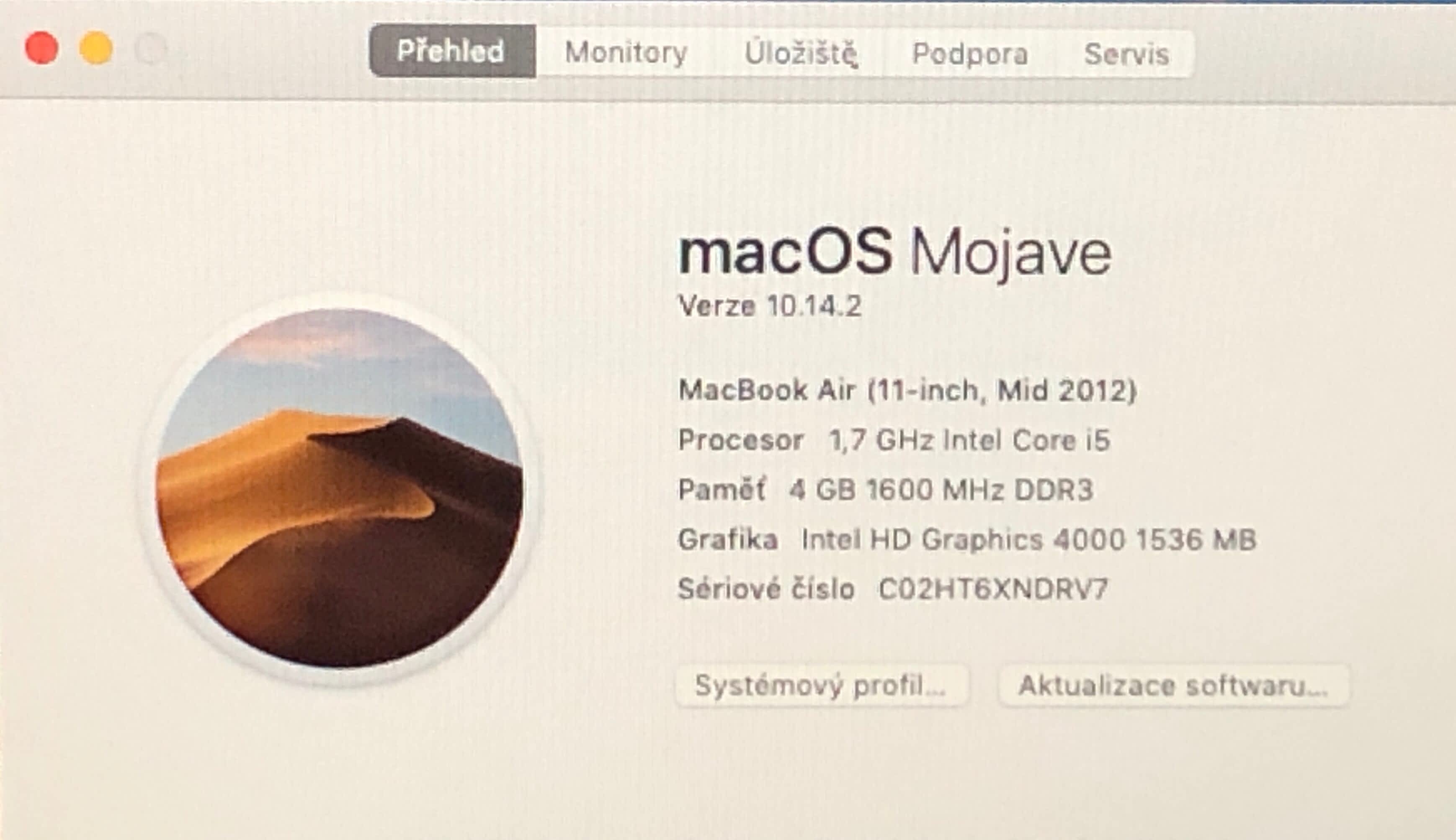 Počítač byl používán v nekuřácké domácnosti a baterie má 535 cyklů. Počítáč je ve velmi dobrém stavu viz fotografie. Instalován má nejnovětší operační systém macOS Mojave 10.14.2.