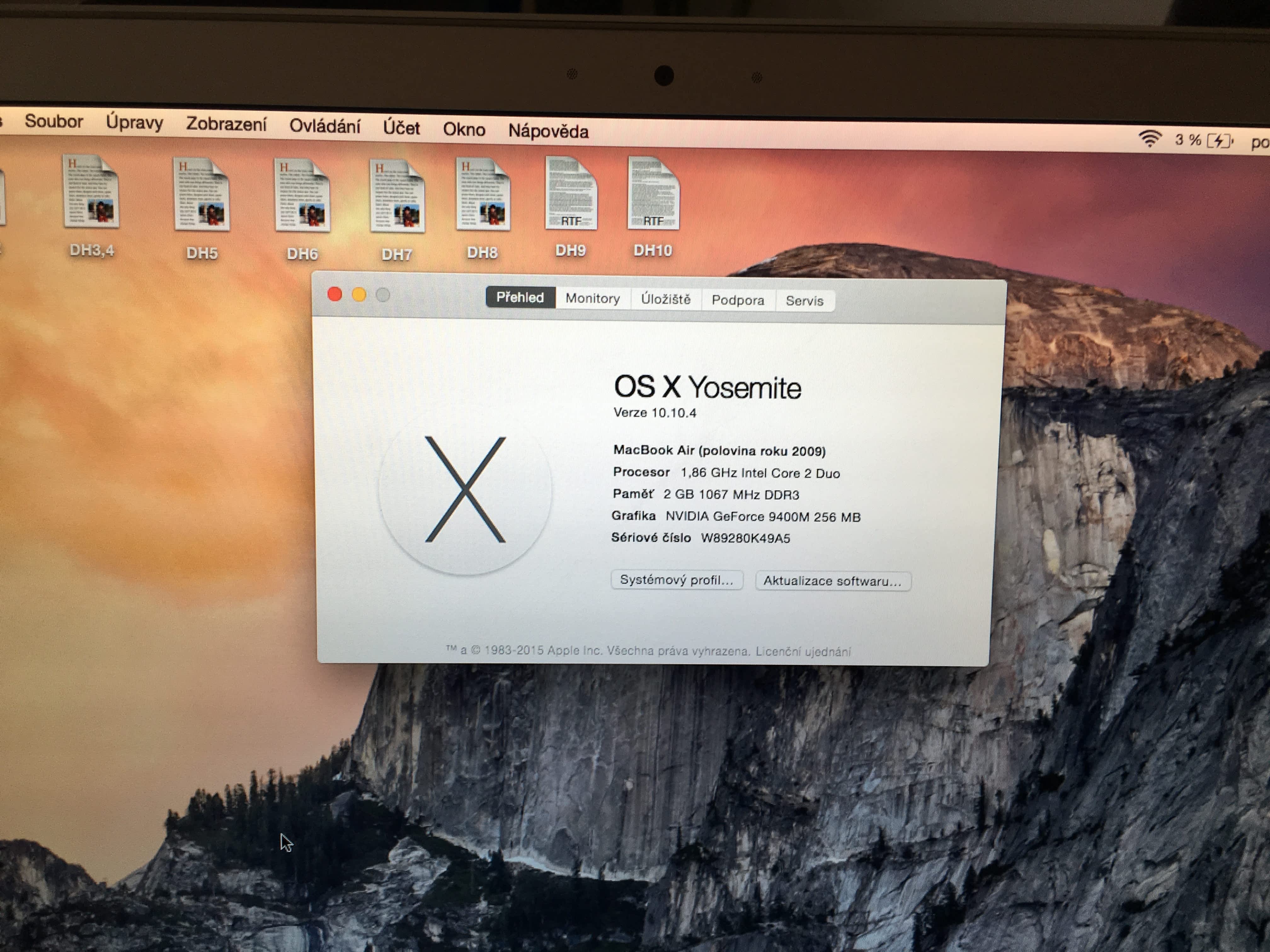 Procesor 1,86 GHz Intel Core 2 Duo, Pamět 2 GB 1067 MHz DDR3, Grafika NVIDIA GeForce 9400M 256 MB, s podsvícenou klávesnicí, velmi zachovalý včetné krabice, baterie cca. 0,5 – 1h v závislosti na použitém výkonu. Poslední dobou používáno na el. síť. Osobní odběr Praha. Při rychlém jednání možná sleva.