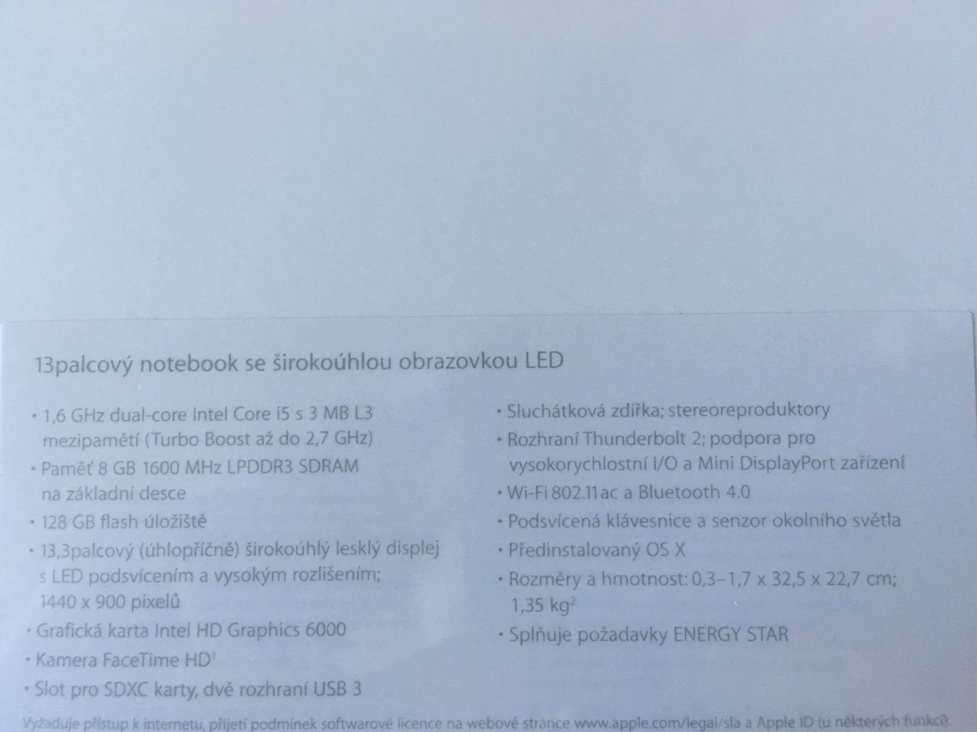Konfigurace: 1,6 GHz dual-core Intel Core i5, 8 GB 1600 MHz SDRAM, 128 GB flash uložiště, Intel HD graphics 6000.