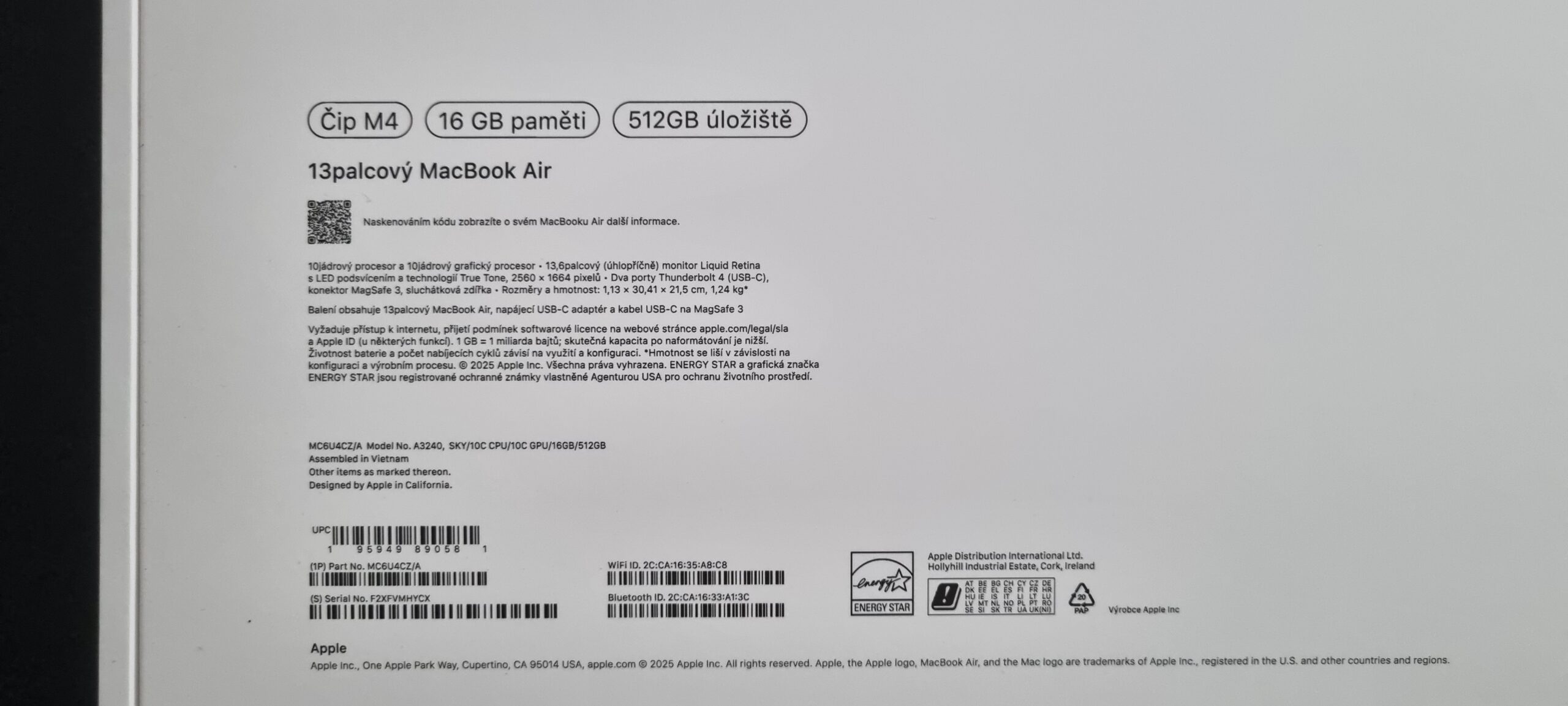 MacBook – Apple M4 (10jádrový), 13,6" IPS lesklý 2560 × 1664 px, RAM 16GB, Apple M4 10jádrová GPU, SSD 512GB, podsvícená klávesnice, webkamera, čtečka otisků prstů, WiFi 6E, Bluetooth, hmotnost 1,24 kg, macOS.