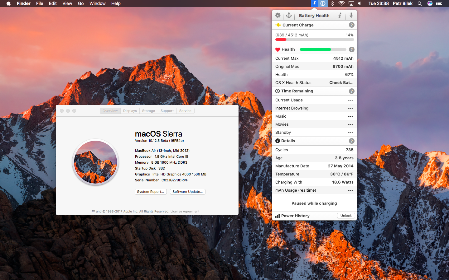 Nabízím k prodeji plně funkční Macbook Air 13" mid 2012. Vyměněná baterka 2014, poslední cca rok téměř nepouživaný.