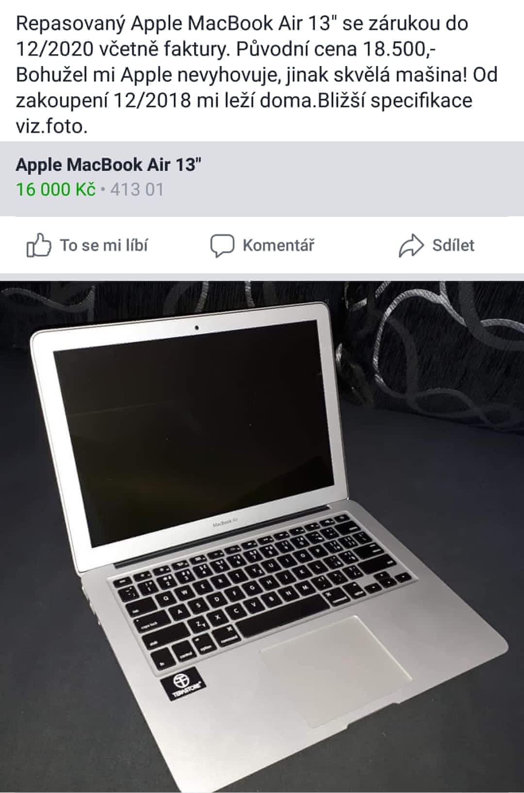 Prodam repasovany MacBook Air 13". Zakoupen 12/2018 za 18.500,- se zarukou 24mes. a mnou nepouzivan.System Apple mi bohuzel nevyhovuje, jinak super masina.
