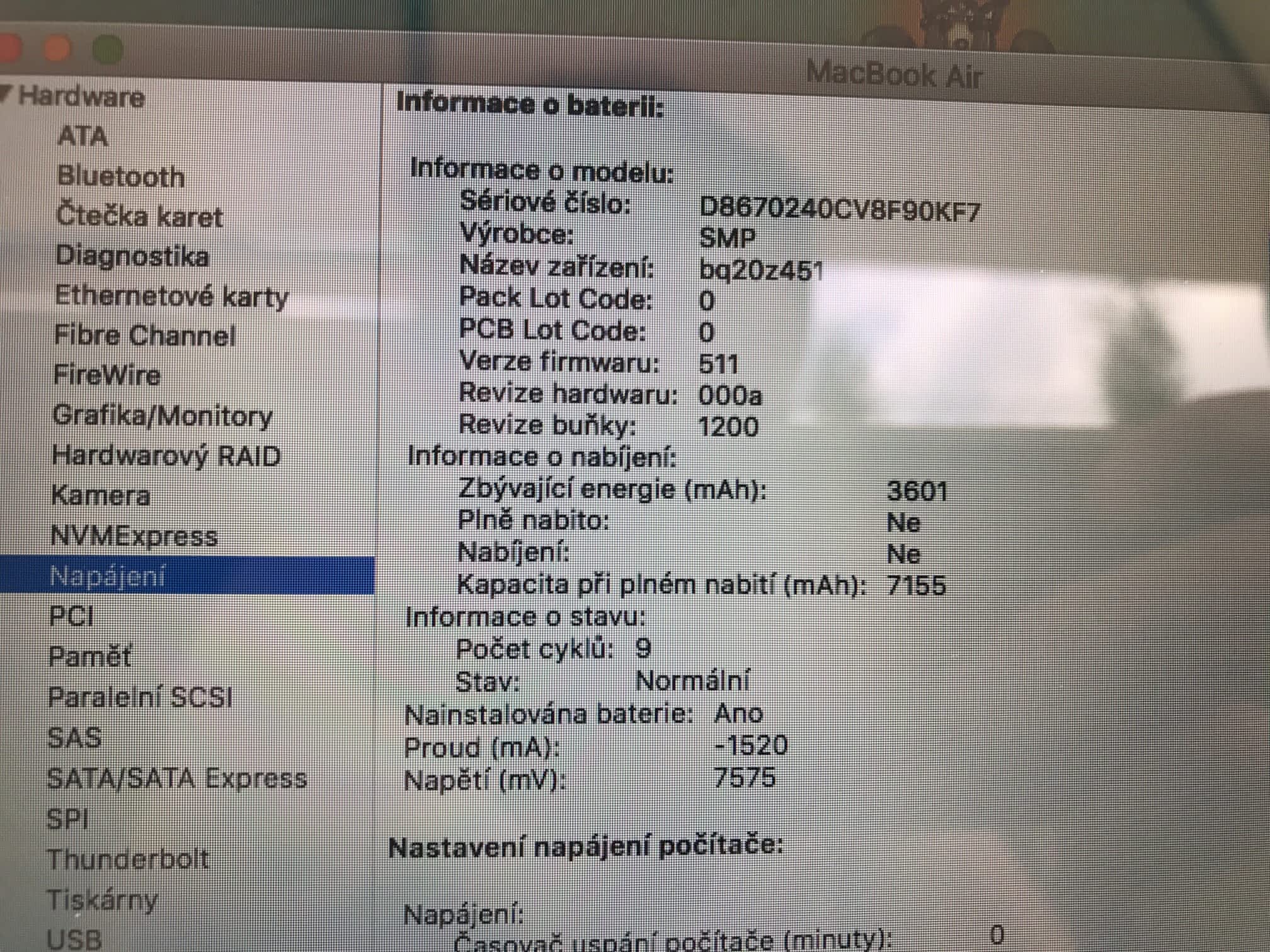 Počet cyklů baterie – 9. Více informací o tomto MacBooku zde – https://www.apple.com/cz/macbook-air/ Možnost osobního předání nebo zaslání přepravní společností s pojištěním.