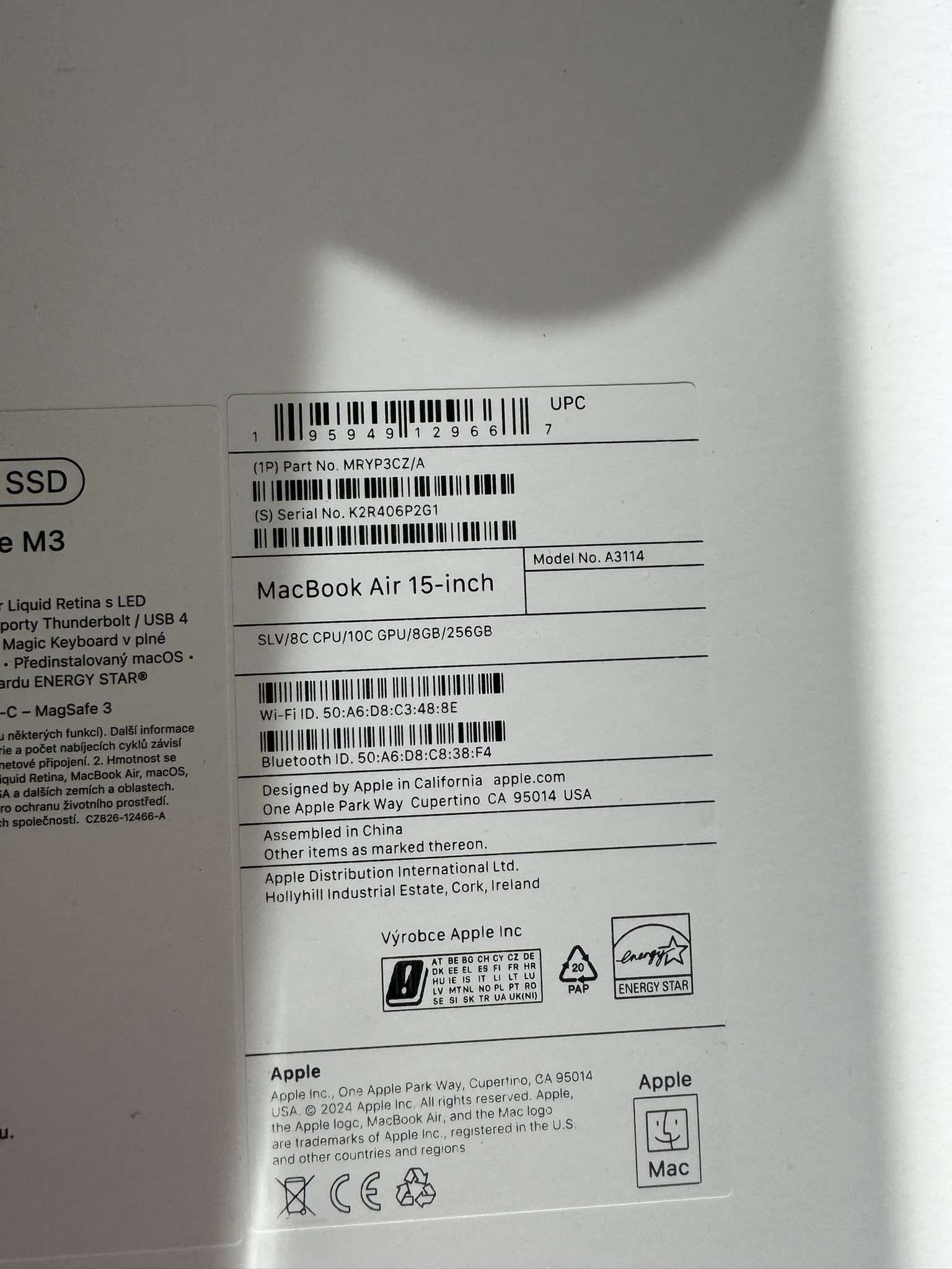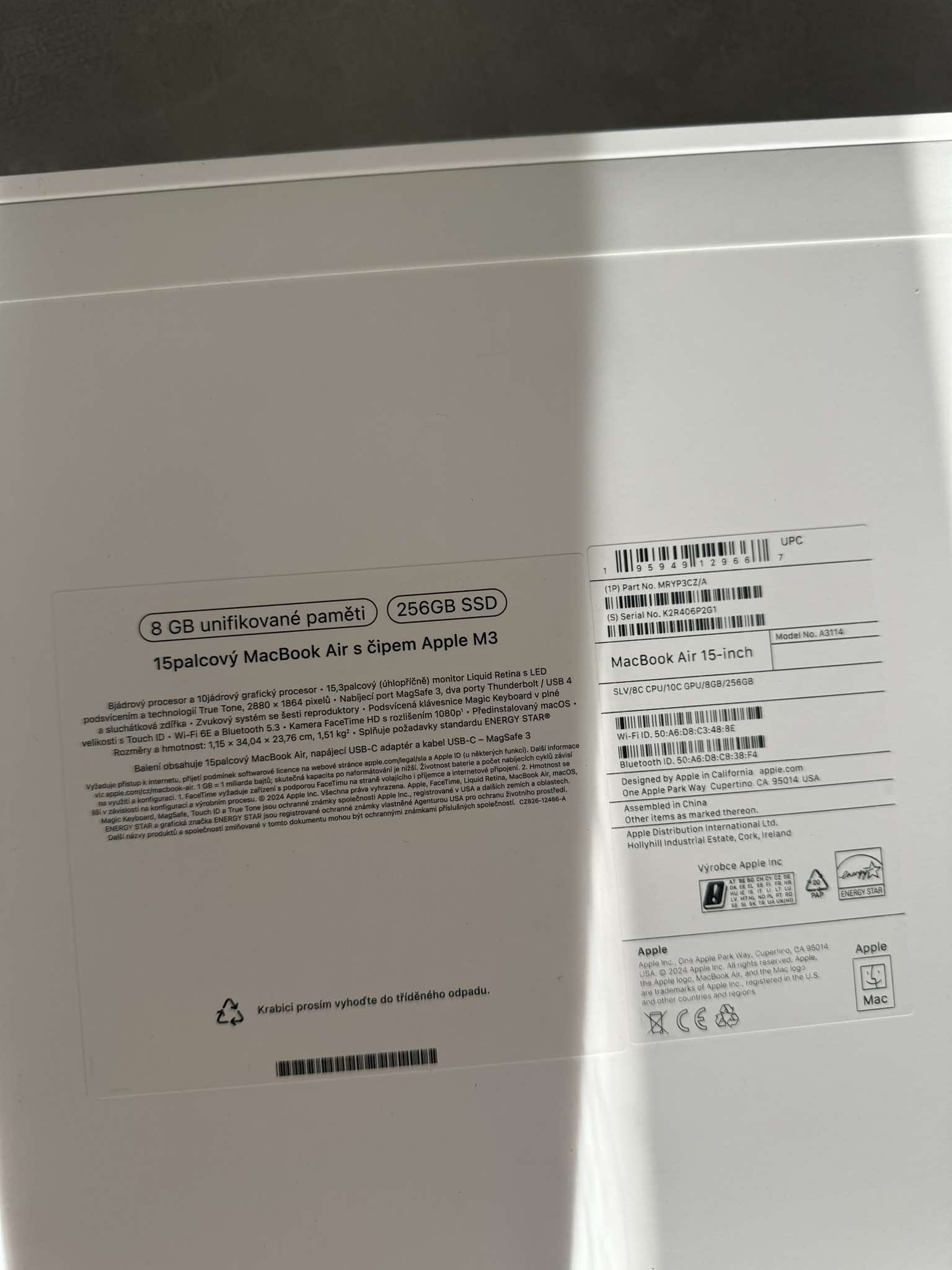 Prodám nový nerozbalený Macbook Air 15" 256GB M3 Stříbrný 2024. Macbook však není problém na místě rozbalit. Jde o českou distribuci.