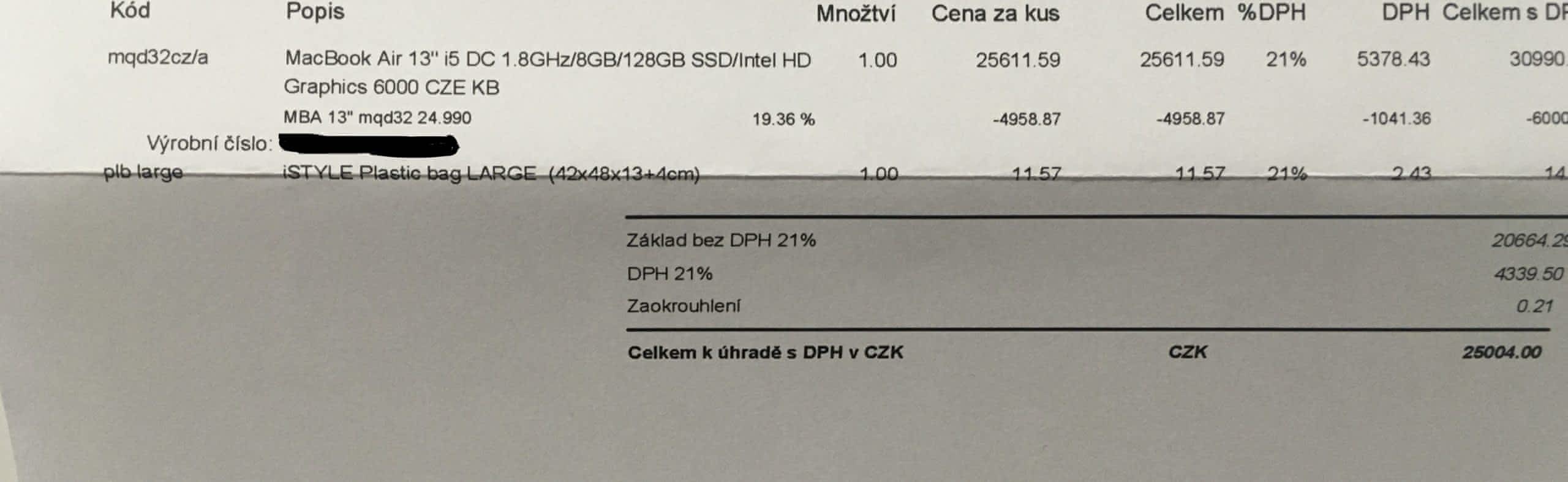 pro dam MacBook Air (model 2017) ve standardní konfiguraci s kapacitou úložiště 128GB. Koupen 23.6.2018 v iStyle Brno. Nese známky běžného používání. Počet cyklů baterie: 235