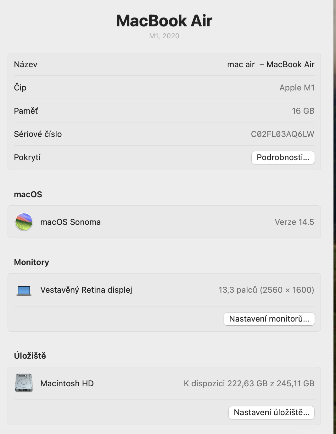 Prodám MacBook Air 13" Retina CZ M1 2020, 16GB!