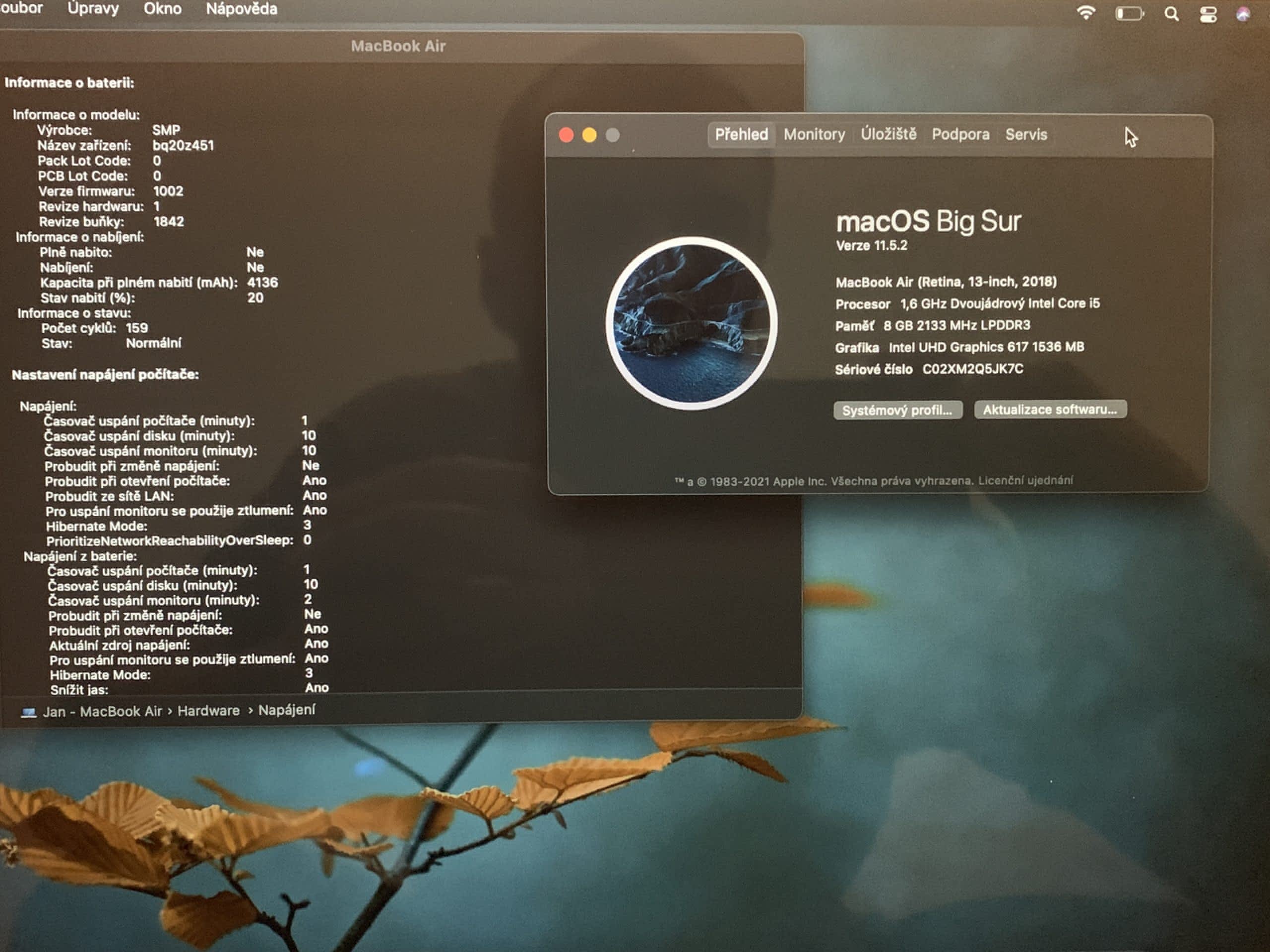 Baterie – počet cyklů nabíjení je pouze 159. MacBook byl od jeho zakoupení v krytu. Klávesnice je rovněž jako nová, bez známek použití.