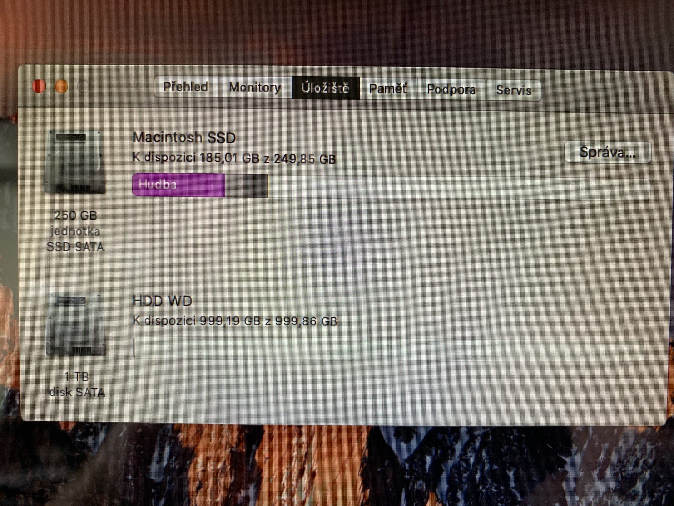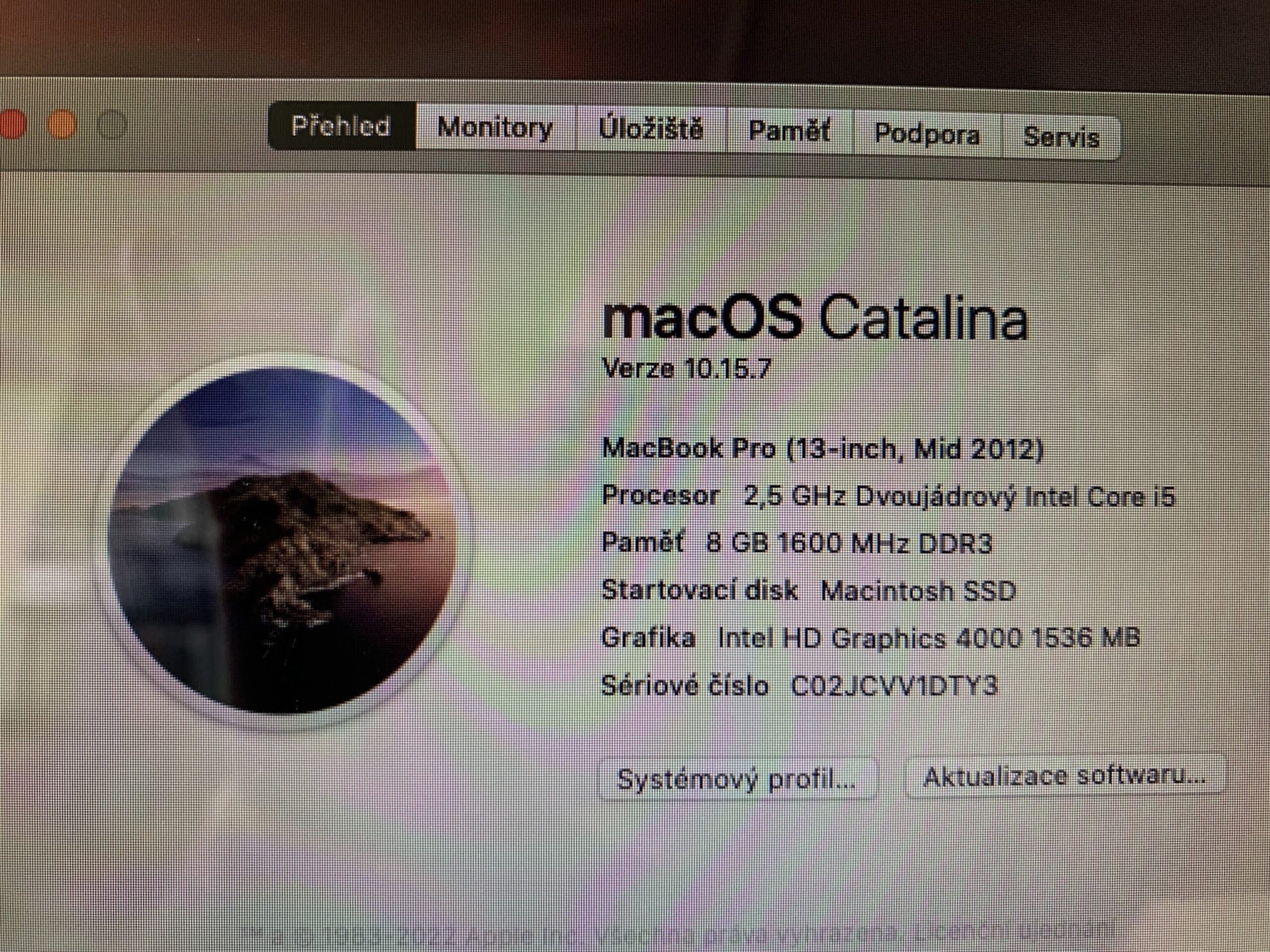 MacBook Pro 13-inch, Mid 2012, 2,5 GHz Intel Core i5, 250 GB SSD + 1TB HDD nainstalován místo DVD Rom.