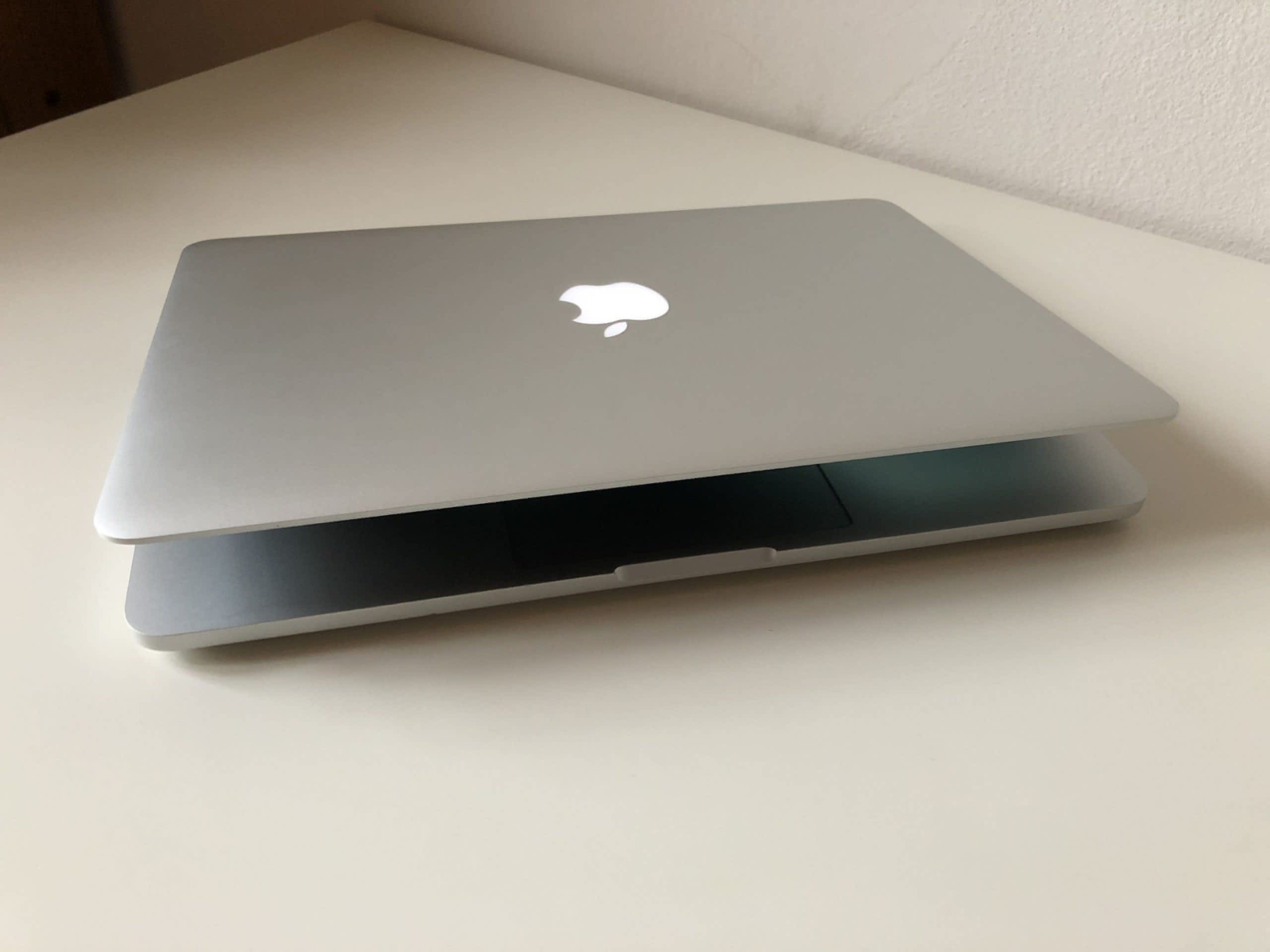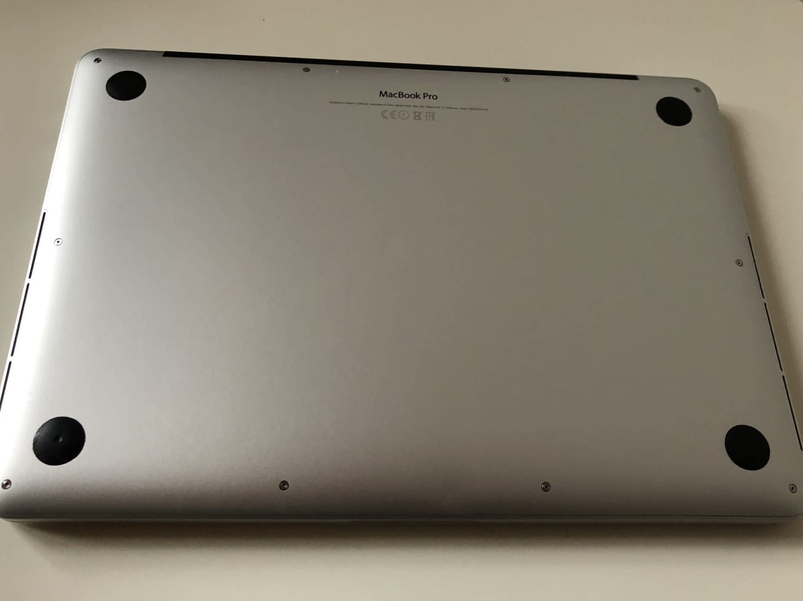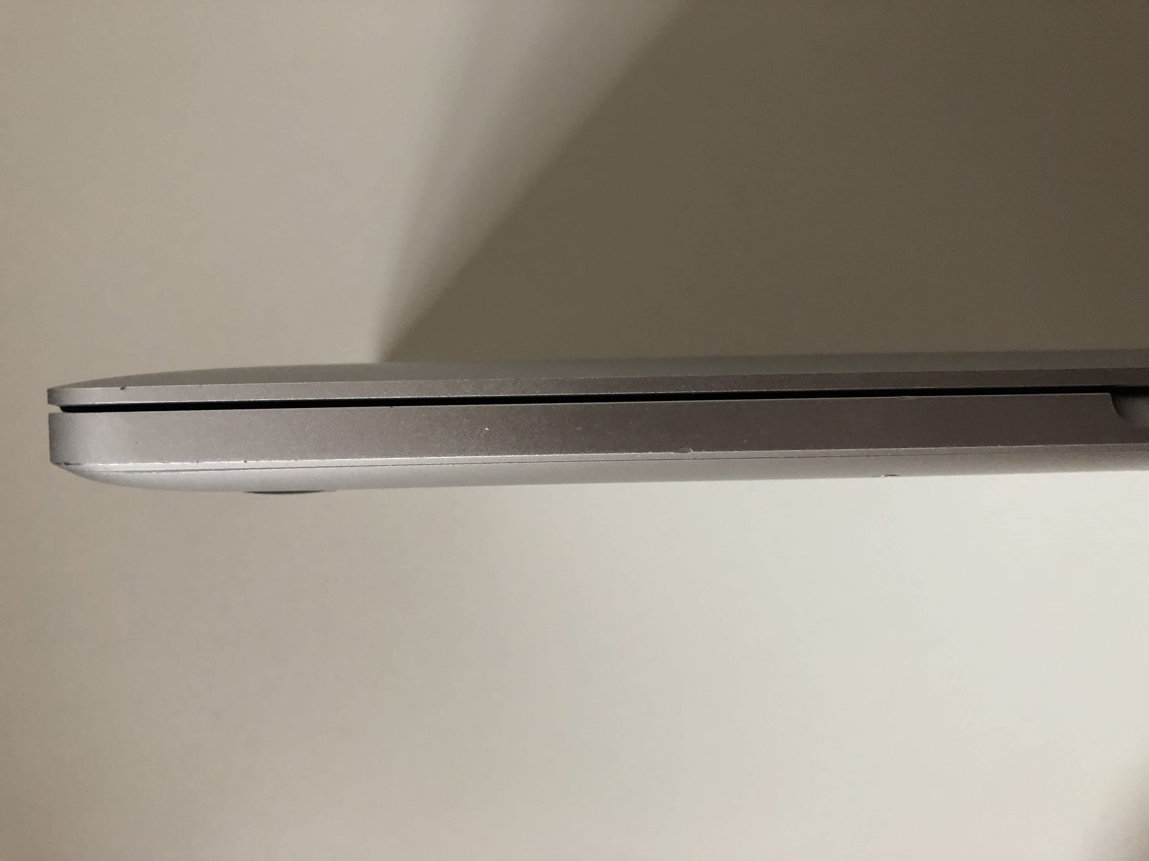 Baterie má 715 cyklů. MacBook mi nikdy nespadl, má pouze vlásečnicové škrábance na okrajích a spodní straně šasi. Na spodní straně je malinká promáčlinka, viditelná pouze pod světlem. MacBook je kompletně vyčištěný od prachu.