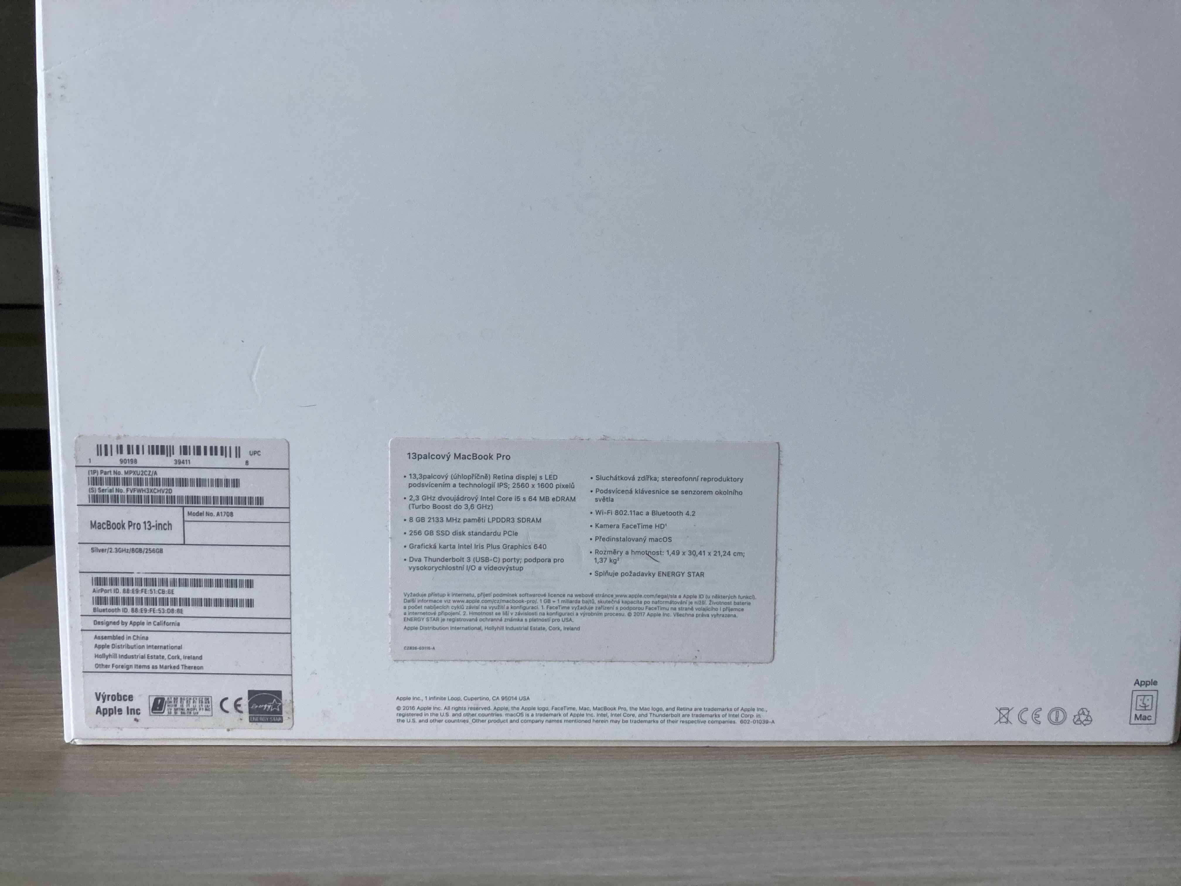 13 palcový macbook, retina display, procesor Intel i3 2.3GHz, 8GB RAM paměť, 256GB SSD pamět, grafika Intel Iris Plus 640, stříbrná barva, česká klávesnice.