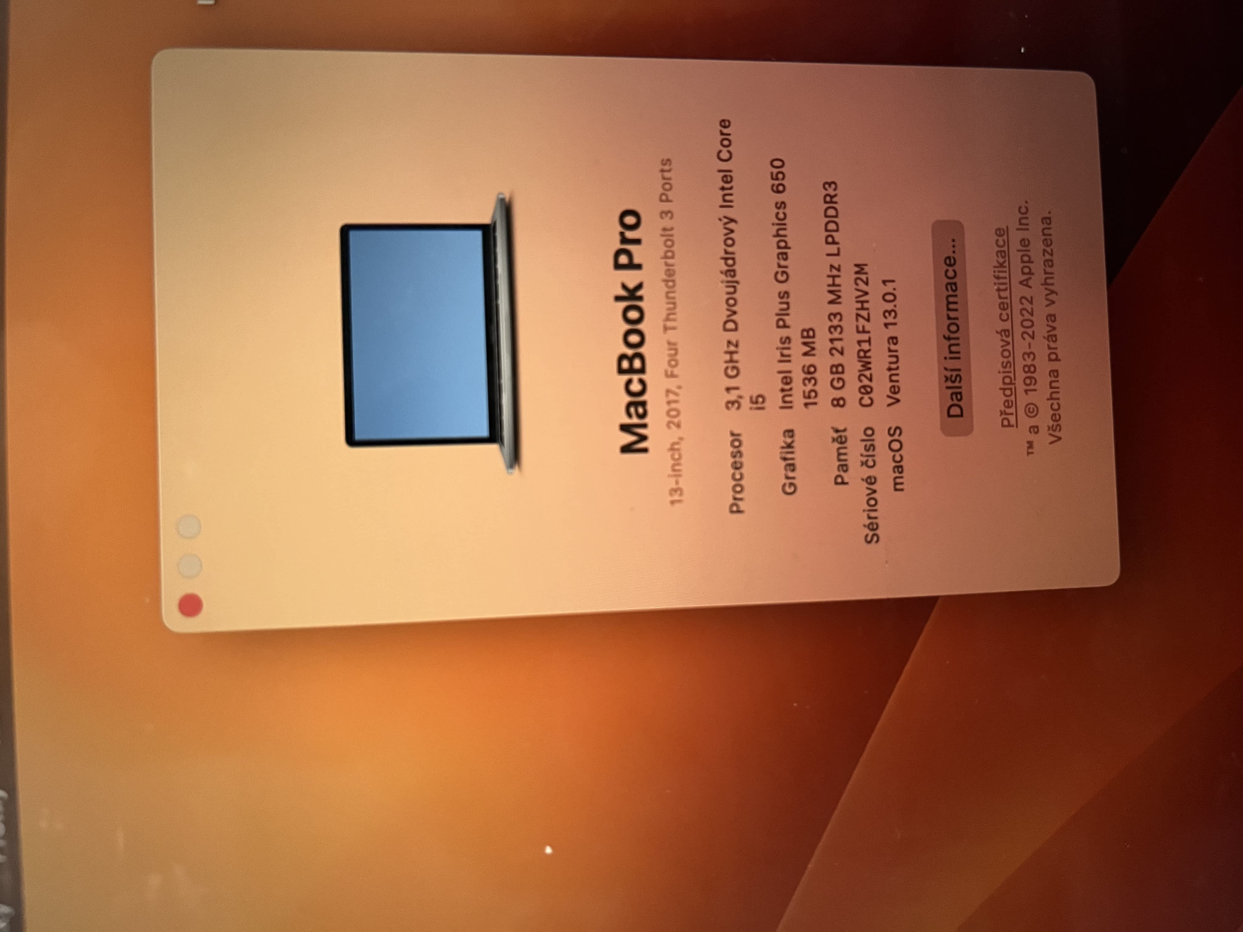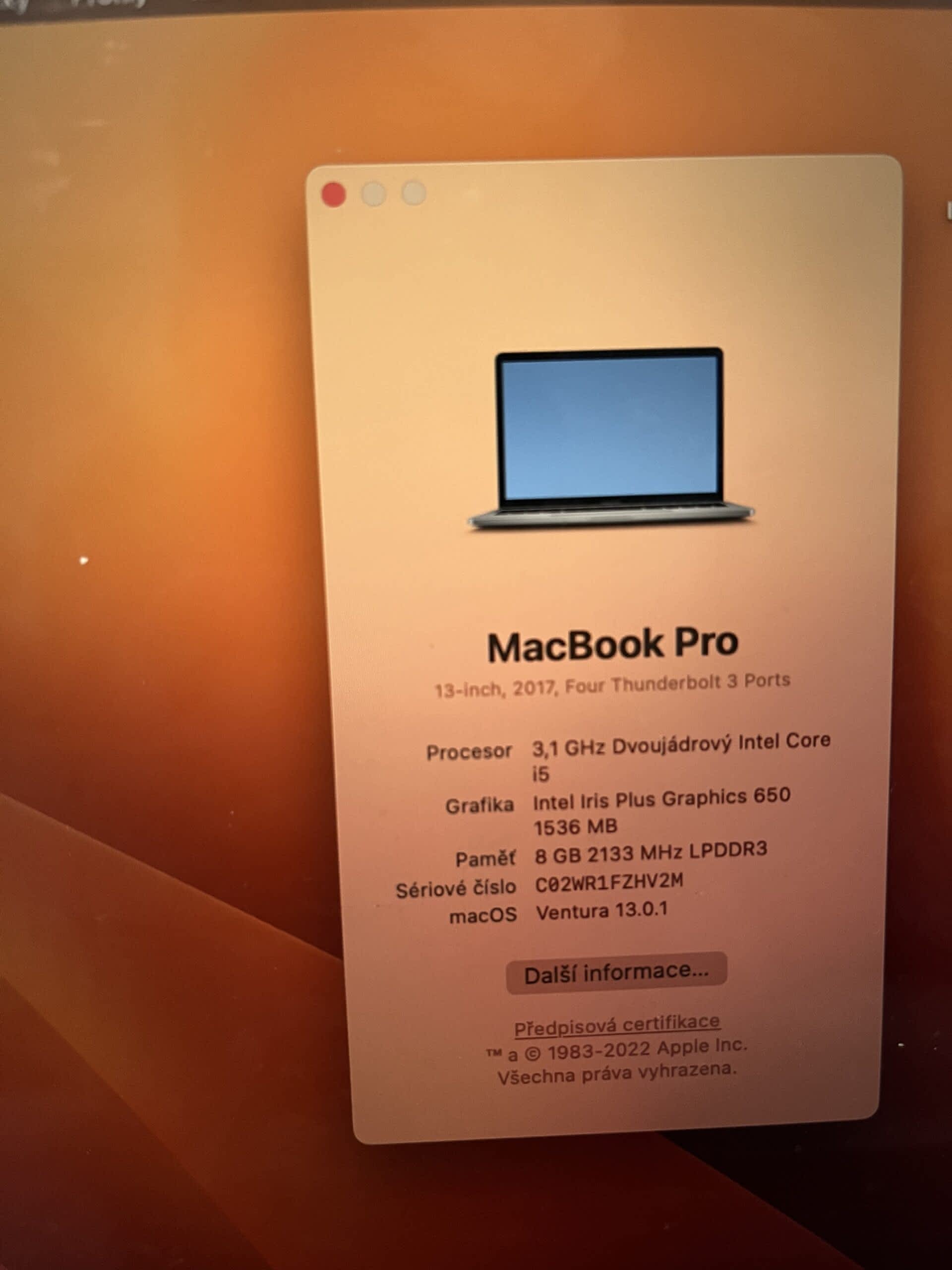 Prodám plně funkční Apple MacBook Pro 13,3” Touch Bar, 3,1 GHz, 8 GB, 512 GB, rok 2017.