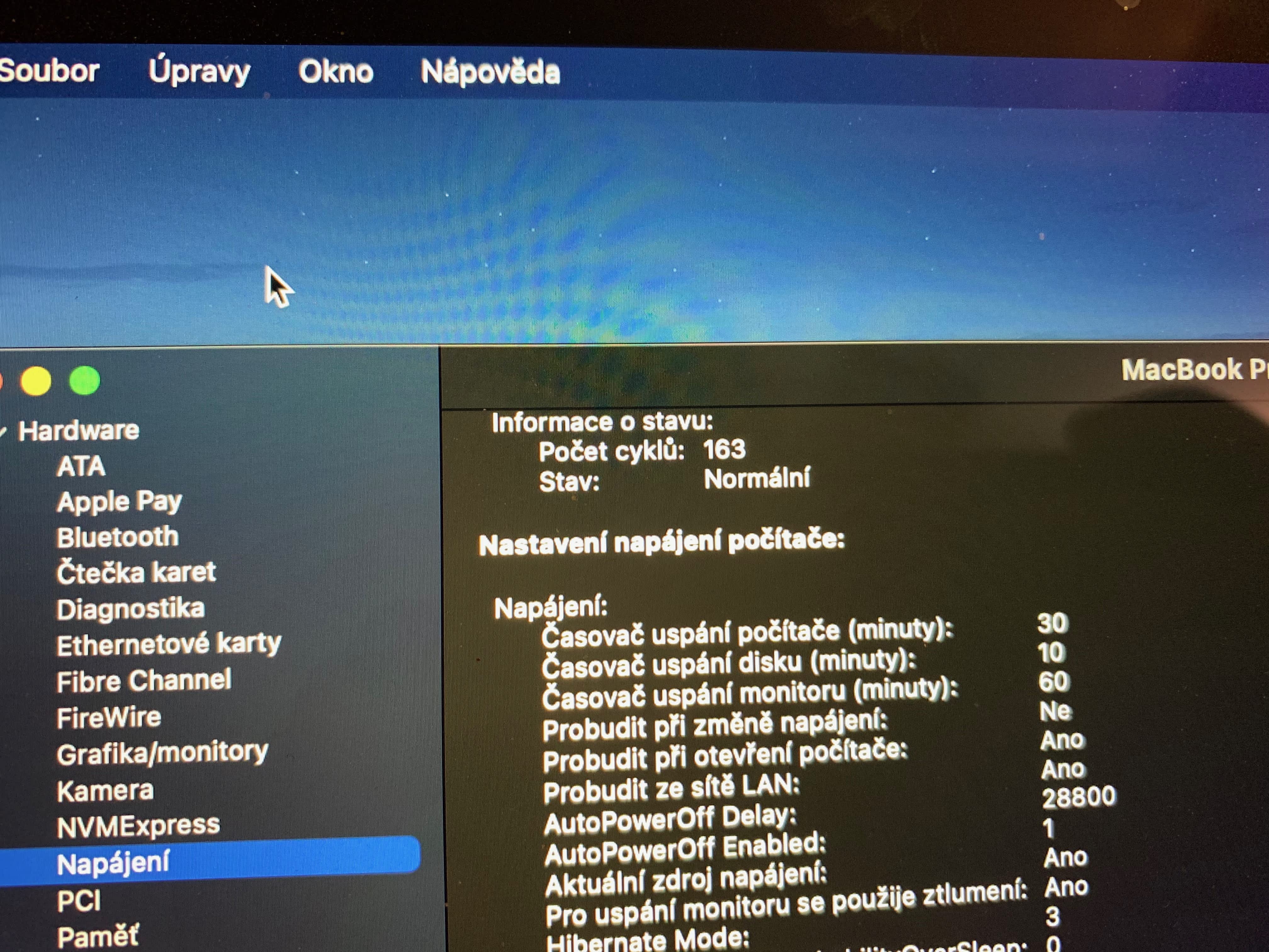 Notebook jsem kupoval 24. 2. 2017 v iWantu. V roce 2019 v rámci pozáručního servisu Apple vyměněna baterie a šasi notebooku. Baterie má celkově 163 cyklů – viz fotografie.