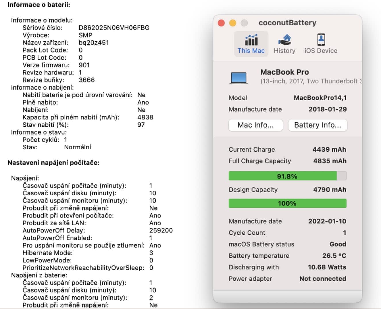 Macbook má novou baterku takže 1 cykl 100% – kapacita.