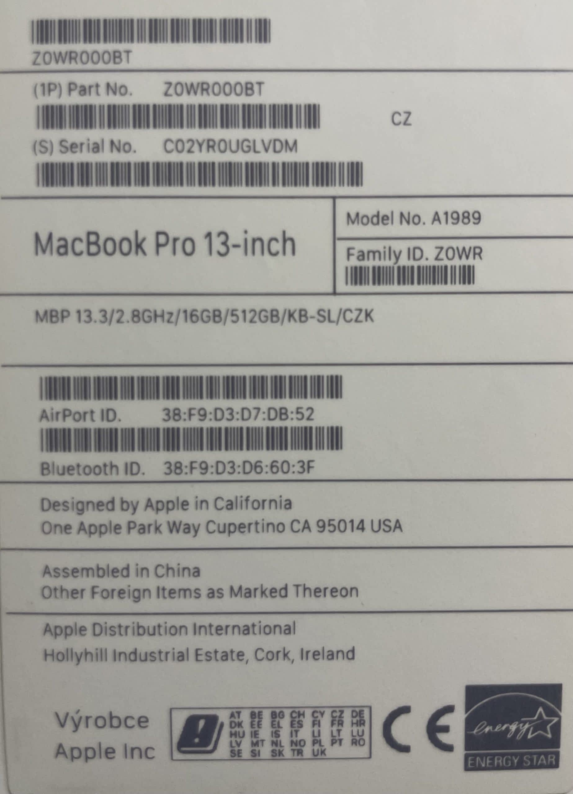 Podsvietená klávesnica, webkamera, USB-C, čítačka odtlačkov prstov, WiFi 5, MAC OS Monterey, Model No. A1989, komplet balenie vratanie krabice. Počet cyklov batérie 116. Všetko 100% funkčné. Kupované 04/2019, pôvodná cena 2800€