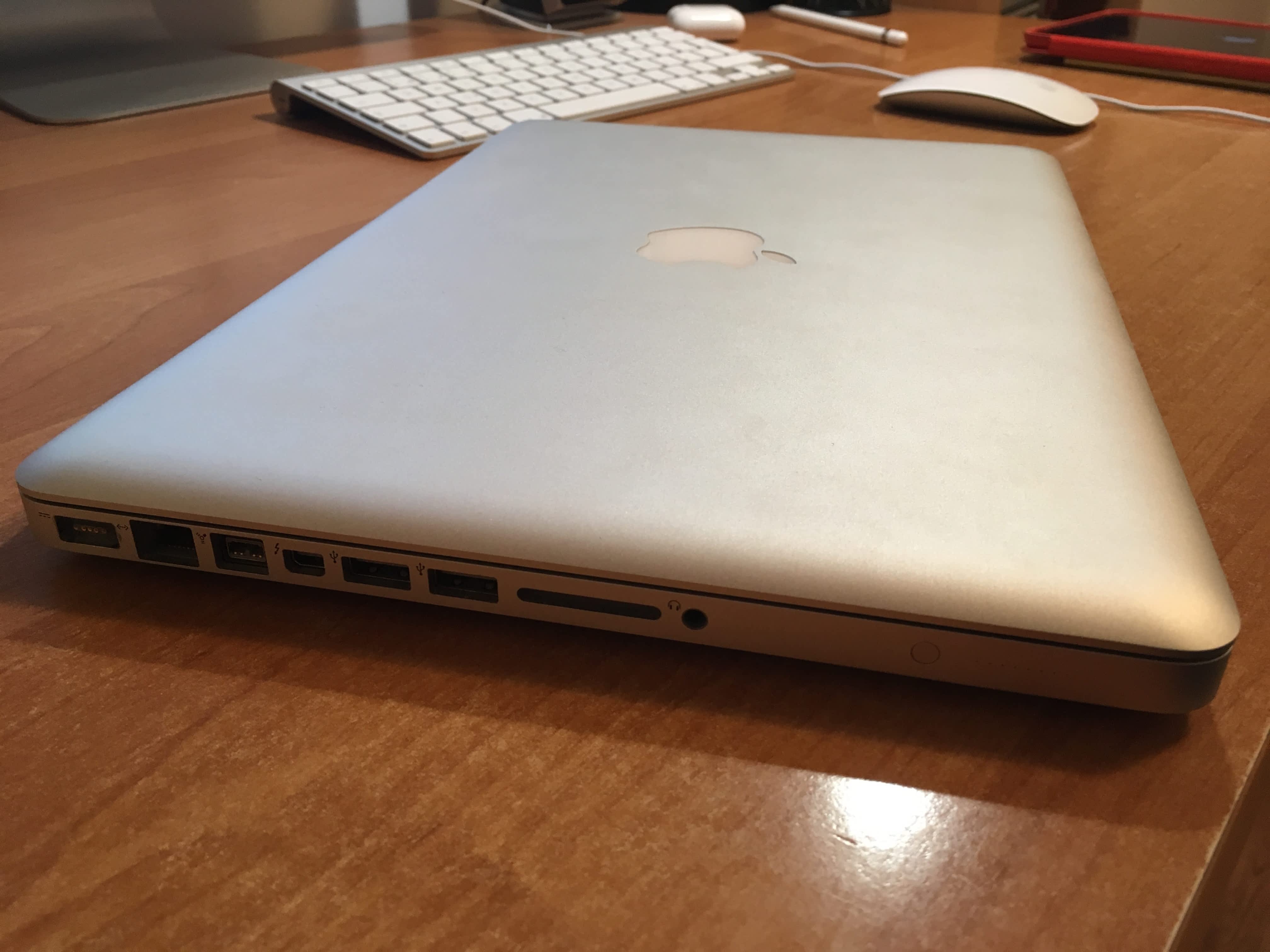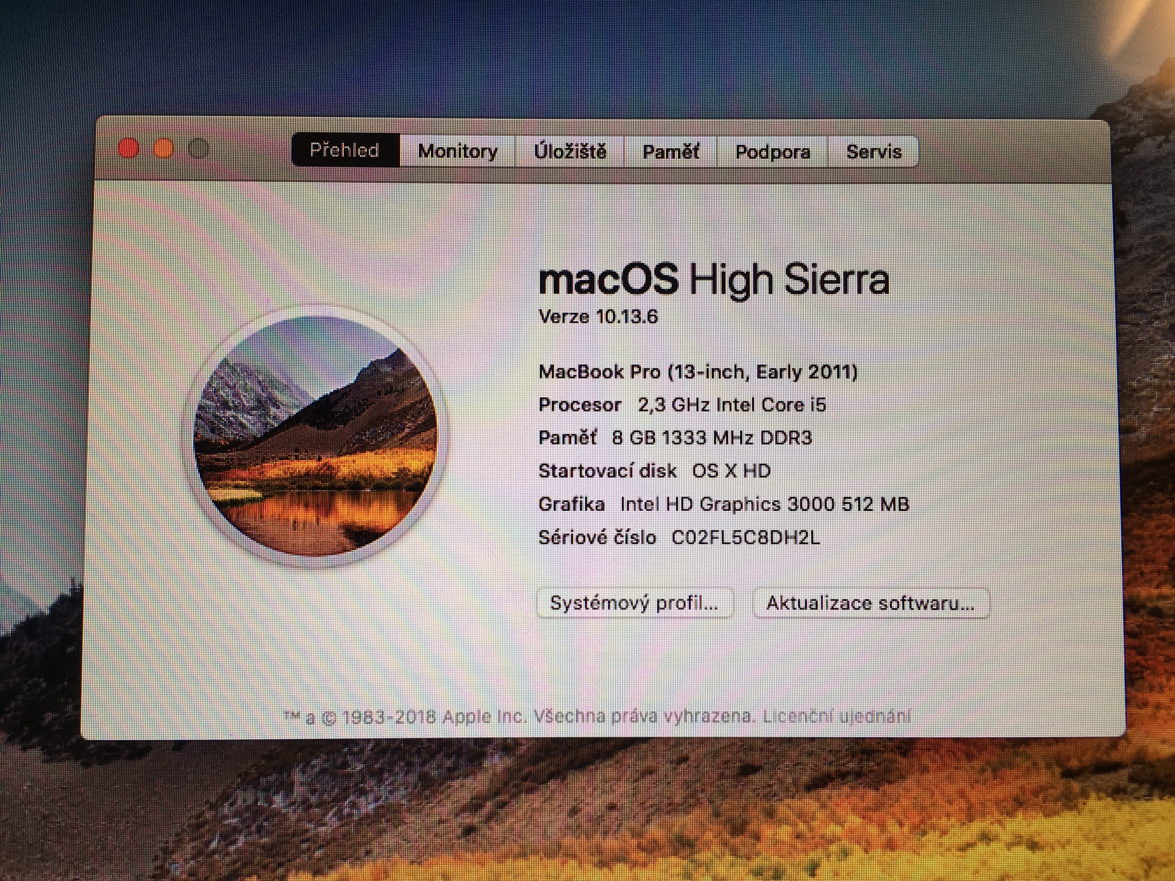 MacBook Pro 13, i5 2,3, 8 GB 1333 MHz DDR3, Intel HD 3000, 256 SSD Crucial M4 (čtení 500Mb/s, zápis 260 Mb/s,) , Hight Sierra (notebook je při používání naprosto plynulý), Používaný jen doma na stole. Bez odřenin nebo škrábanců. Po dvou letech byl měněný v autorizovaném servisu display (vadný pixel z výroby). Display nyní nemá vadné pixely a jakékoliv jiné poškození. Notebook byl poslední roky téměř nepoužívaný jen sem tam (pro udržení baterie v kondici…)z důvodu koupě nového notebooku. Baterie má 377 Cyklů (zdraví 80%) Vydrží cca 5 hodin práce. Vše funguje na 100%. Při rychlém jednání možná sleva