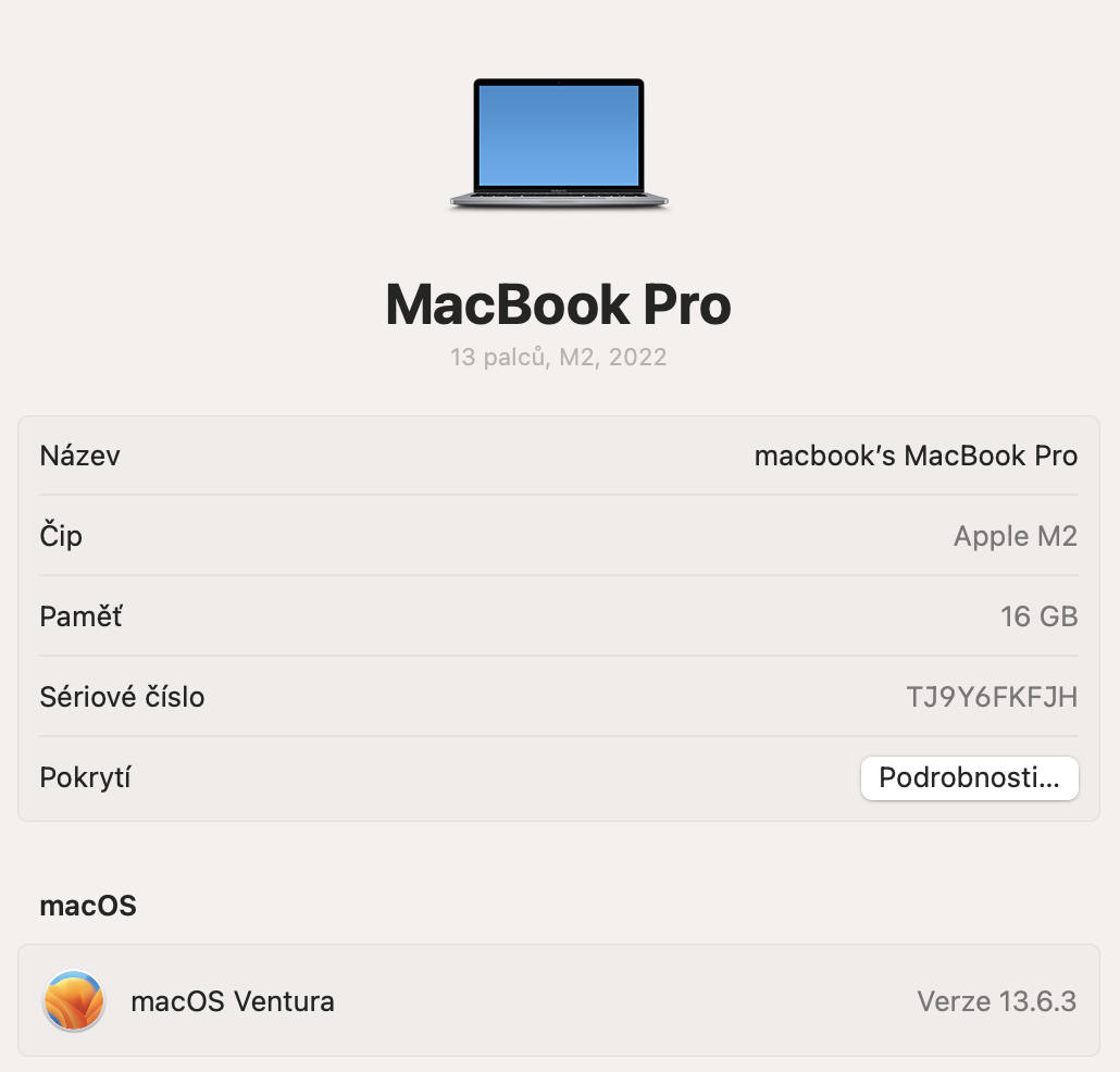 Macbook je zakoupen normálně u nás – česká klávesnice – je v záruce do 9/24.