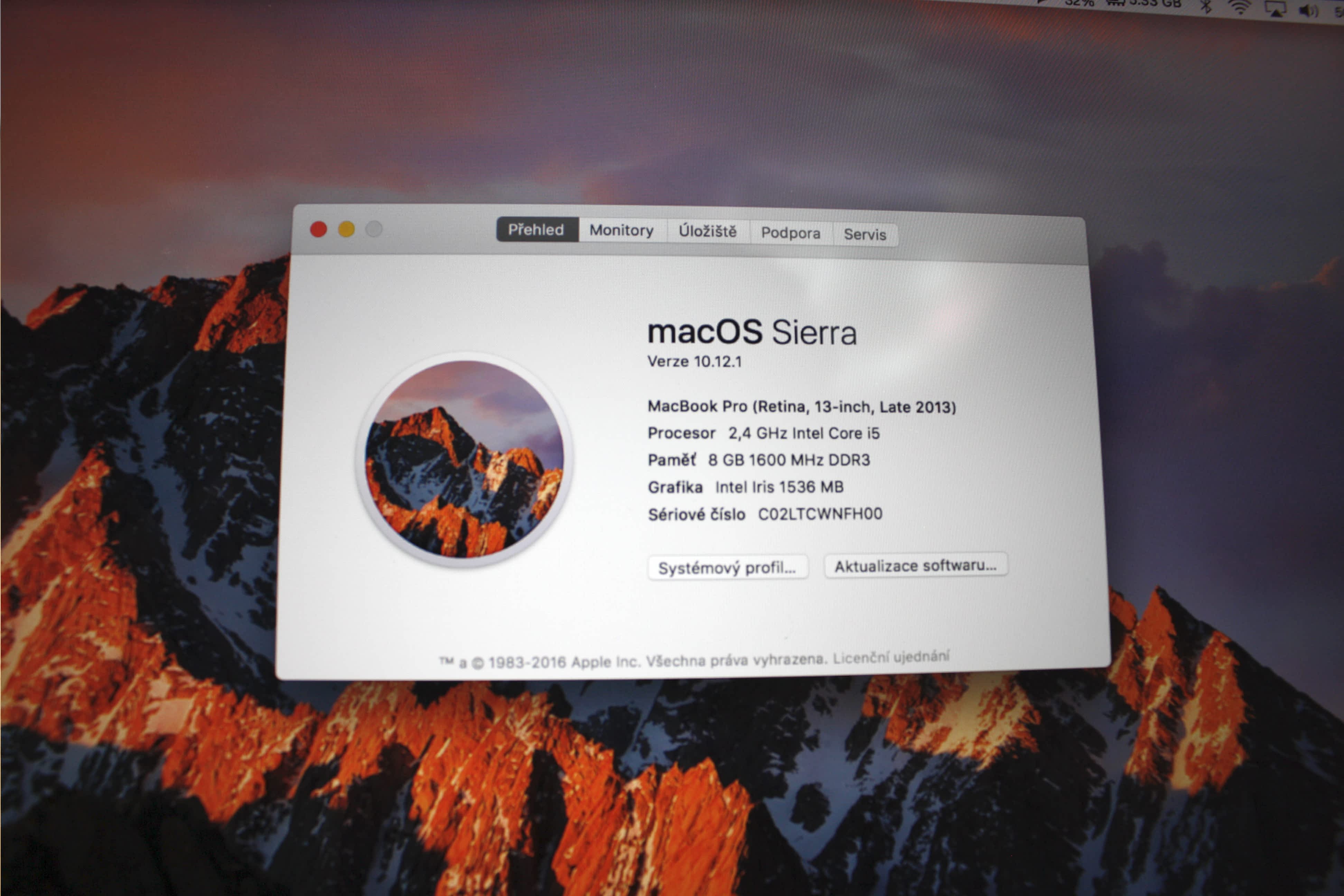 Macbook Pro 13 Retina, Late 2013, 8GB RAM, 25 Procesor: Intel Core i5 2.4GHz Grafická karta: Intel Iris 1536 MB RAM: 8GB 1600 MHz DDR3 SSD: 256GB Rok: Late 2013 Cyklů nabíjení: 224 Příslušenství: originální krabice, nabíječka (i s delším kabelem), manuál v češtině, samolepky Veškeré fotky jsou autentické. Stav 9 z 10, skoro jako nový. Možnost osobního odběru v Praze, nebo po domluvě odeslání na dobírku.