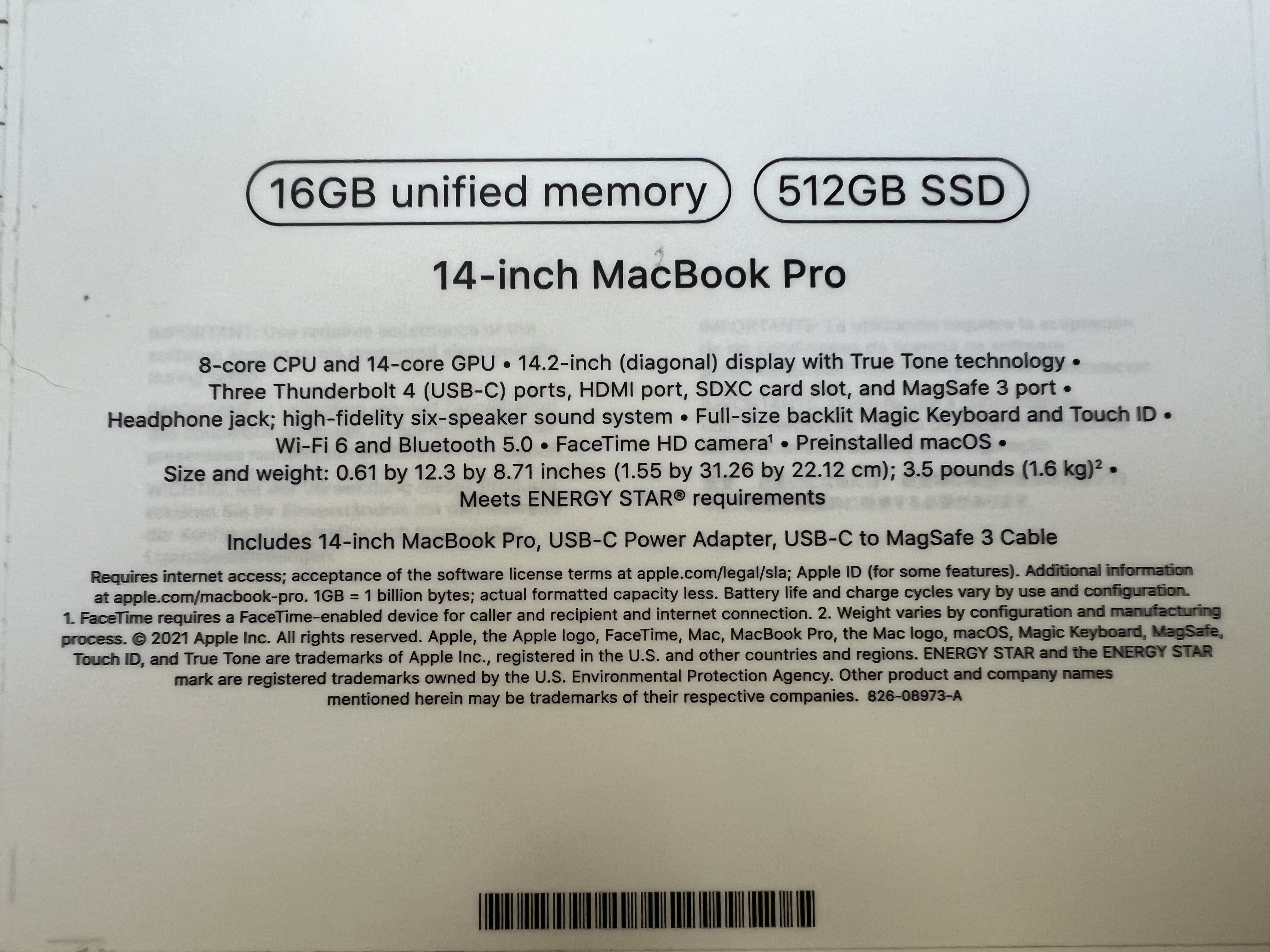 Specifikace: Liquid Retina XDR lesklý 3024 × 1964 120Hz, RAM 16GB, Apple M1 PRO 14jádrová GPU, SSD 512GB, podsvícená klávesnice, webkamera, USB-C, čtečka otisků prstů, WiFi 6, Hmotnost 1,6 kg, macOS