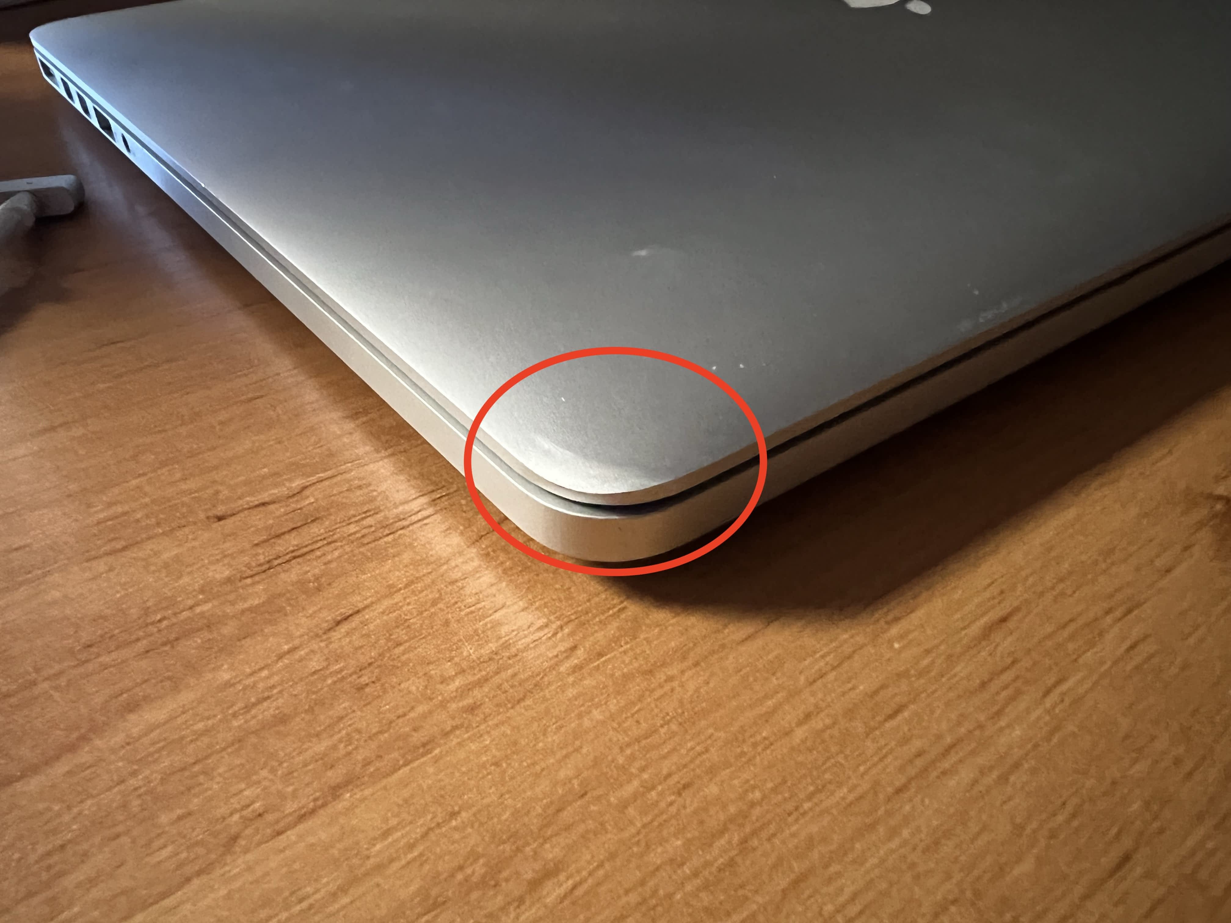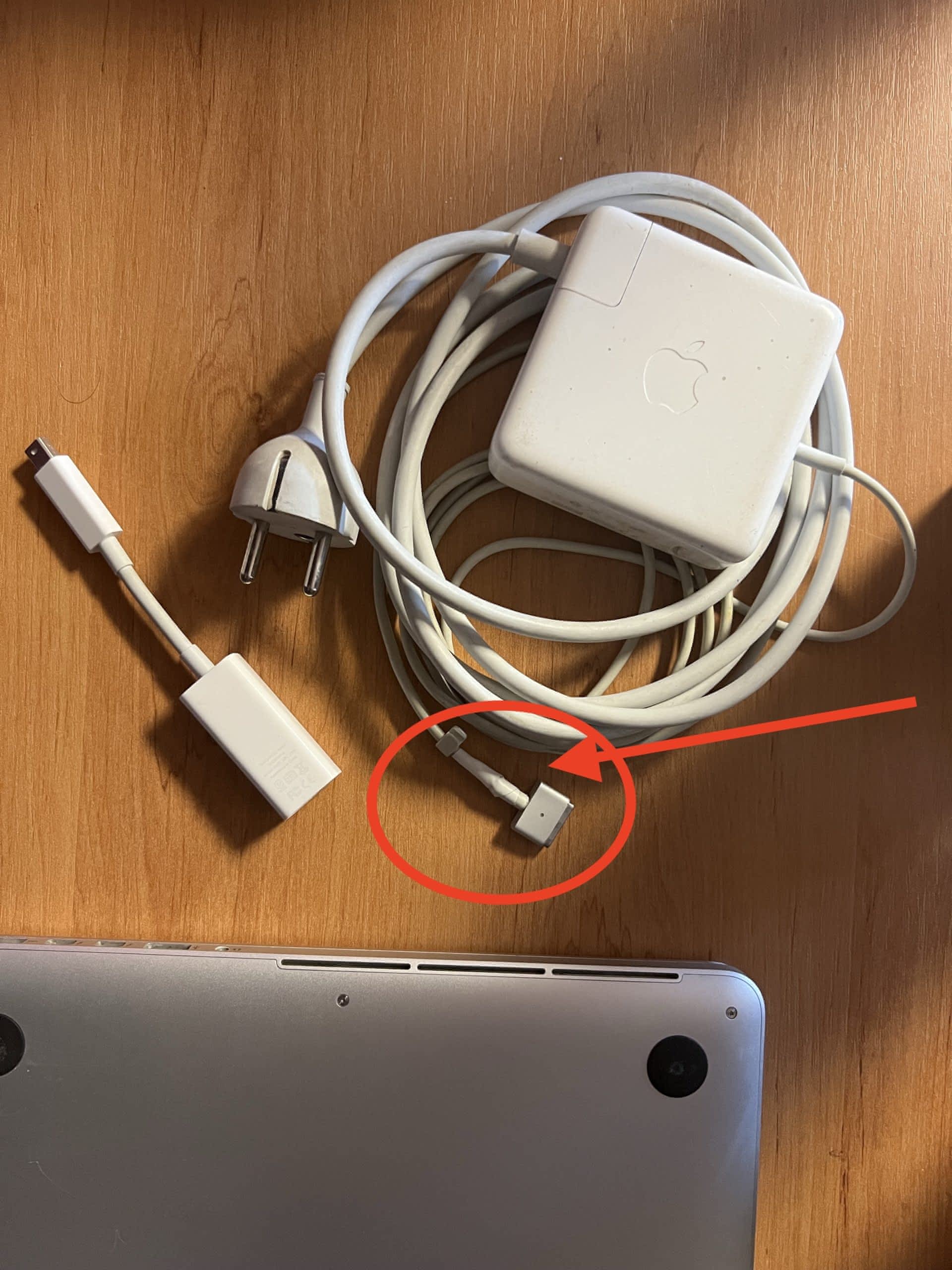 Adaptér napájení má opravovaný kabel, roztřepaná bužírka. (Foto), Spodní strana macbooku obsahuje škrábanců.