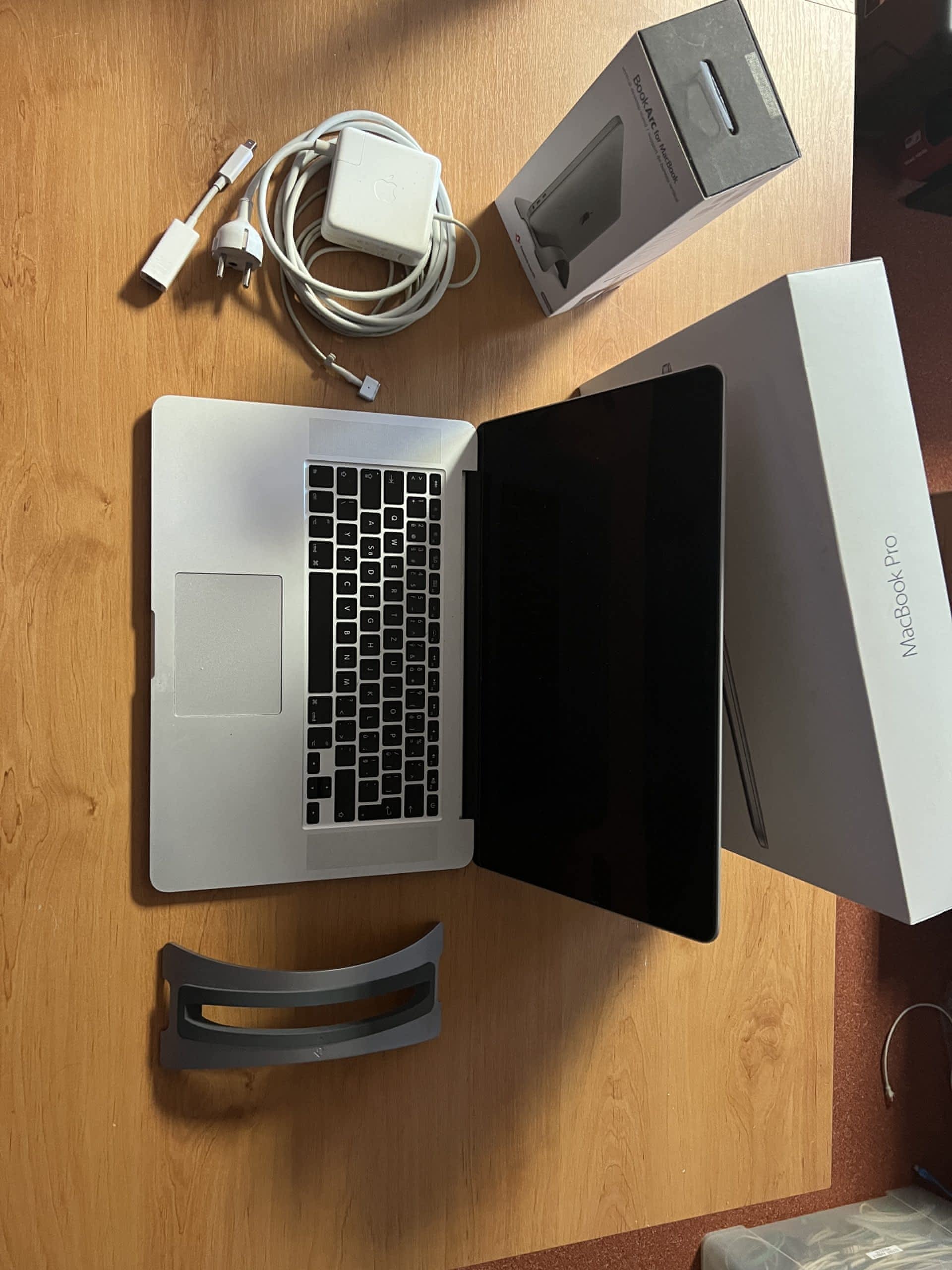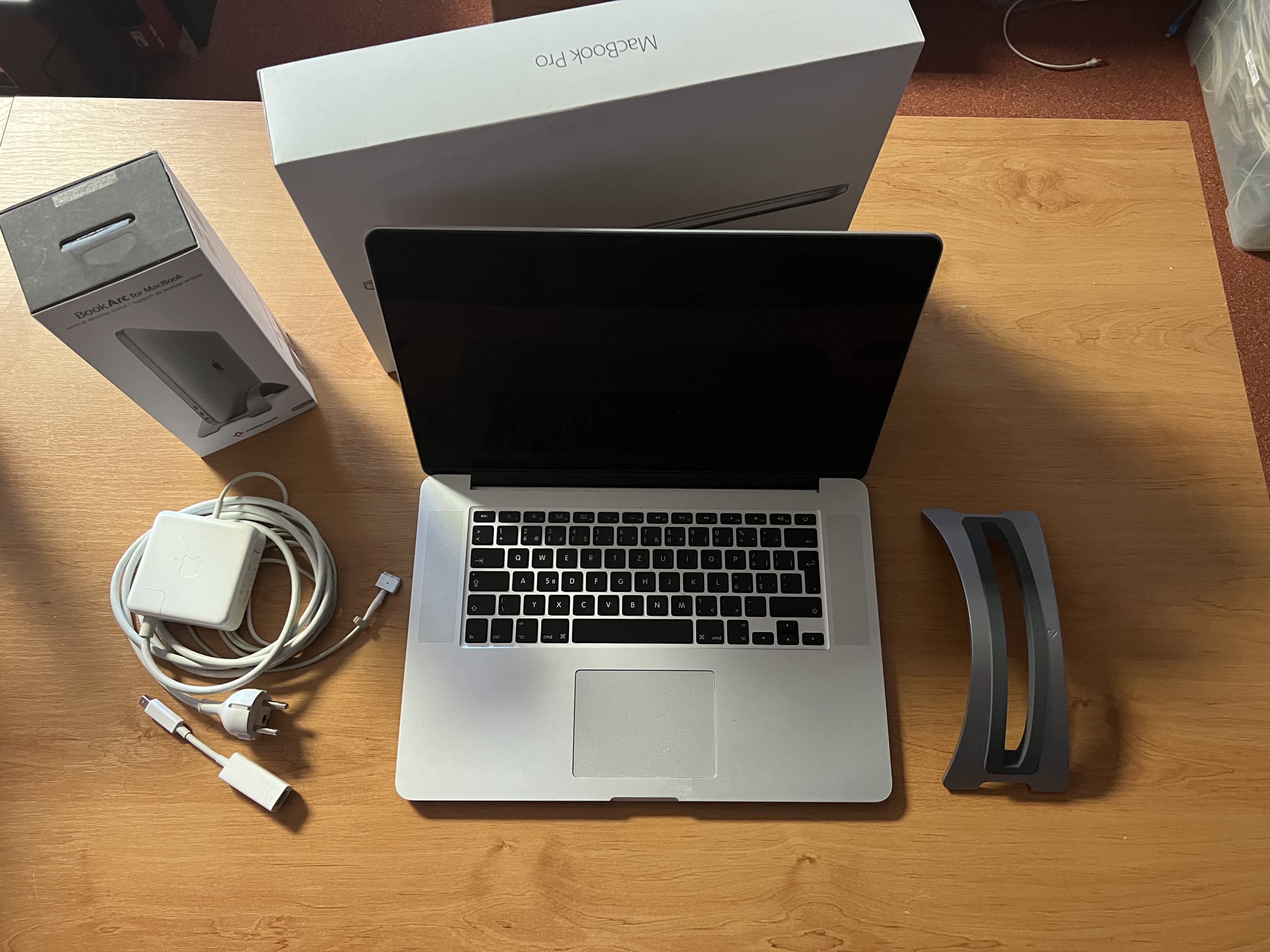 Součástí nabídky je MacBook Pro 15“2015, Adapter, krabice, VGA redukce, ETH redukce, stojánek Book Arc 12 twelve south (foto)